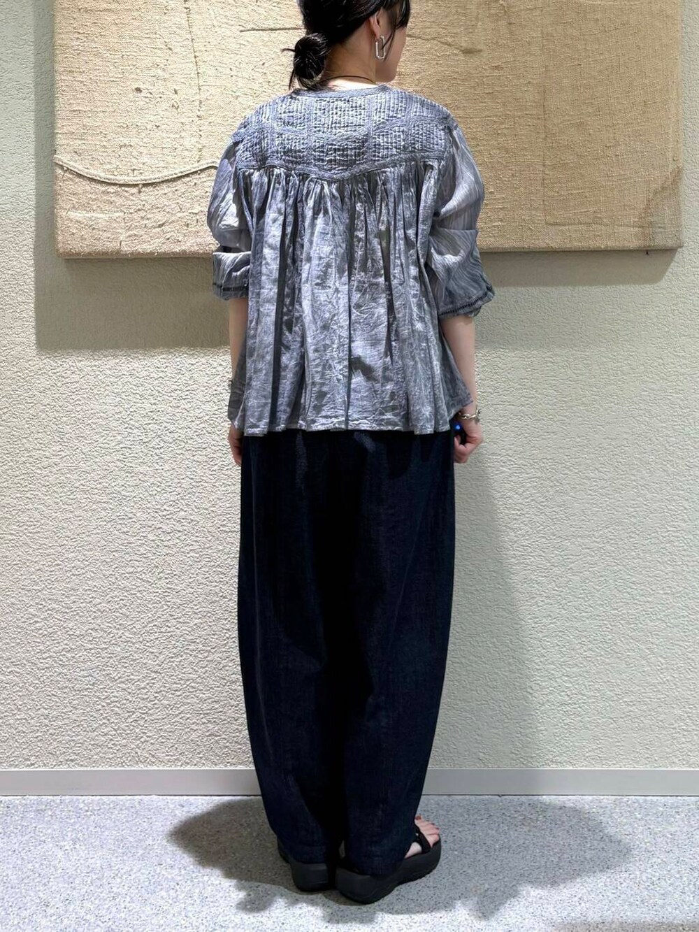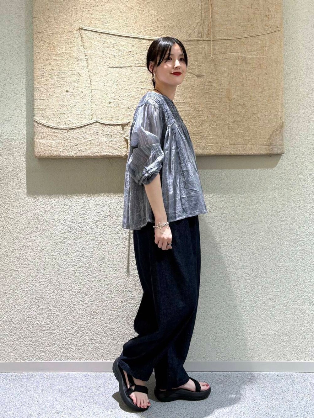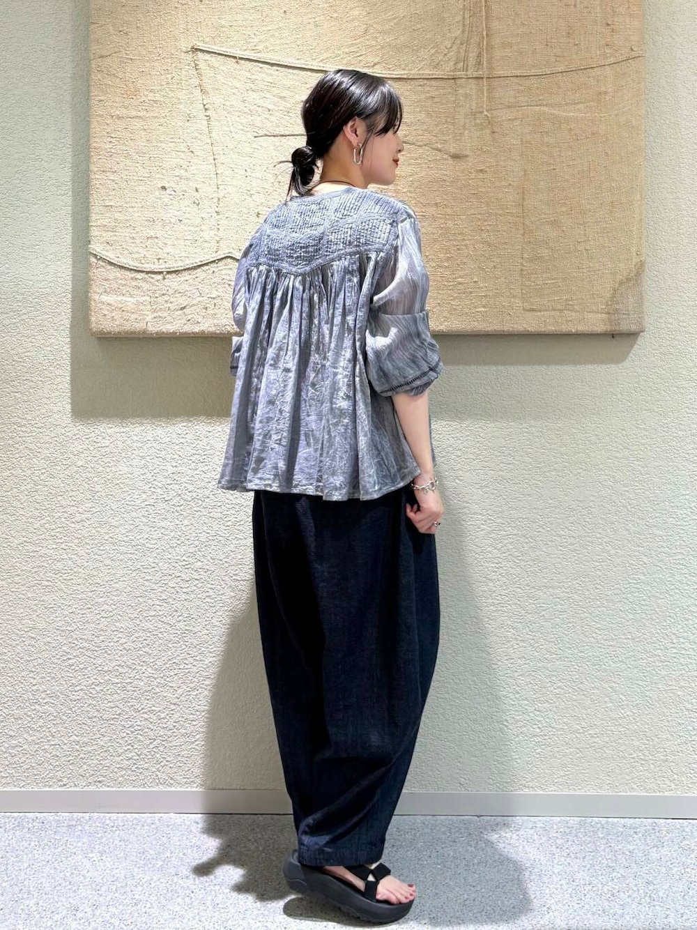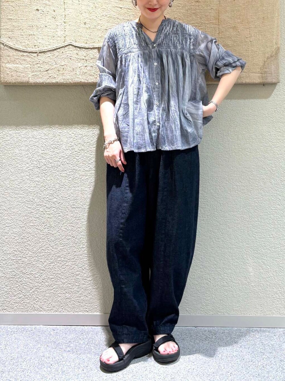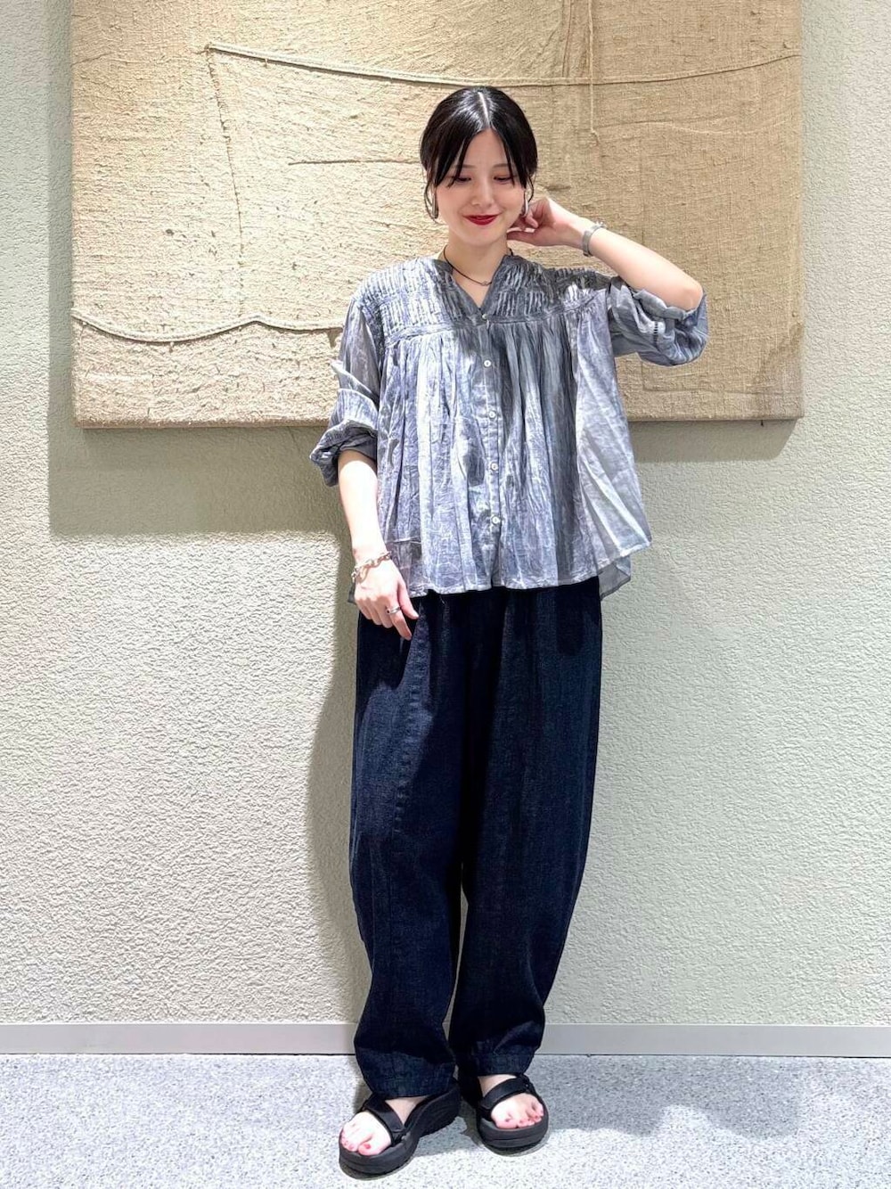 合わせたボトムスは、デニムボリュームパンツ〈INDIGO〉。ワイドながら落ち感のある柔らかなデニム素材で、下半身のボリュームをうまくカバー。ウエストはすっきりとしたデザインで、身長158cmでも重たく見えない軽やかな丈感で、足元にはフラットシューズやサンダルを合わせても好バランス。