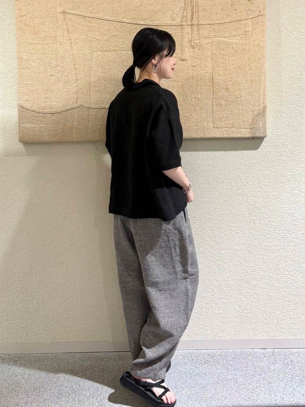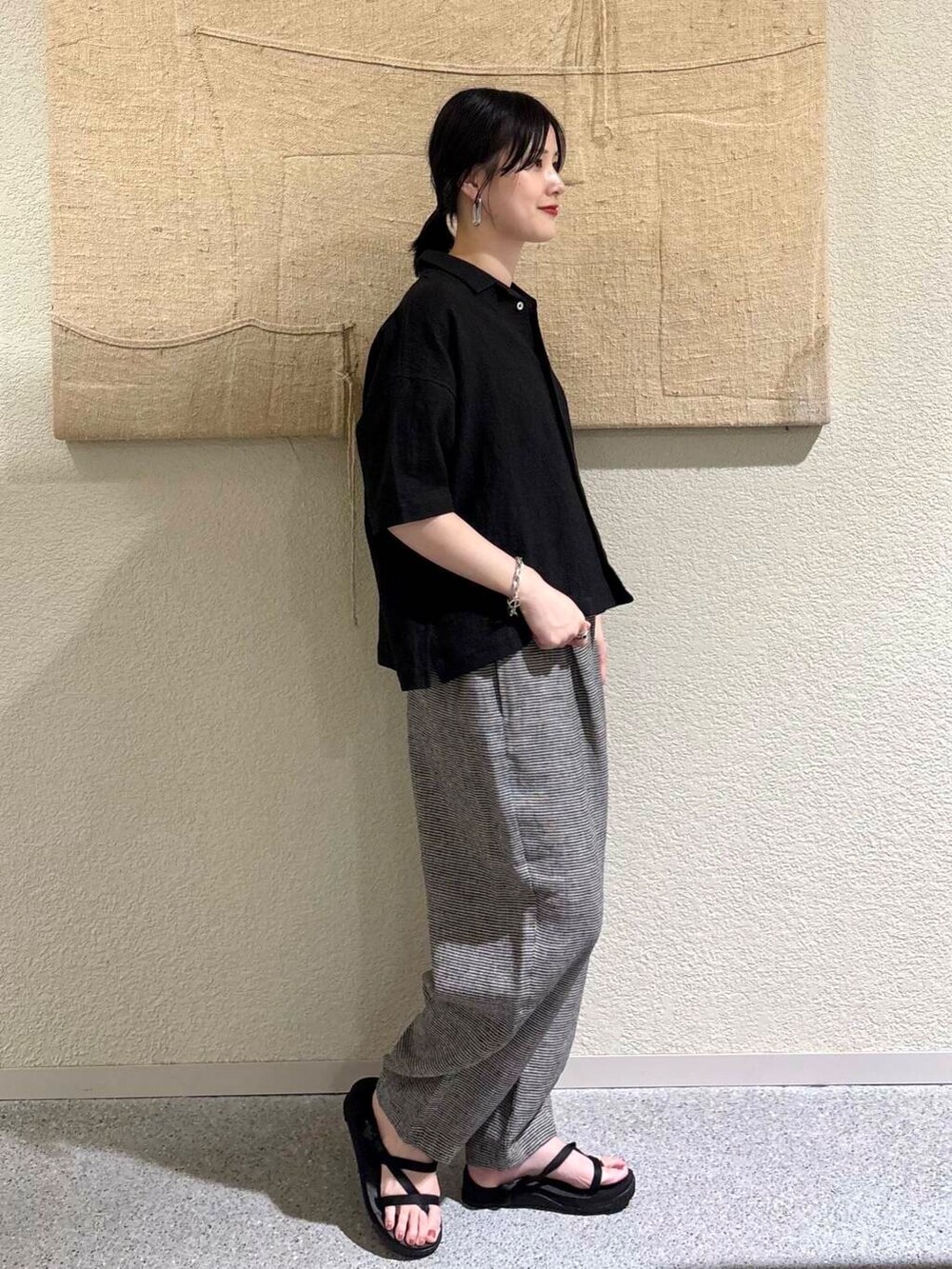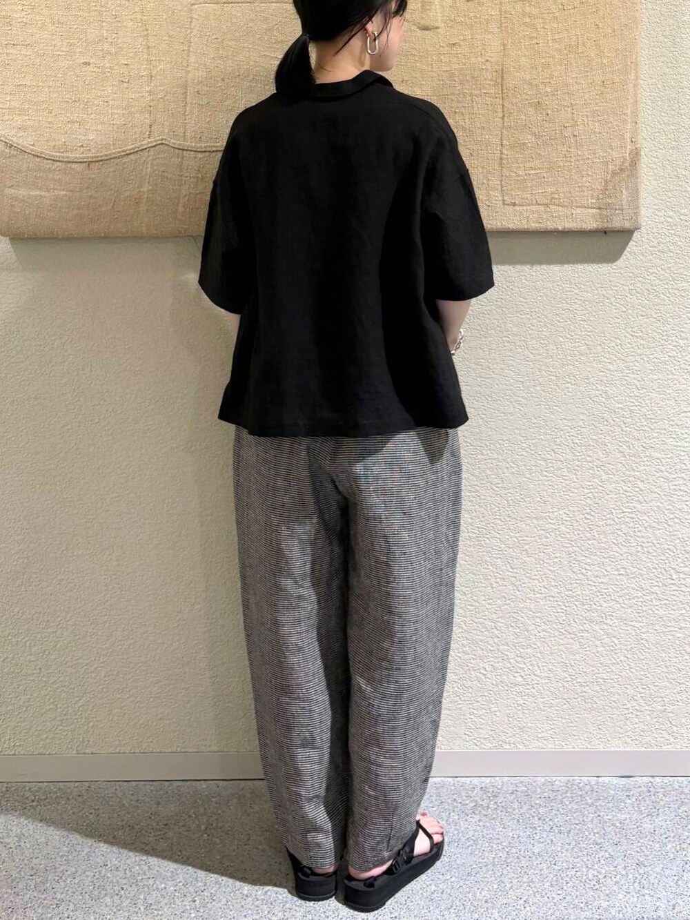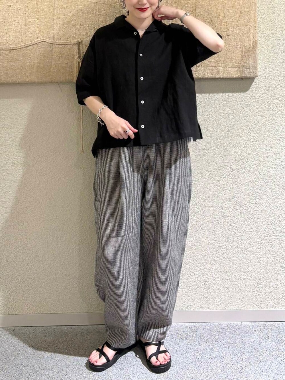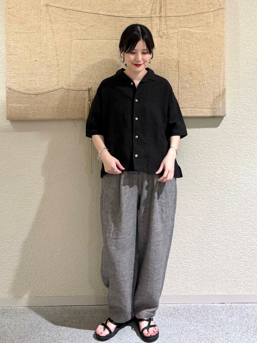 リネンラミーオープンカラーシャツ〈BLACK〉は、ドライな質感が特徴の一枚。リネン×ラミーの天然素材ならではの軽やかさが、湿度の高い時期でも涼やかな着心地を叶えてくれます。程よく開いたオープンカラーが首元をすっきり見せ、158cmの身長でもバランスよく決まる丈感。全体にコンパクトなサイジングで、前を開けて羽織としても、ボタンを留めてトップスとしても活躍。