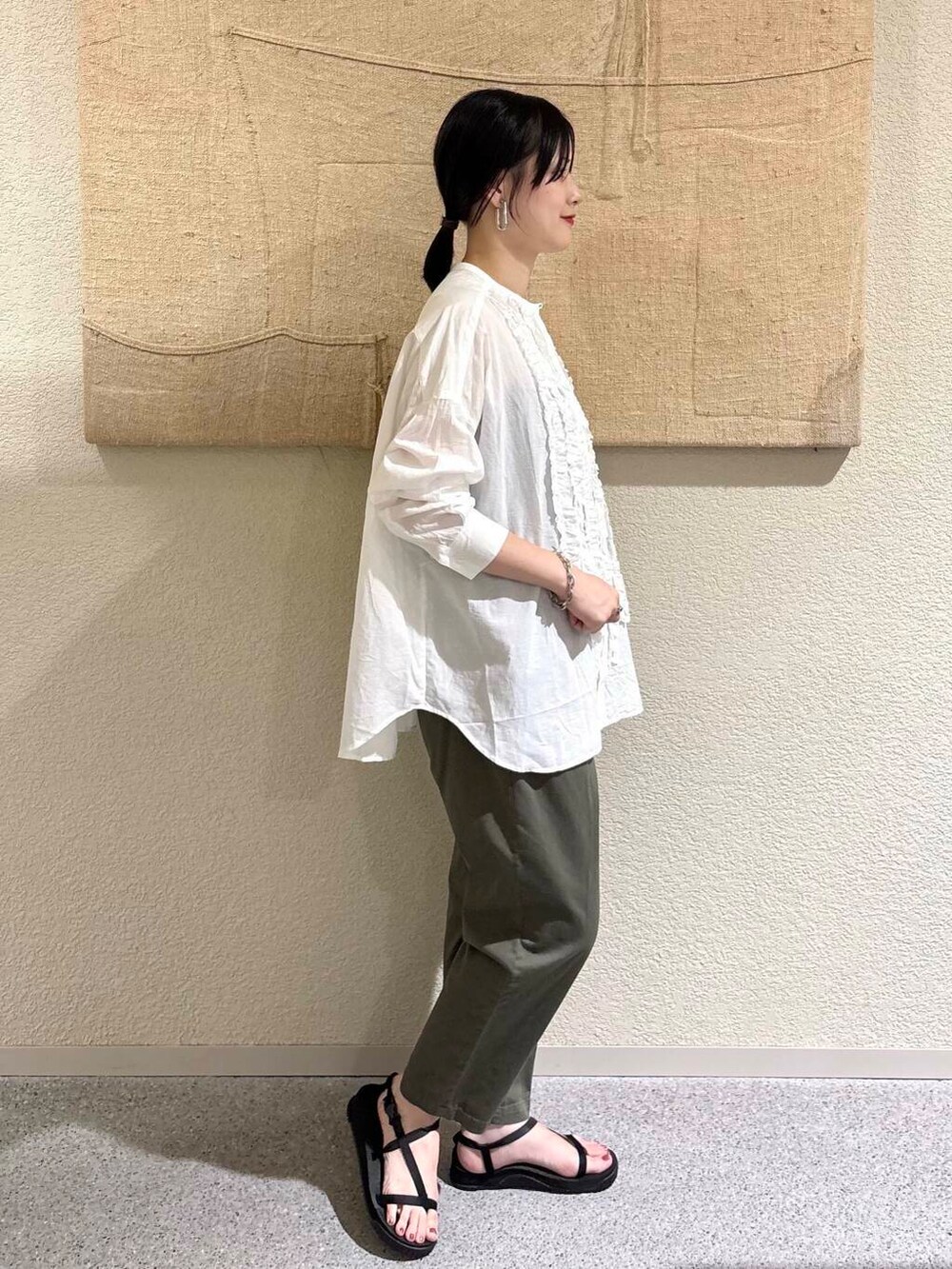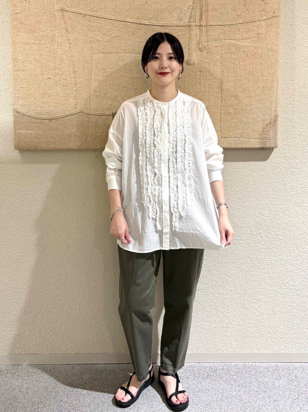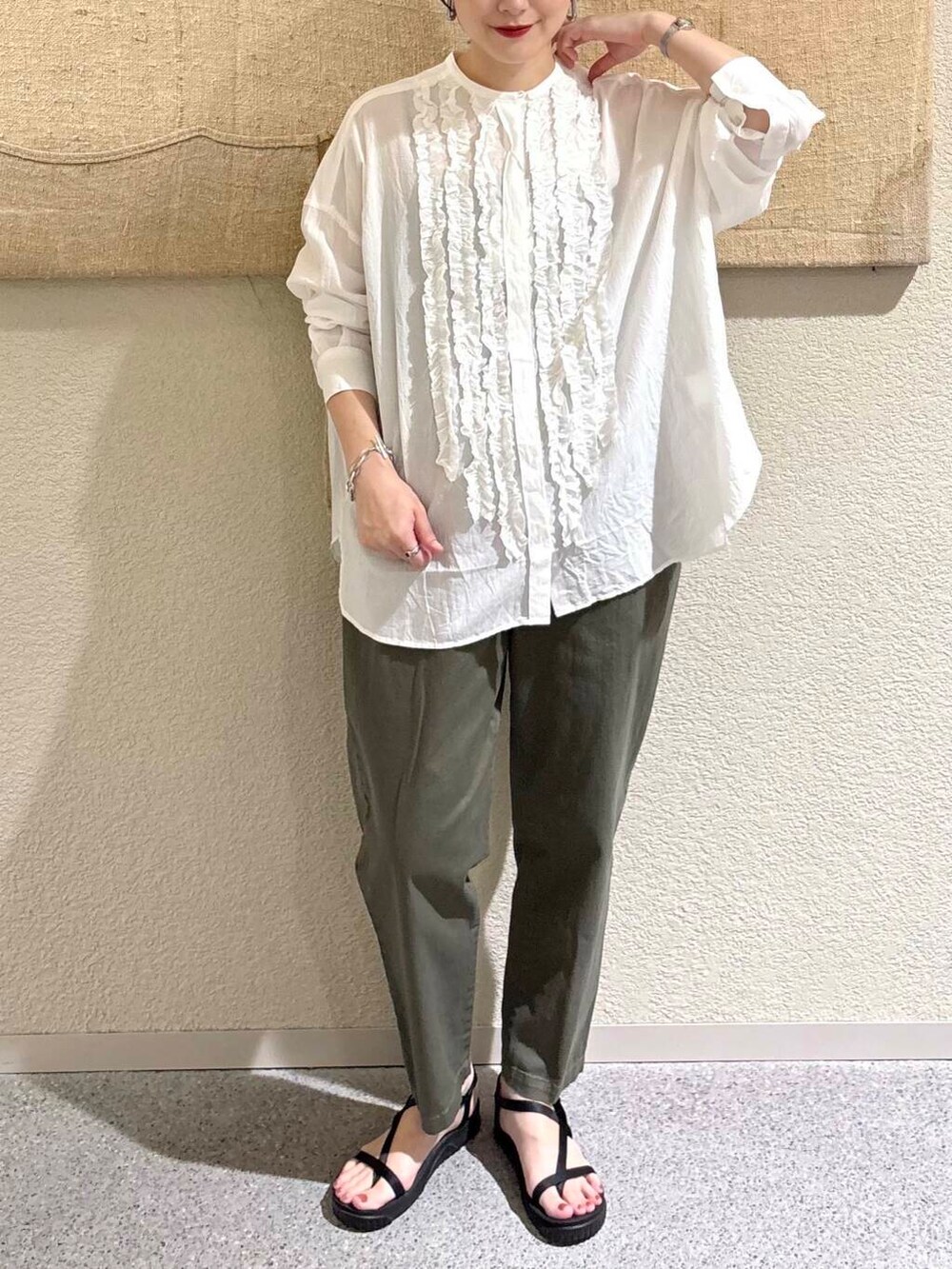 • フリル×カーキで甘辛バランスの取れた大人カジュアルに