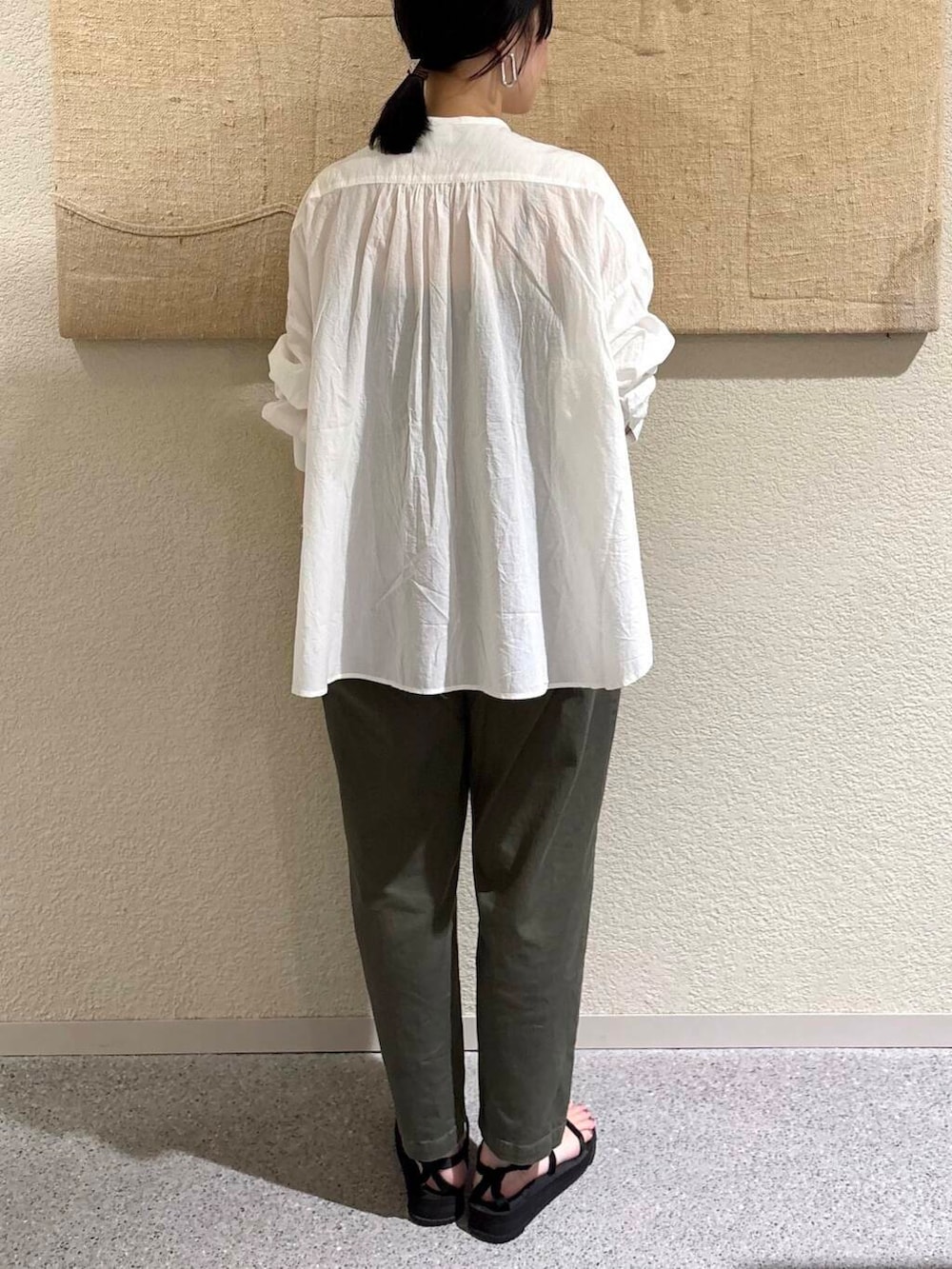身幅はゆったりめですが、柔らかく軽い生地が体に沿うため、上半身にもなじみやすく、着膨れせずに着られるバランス感。オフホワイトは肌をパッと明るく見せてくれます。