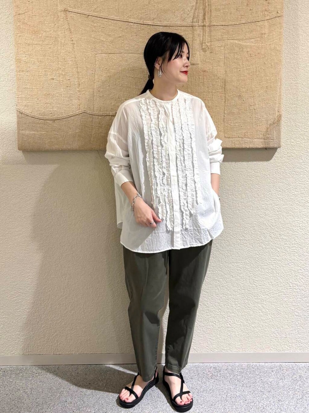 コットンワッシャーフリルワイドシャツ〈OFF〉は、程よく甘さを加えたフリルデザインが印象的な一枚。ワッシャー加工による自然なシワ感が、ナチュラルでこなれた雰囲気を演出します。