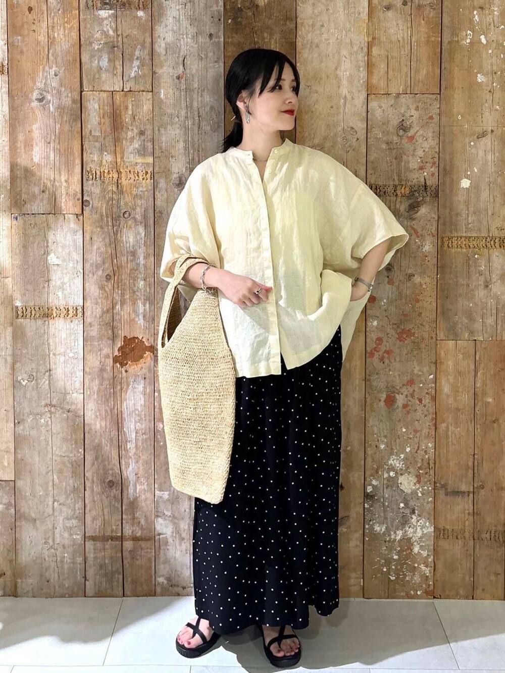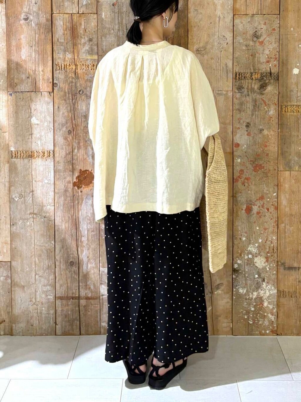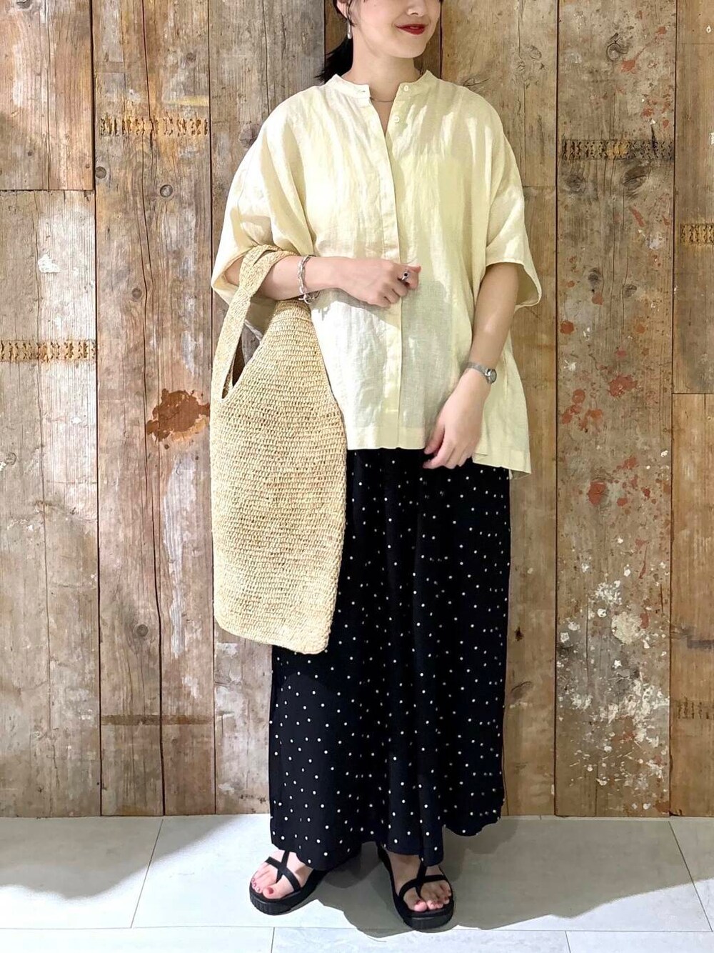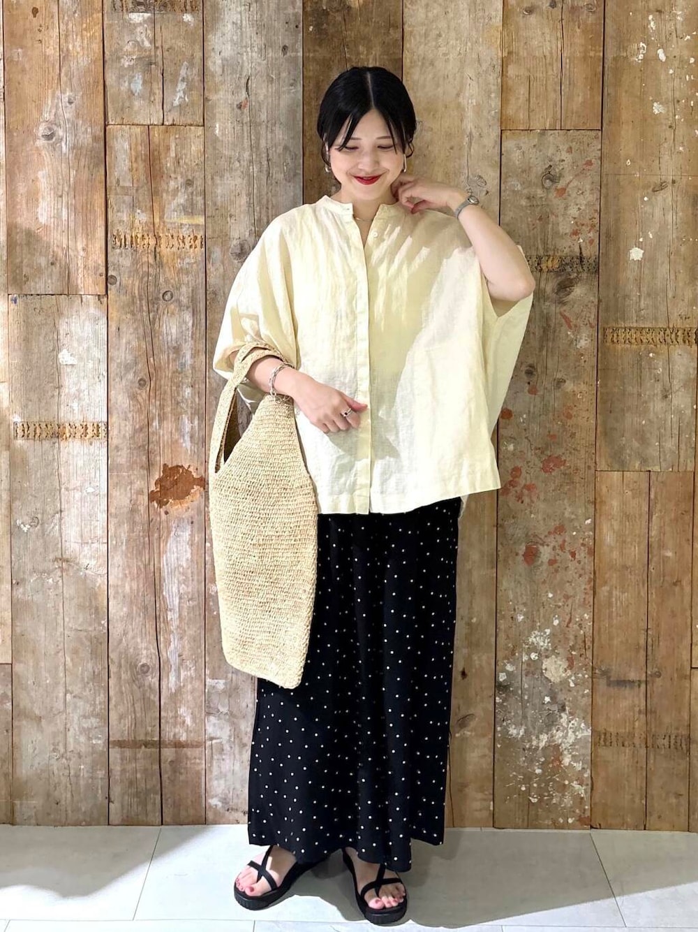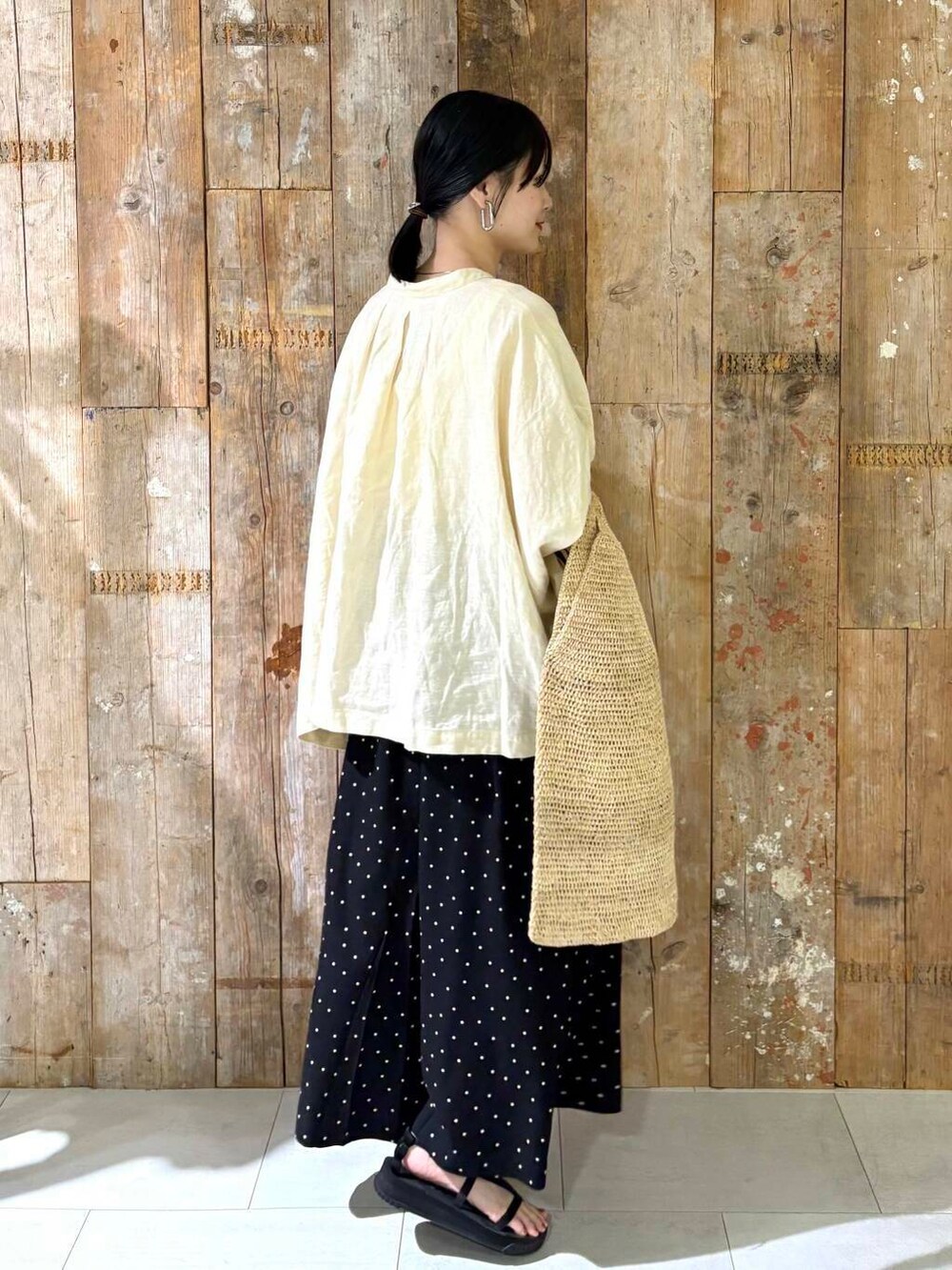 合わせたドットギャザーパンツ〈BLACK〉は、程よいギャザーとゆったりと穿けるシルエットで、リラックスしつつも上品に見える一着。小さめのドット柄が甘すぎず、イエローのシャツとのバランスをとってくれます。