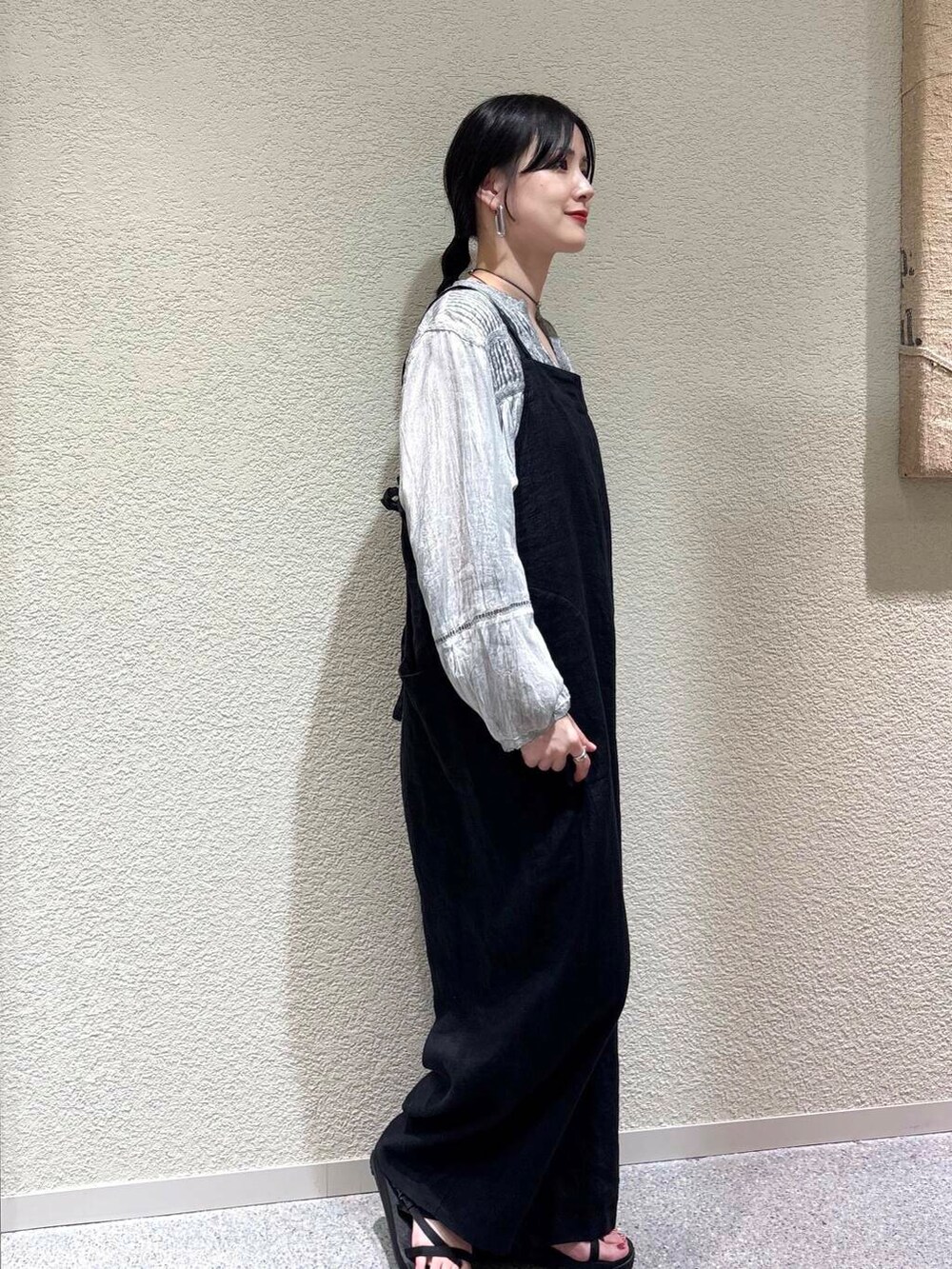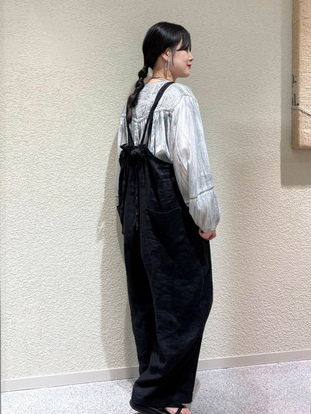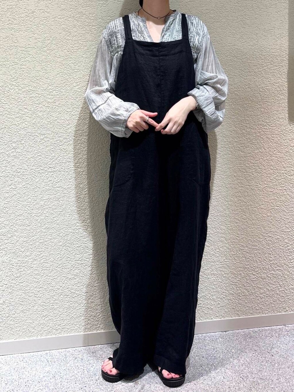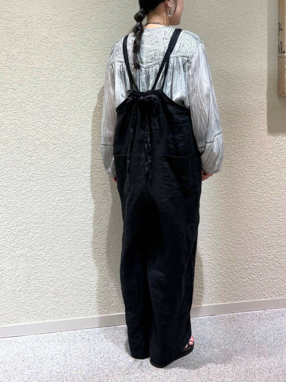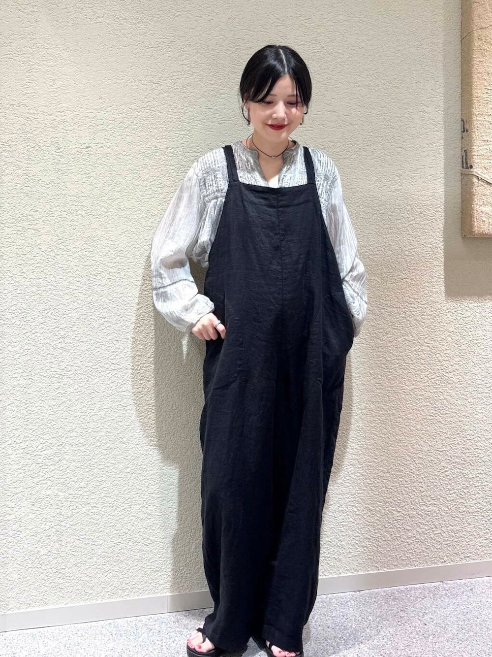 合わせたリネンサロペット〈BLACK〉は、ゆったりとしたシルエットと程よい抜け感で、大人のカジュアルスタイルにぴったりな一着。リネン素材がナチュラルな風合いを引き出し、ブラックでも重たくなりすぎず、夏でも心地よく着られます。