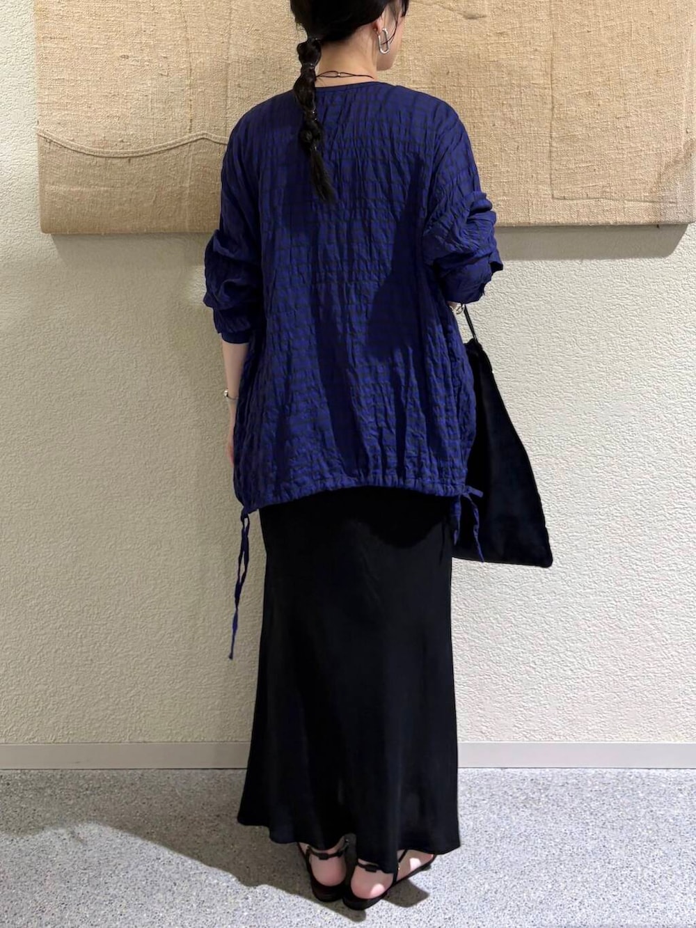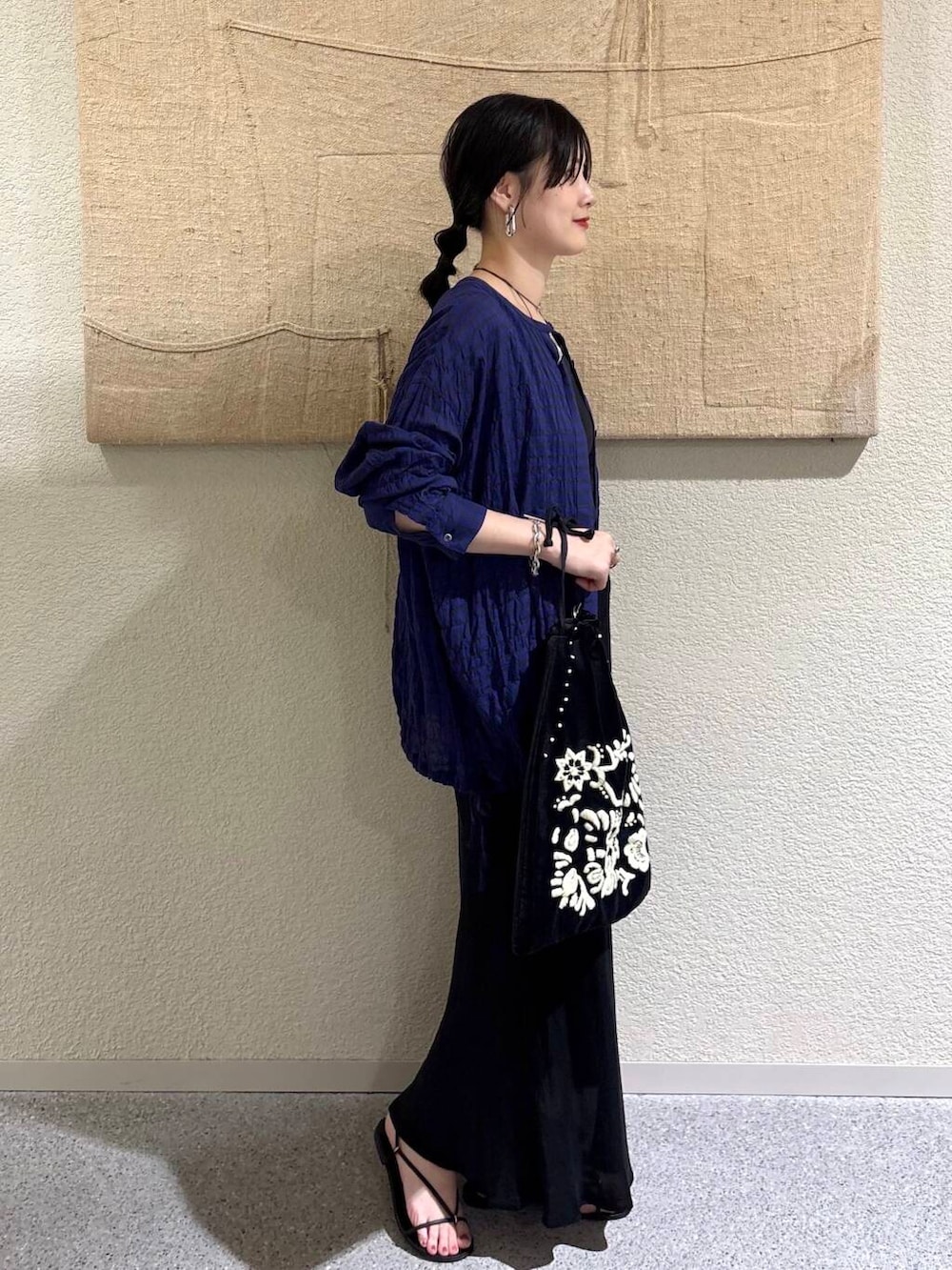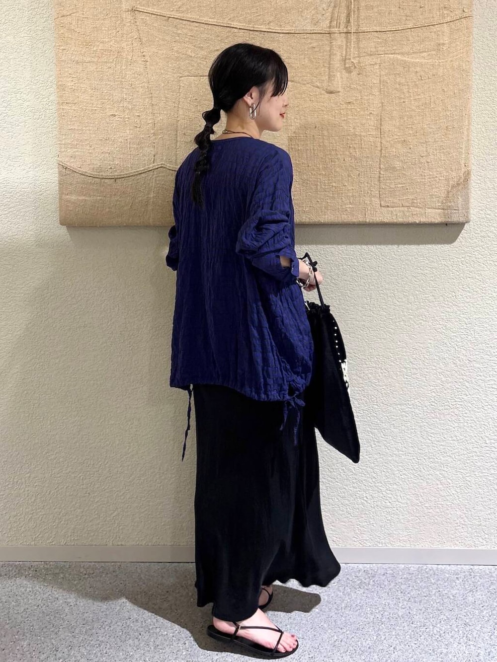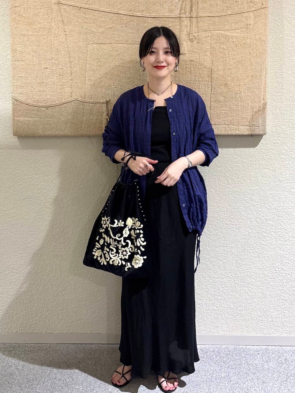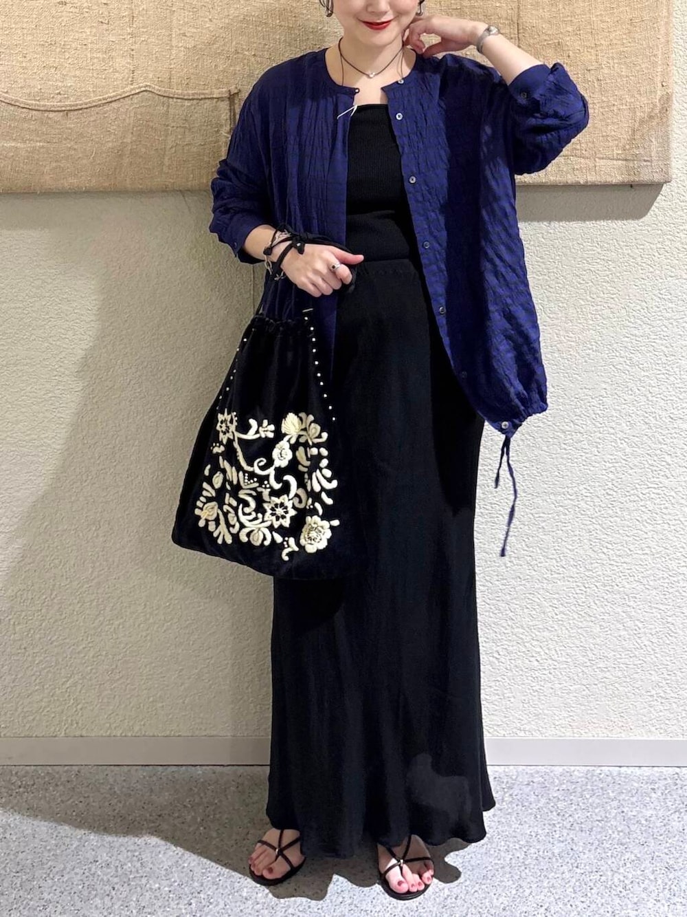 ブラックベースでまとめながら、クラフト感のあるディテールがコーデに奥行きを与えます。
