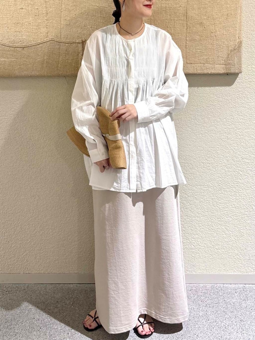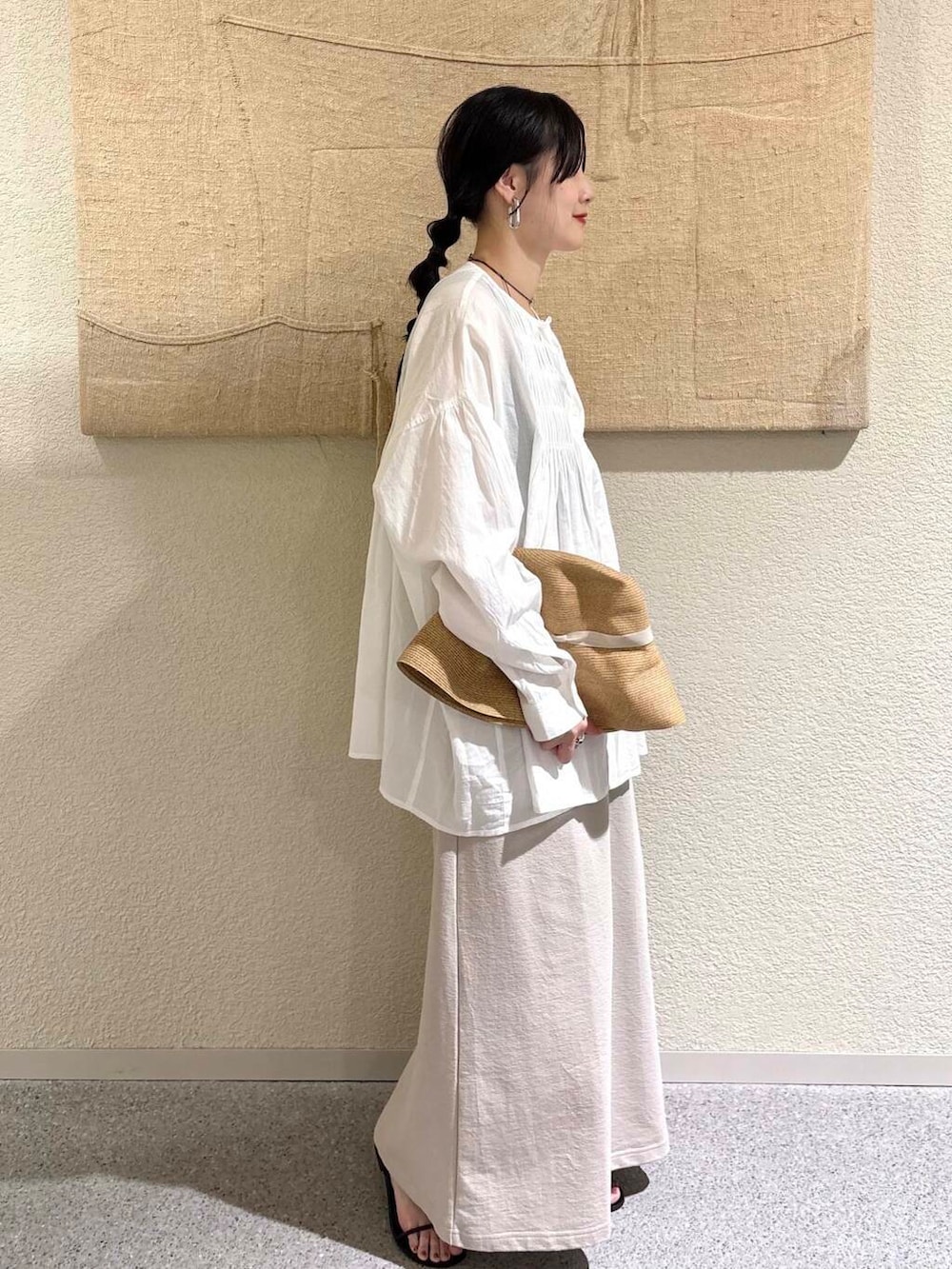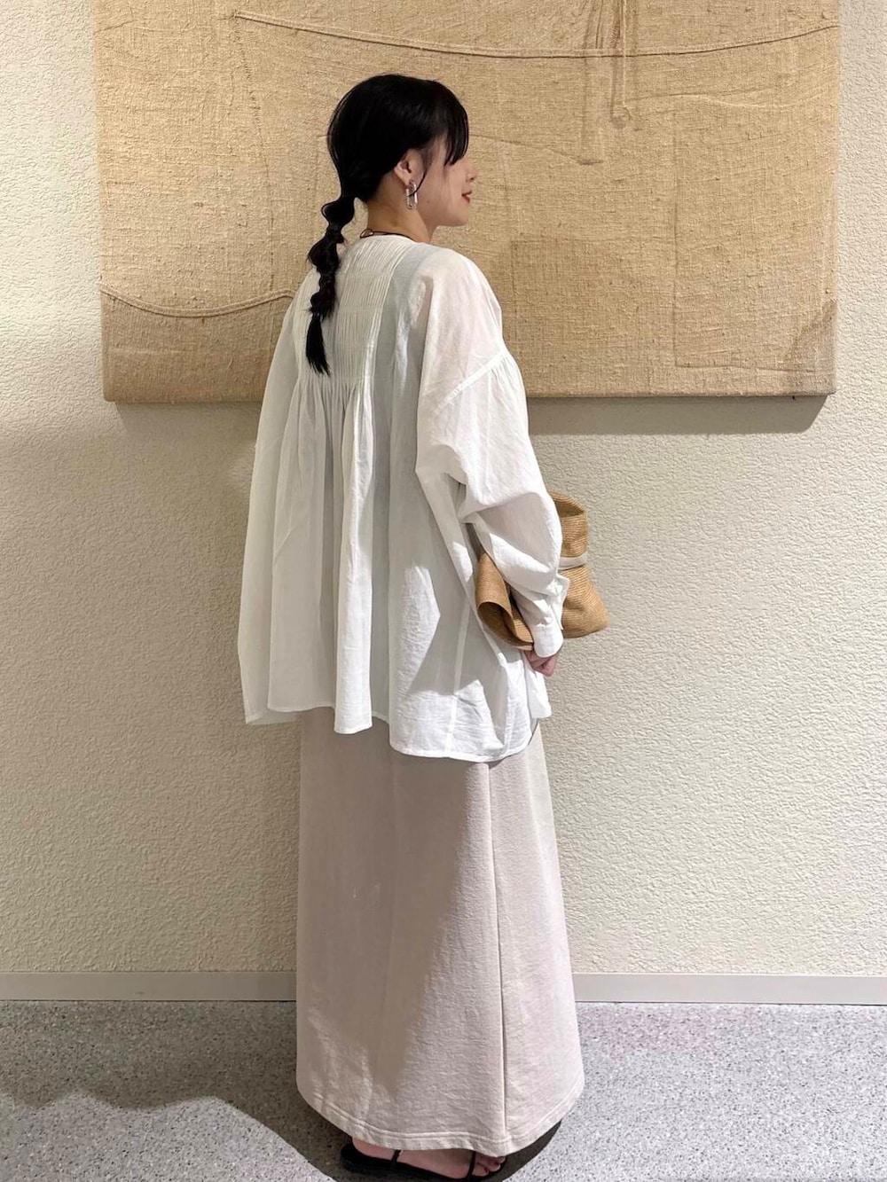 細かいピンタックが上半身に自然な立体感を。ふわっとした袖が腕まわりを優しくカバーし、柔らかい雰囲気を演出。身長158cmでもオーバーサイズにならず、バランスよく着用可能です。やや柔らかみのある白なので、肌にも馴染みやすく顔色を明るく見せてくれます。