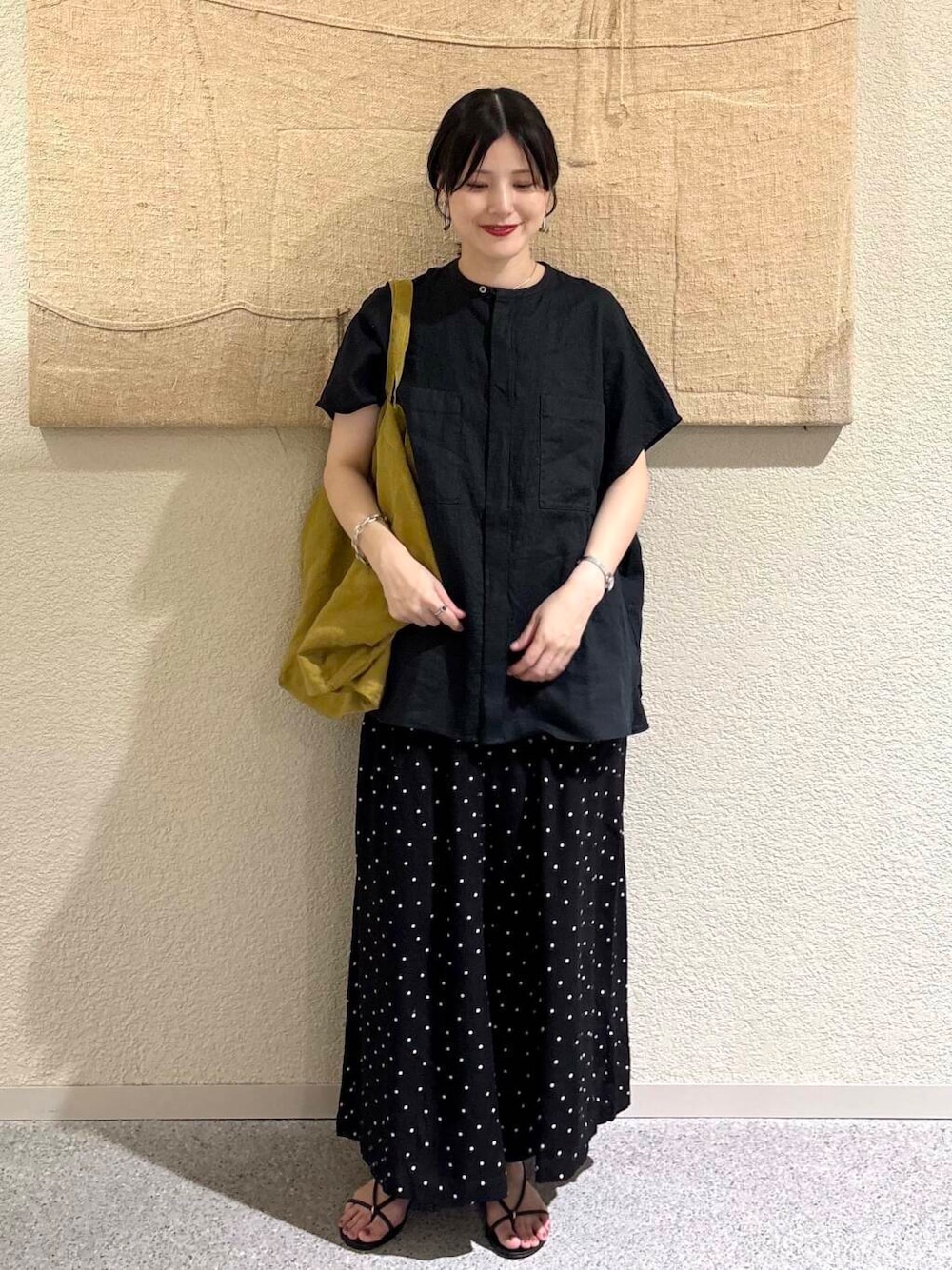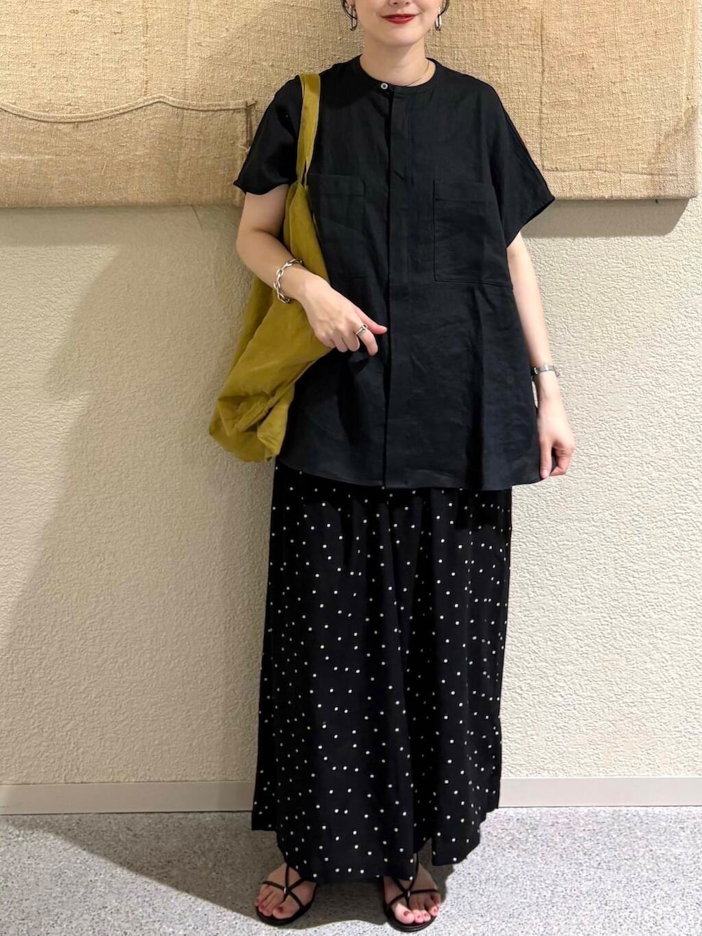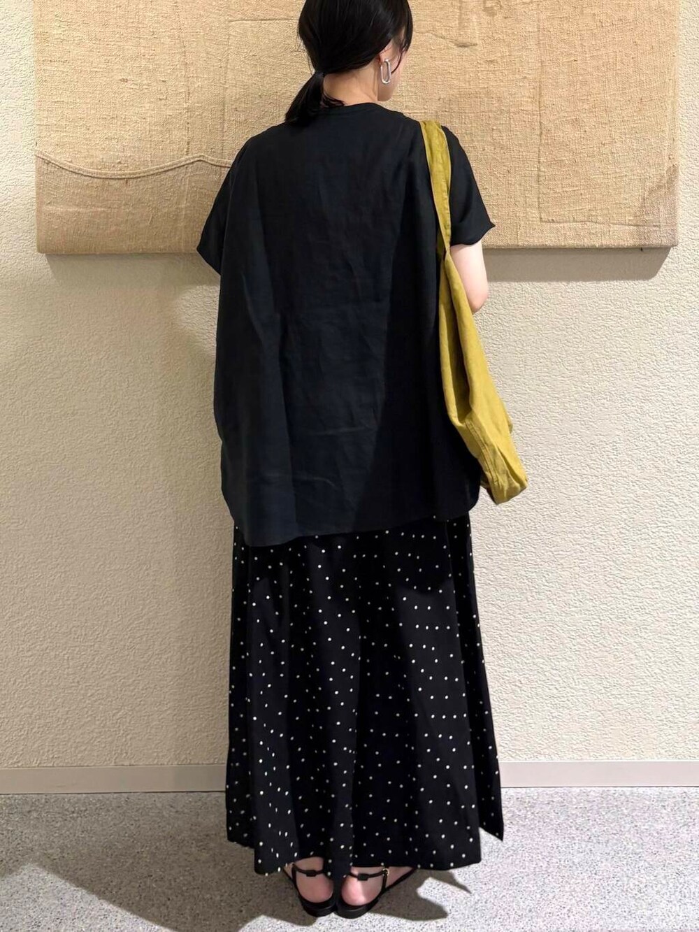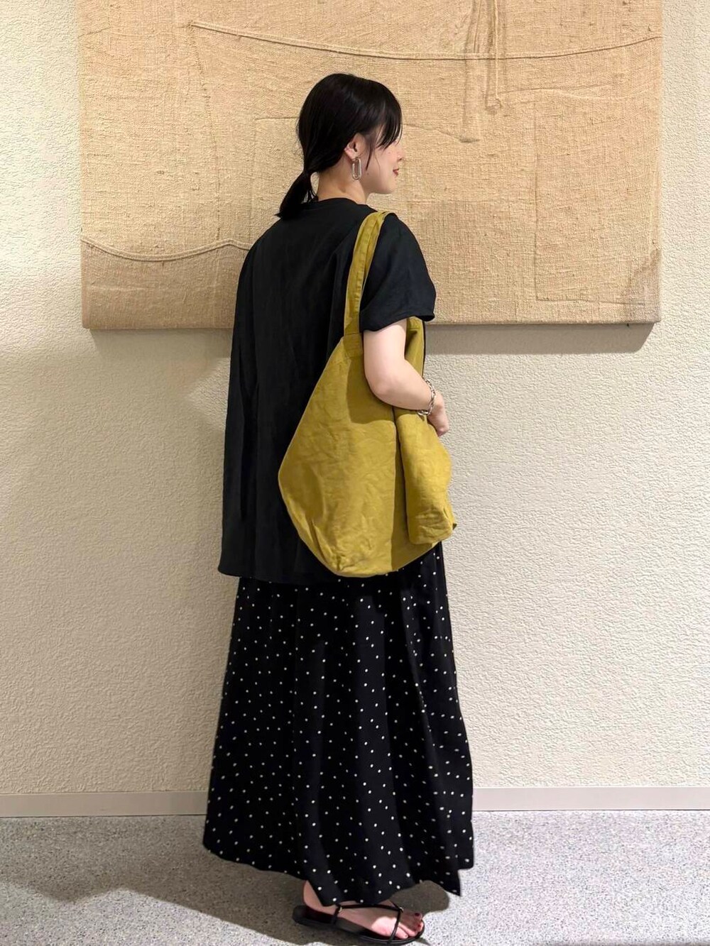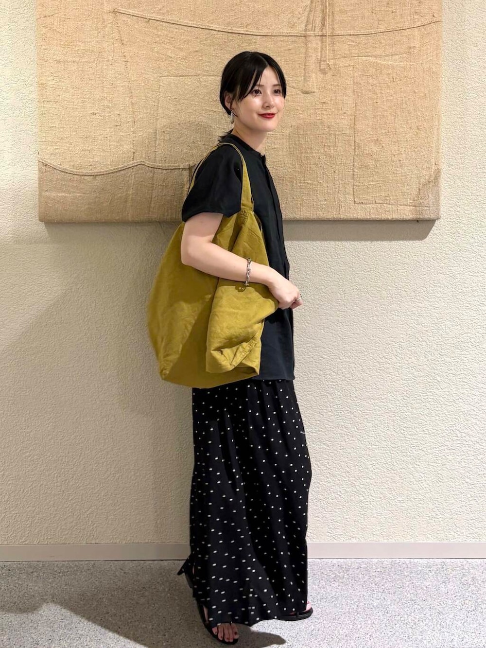 着こなしのアクセントになる、ニュアンス感のあるイエローカーキのリネントート。黒のワントーンスタイルに加えることで、ほどよく抜け感を演出。ビッグサイズで実用性も高く、夏の軽装に合わせても存在感があります。