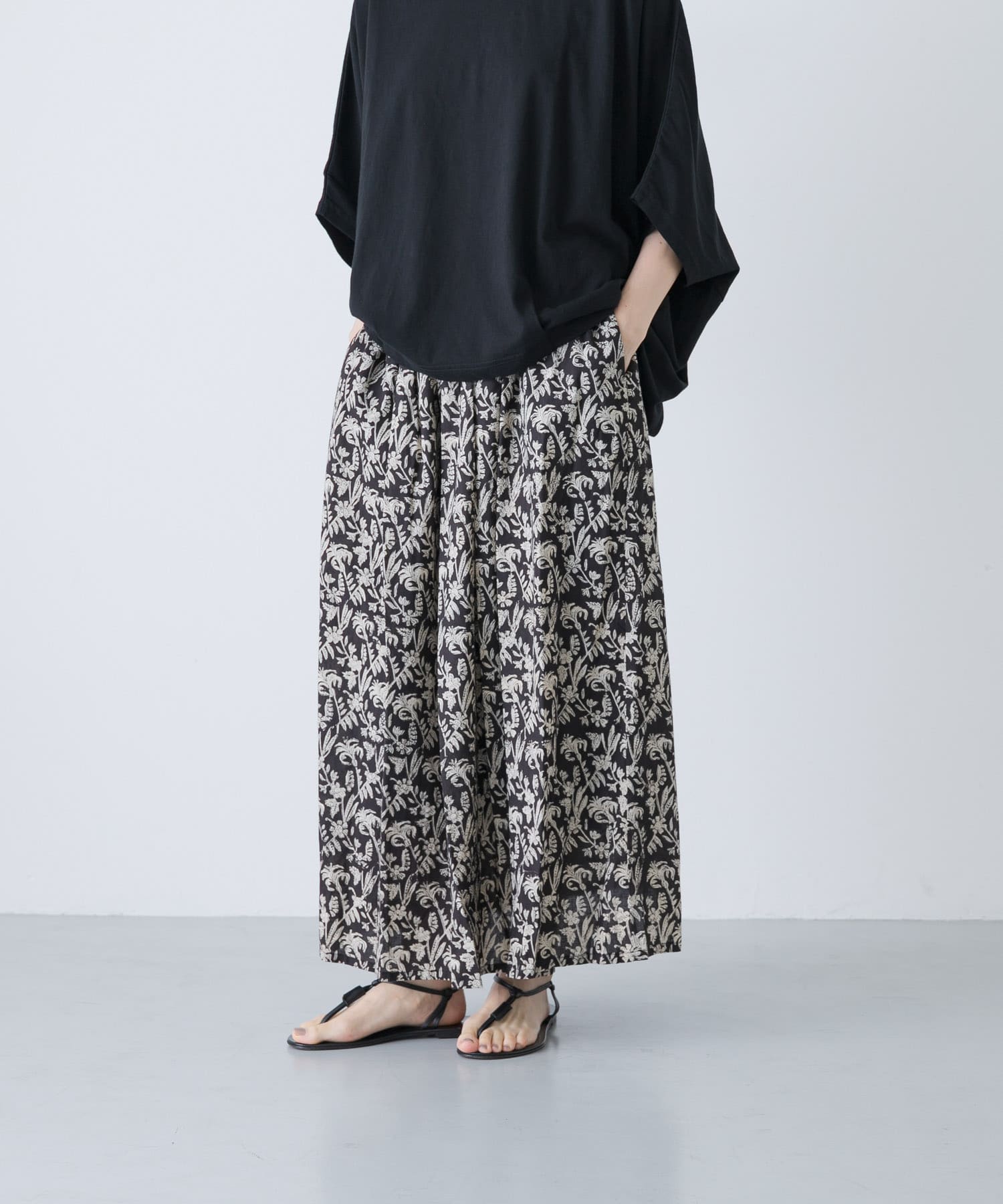 エスニックプリントギャザースカート、BLACKカラーの柄は小さめのボタニカル柄で合わせやすく、インド製のブロックプリントのナチュラルさが綺麗目になりすぎずとってもいいですね🙆♀️
