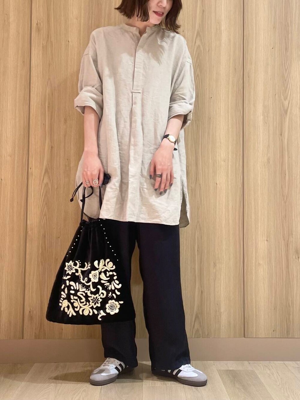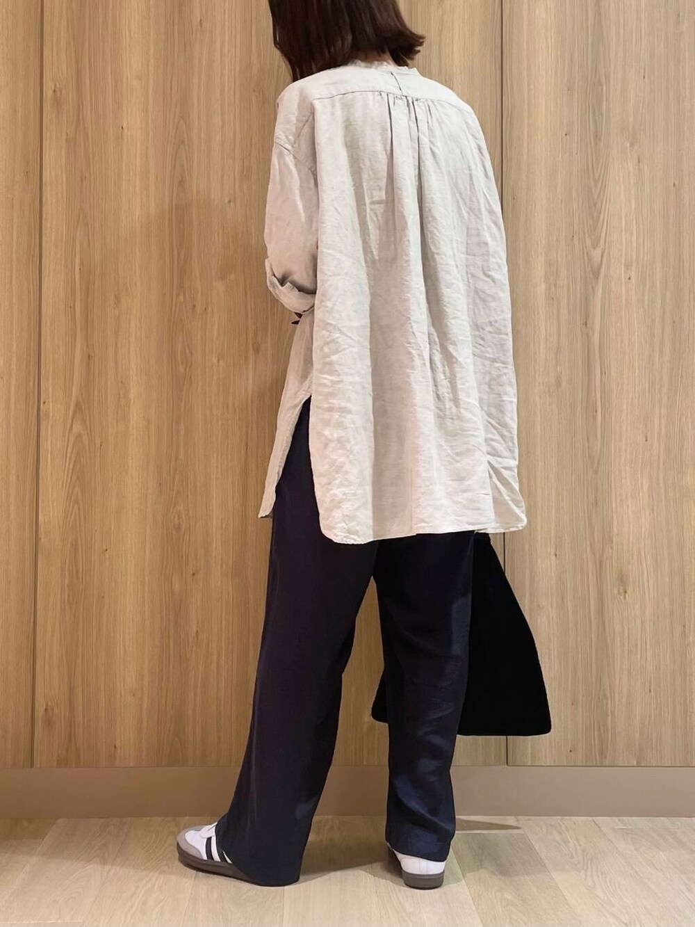 リネン素材かつ、風通しの良いゆったりとしたシルエットなので、今の時期でも着用しやすい長袖のアイテムになります◎お袖をまくったり、ボタンを何個か開けて抜け感を出して着用するのが女性らしさがでてオススメです!