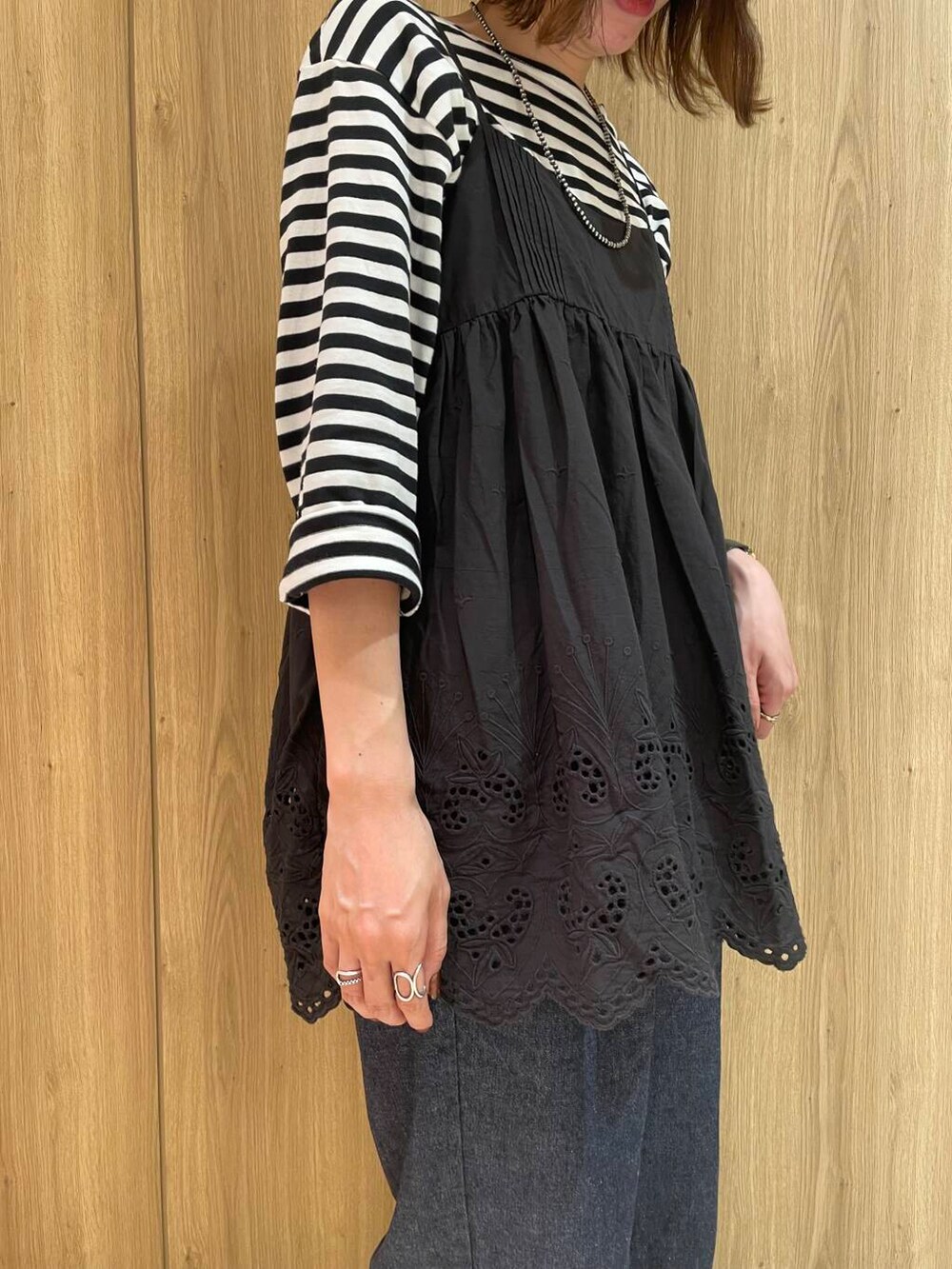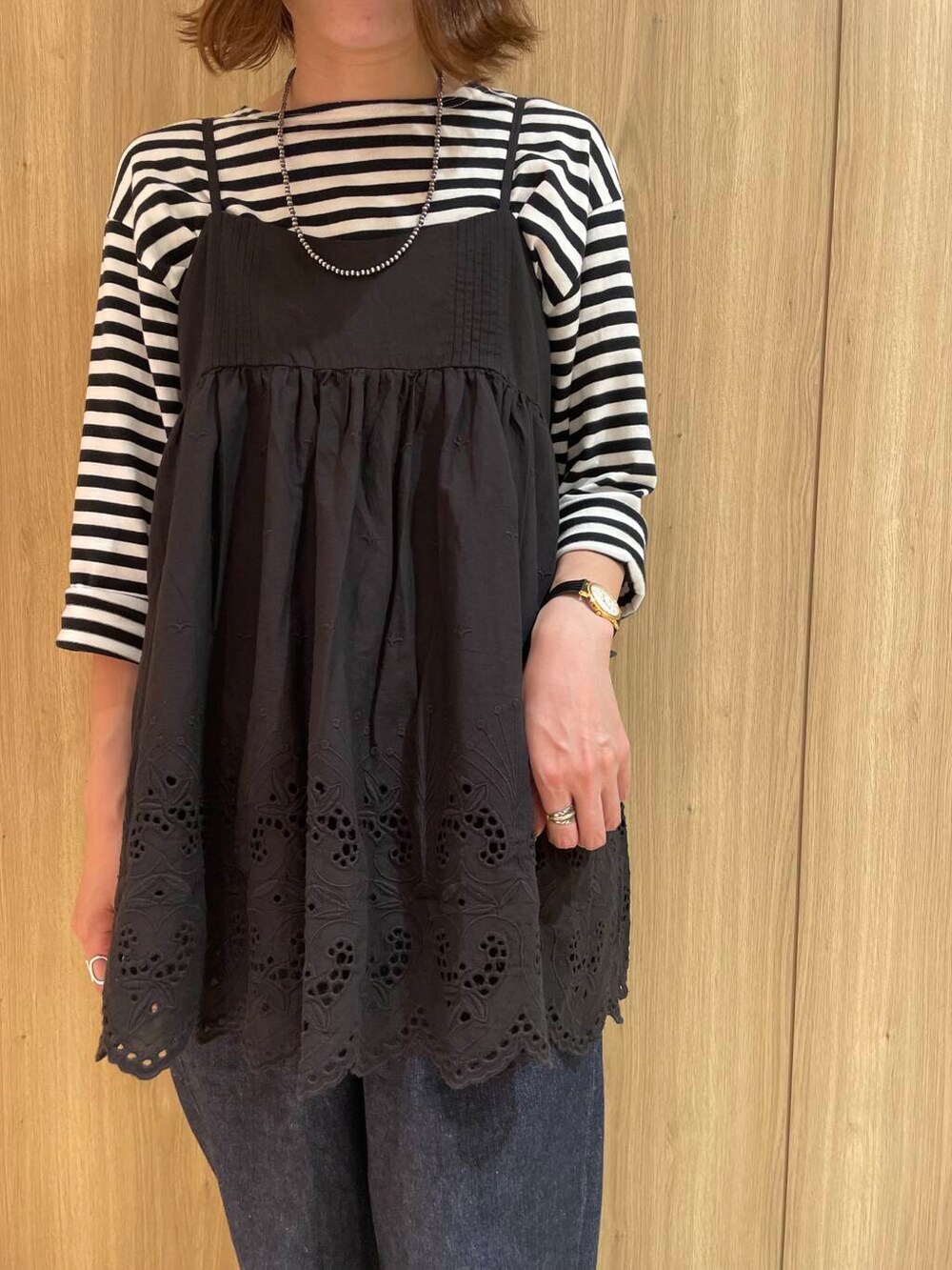 入荷前からお問い合わせが多かったキャミソール、店頭にも入ってきました!まだまだ暑いですが、少し秋の雰囲気を取り入れてたい、、そういった方にオススメのアイテムです。レイヤードするアイテム次第で印象がガラッと変わります。裾の刺繍のデザインがとっても可愛いです!肩紐で長さ調節は可能です◎