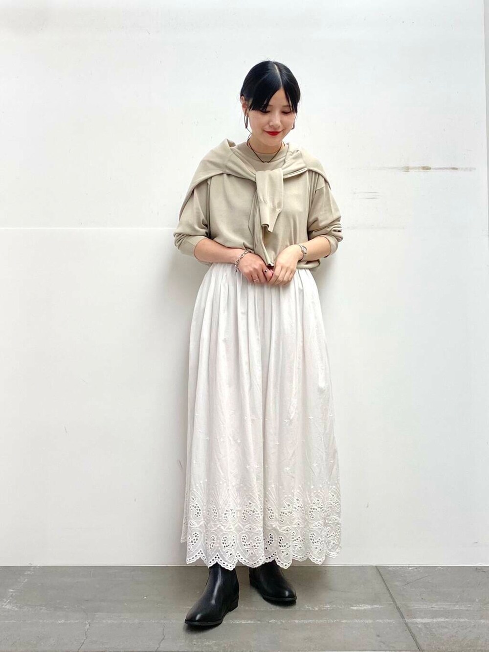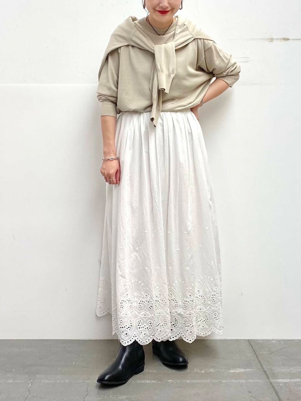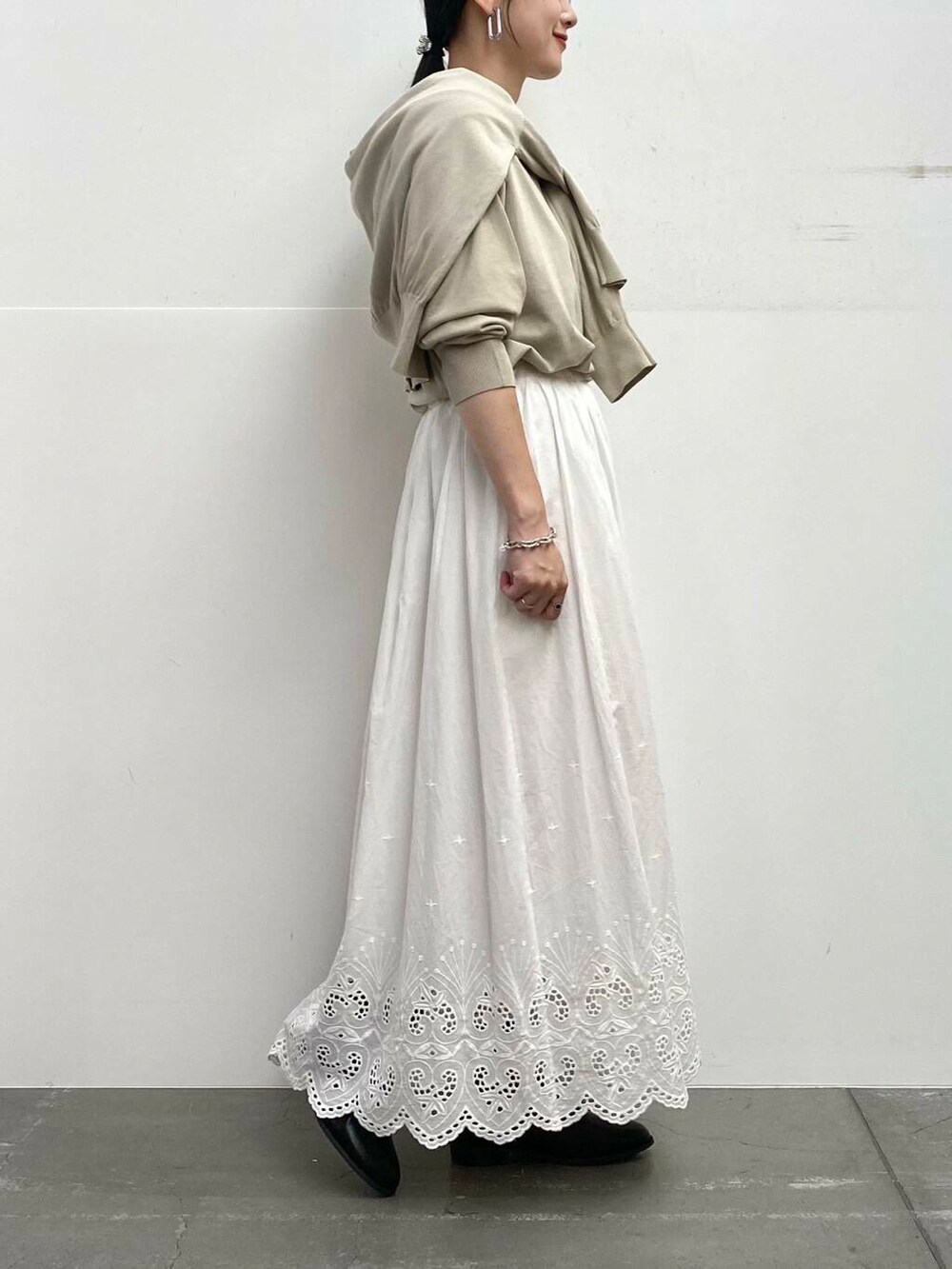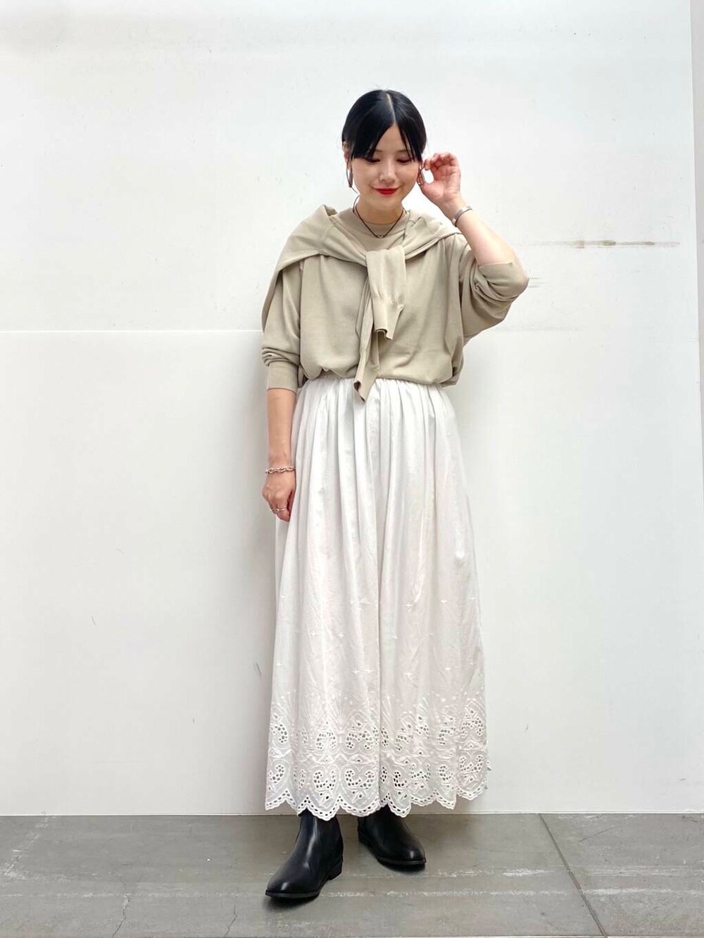 トップスとカーディガンは同じ素材感で、アンサンブルにも◎
