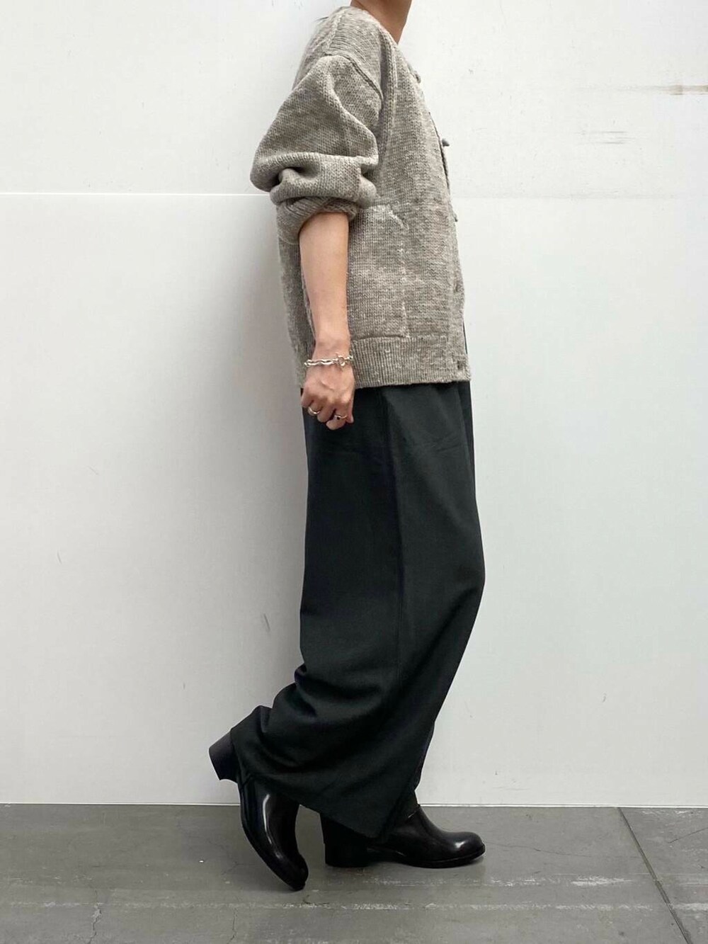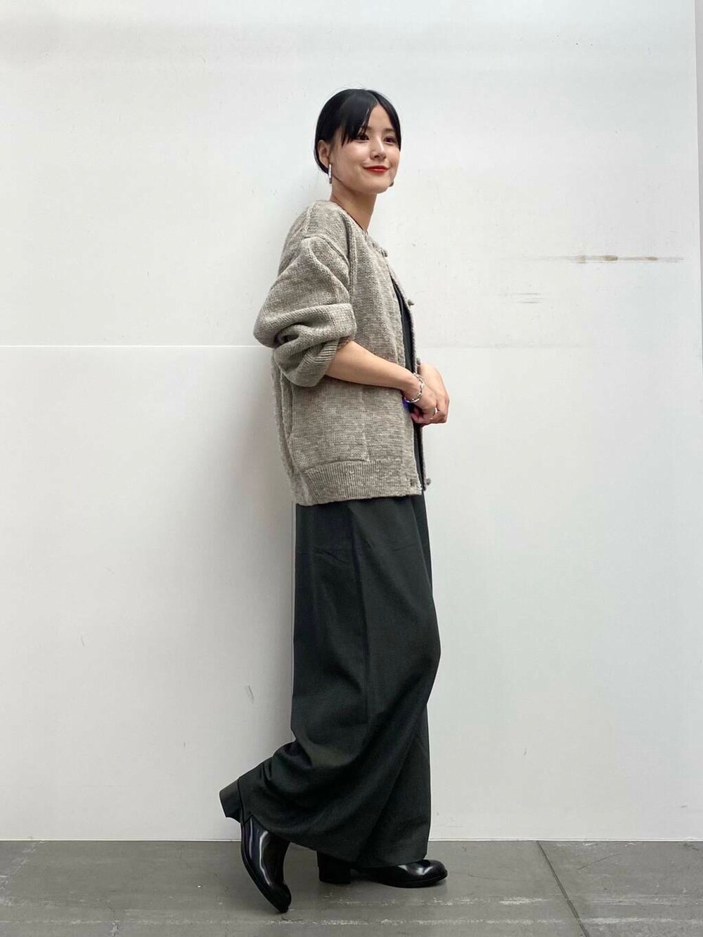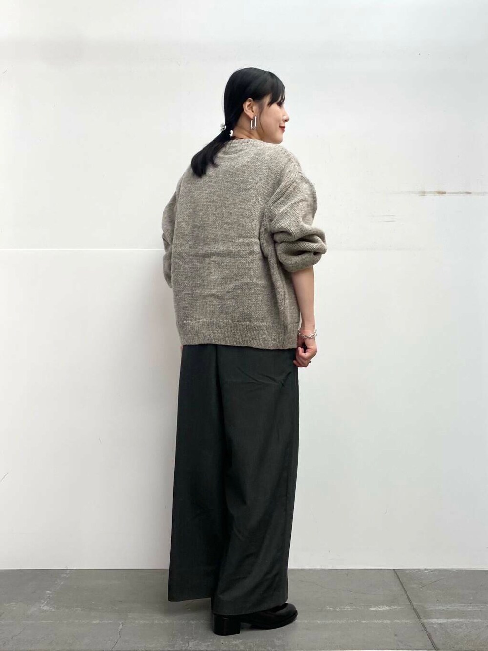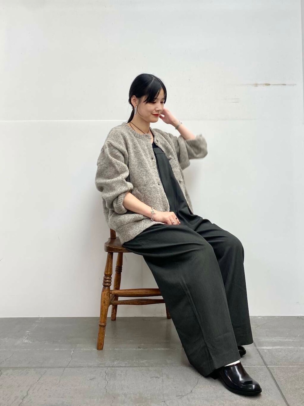 もこもこなカーディガンと合わせてきれいめカジュアルなスタイリングです◎