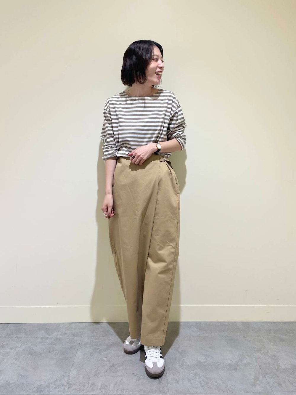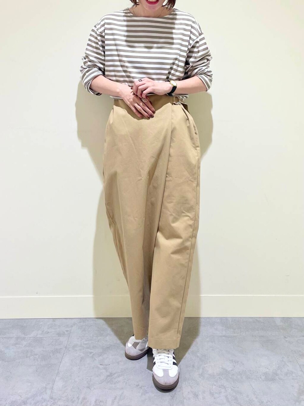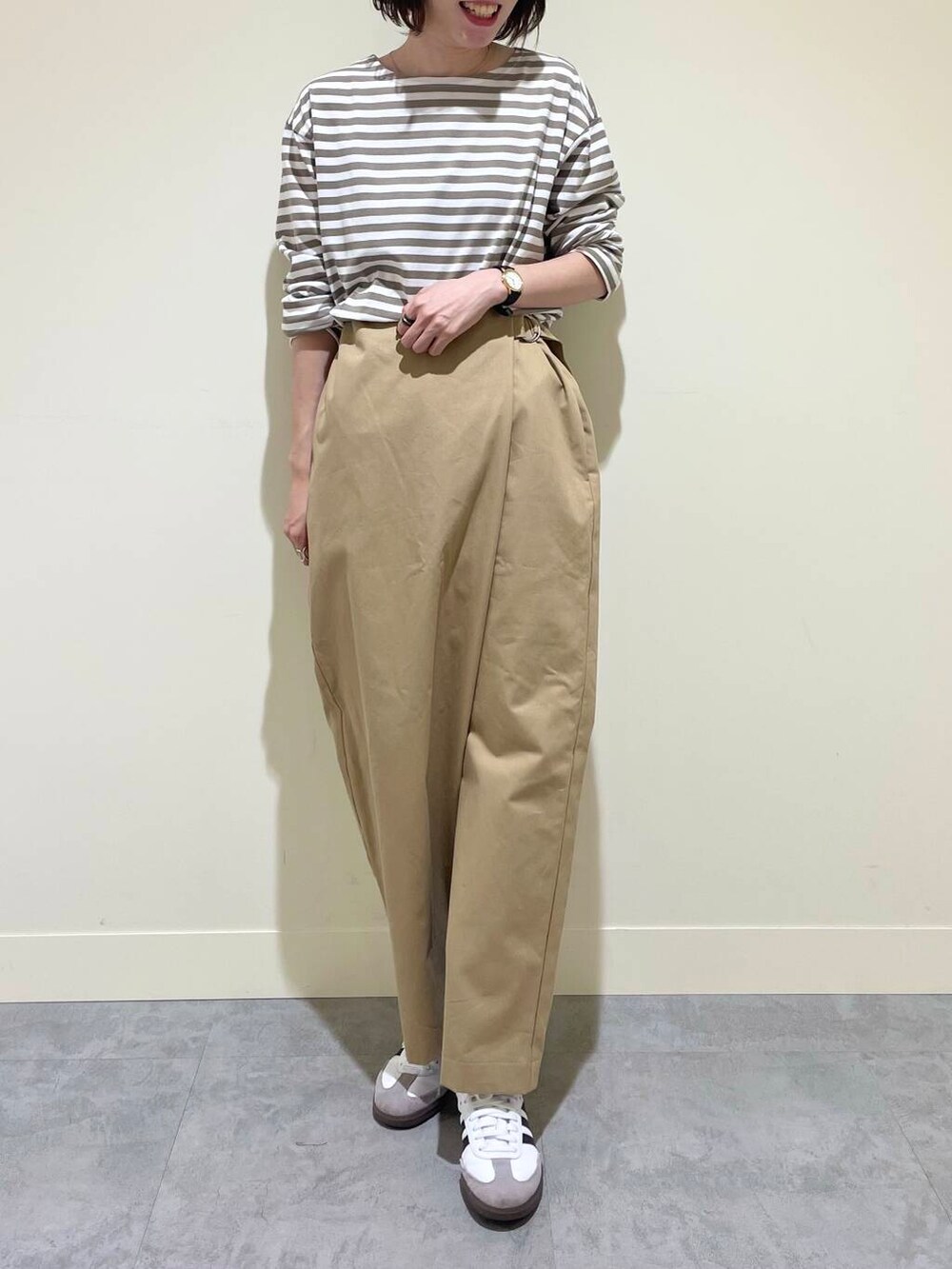 フロント部分がラップになっており、シンプルなトップスと合わせてもコーディネートのお洒落度を増してくれるパンツです◎シルエットはストレートでスッキリとしていて、腰回りは程よくゆとりがあるので履きやすいです。コットンツイルの生地で、長いシーズン着用頂けます!
