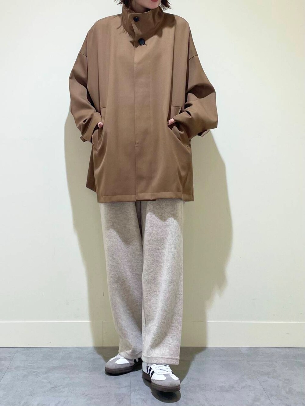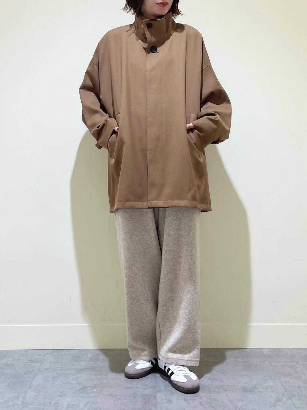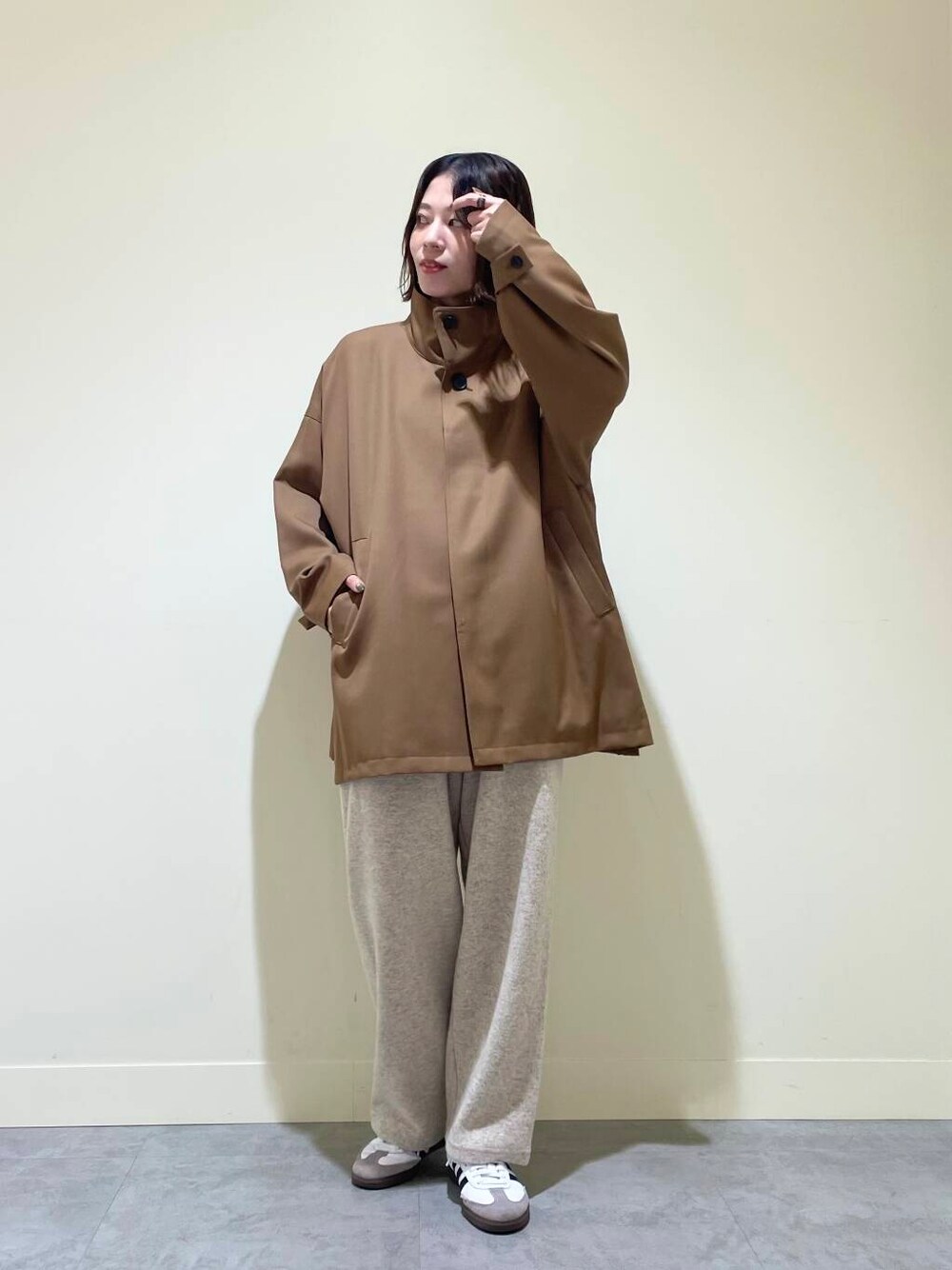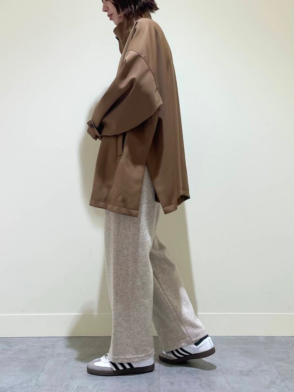 程よくゆとりのあるシルエット、スタンドカラー、サイドのスリット、全体のバランスがとても良くて、さっと羽織るだけでもコーディネートのお洒落度をあげてくれるデザインです!アームホームも広めなので、ボリュームのあるニットも着込めます◎