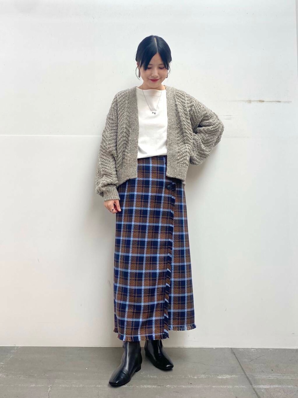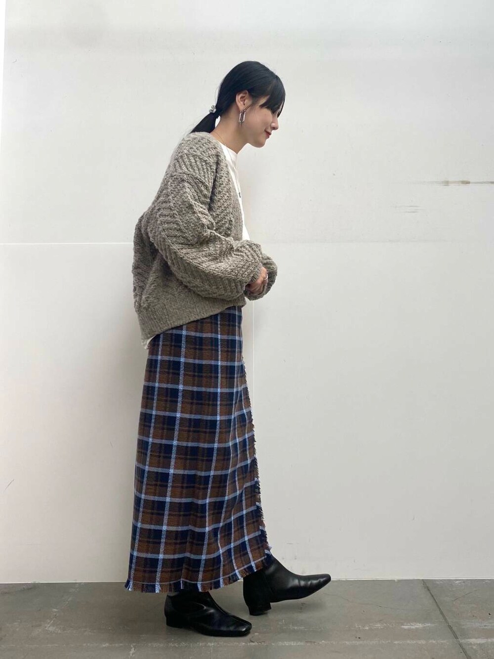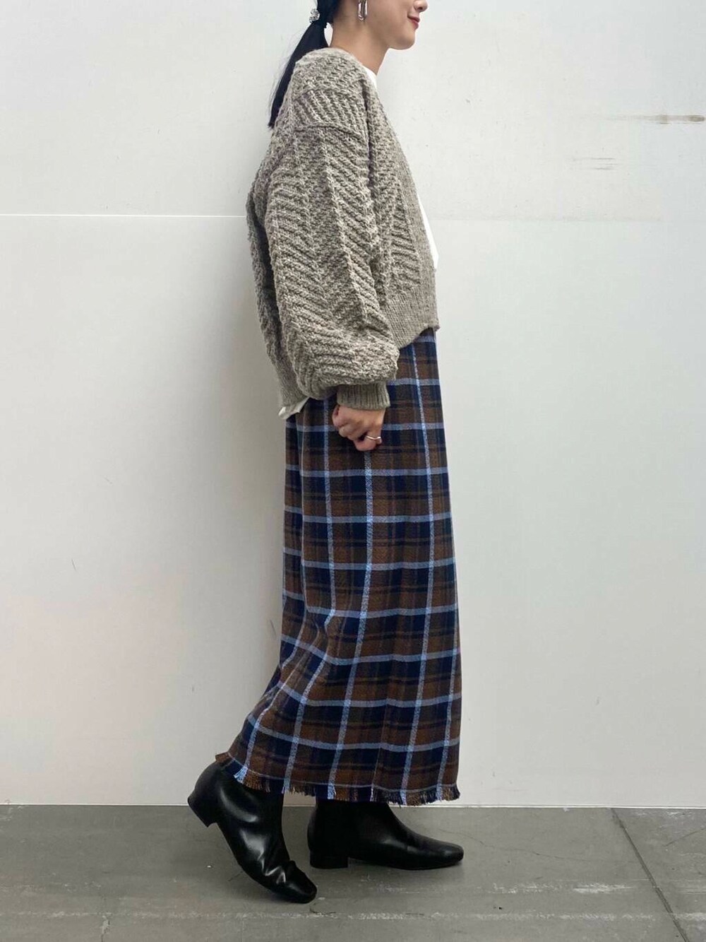 チェックのスカートは足のラインを拾わないくらいのシルエットできれいめカジュアルにお召しいただけます!