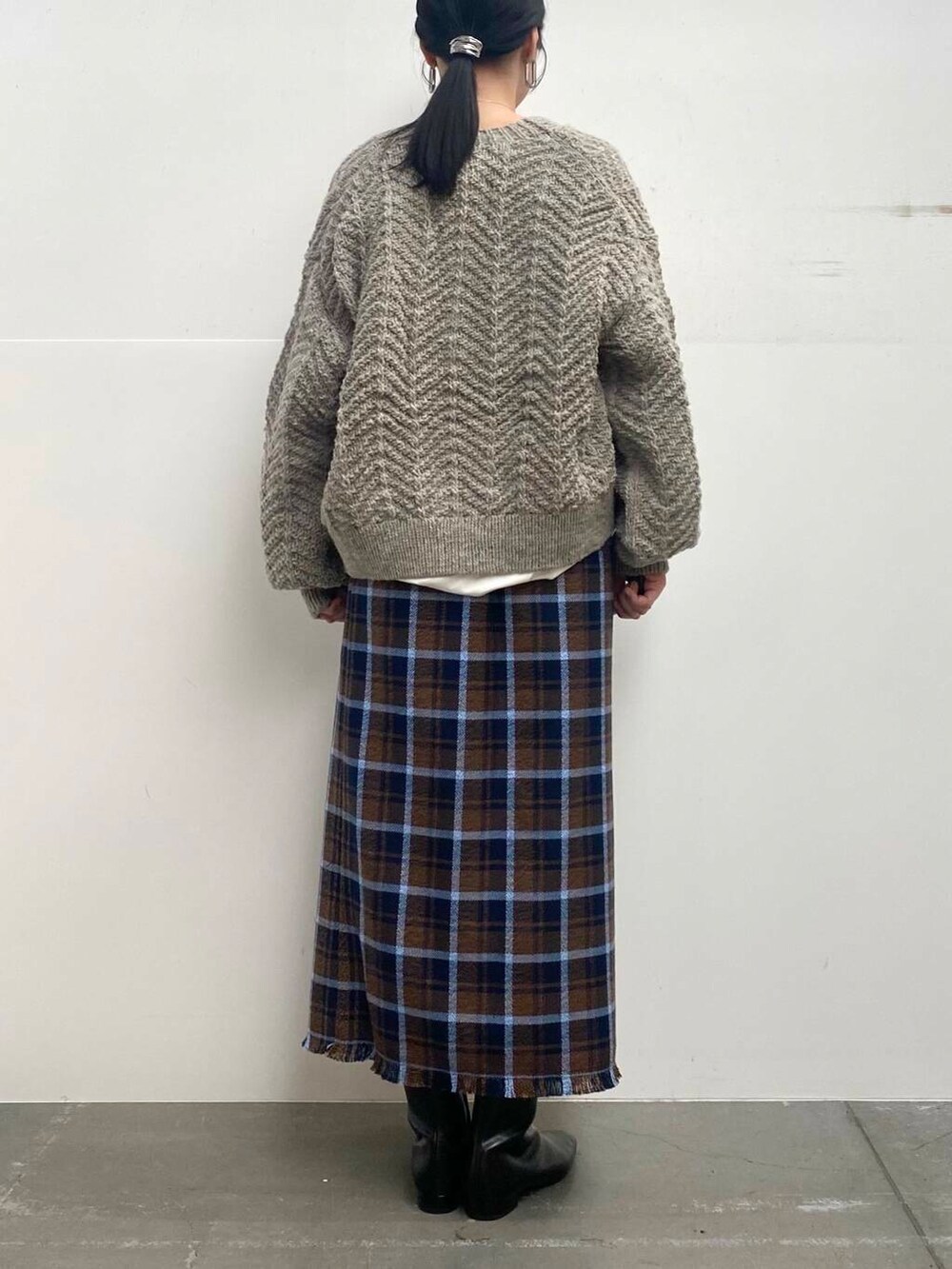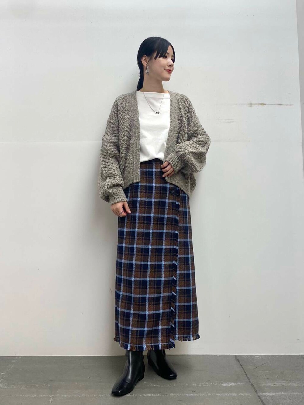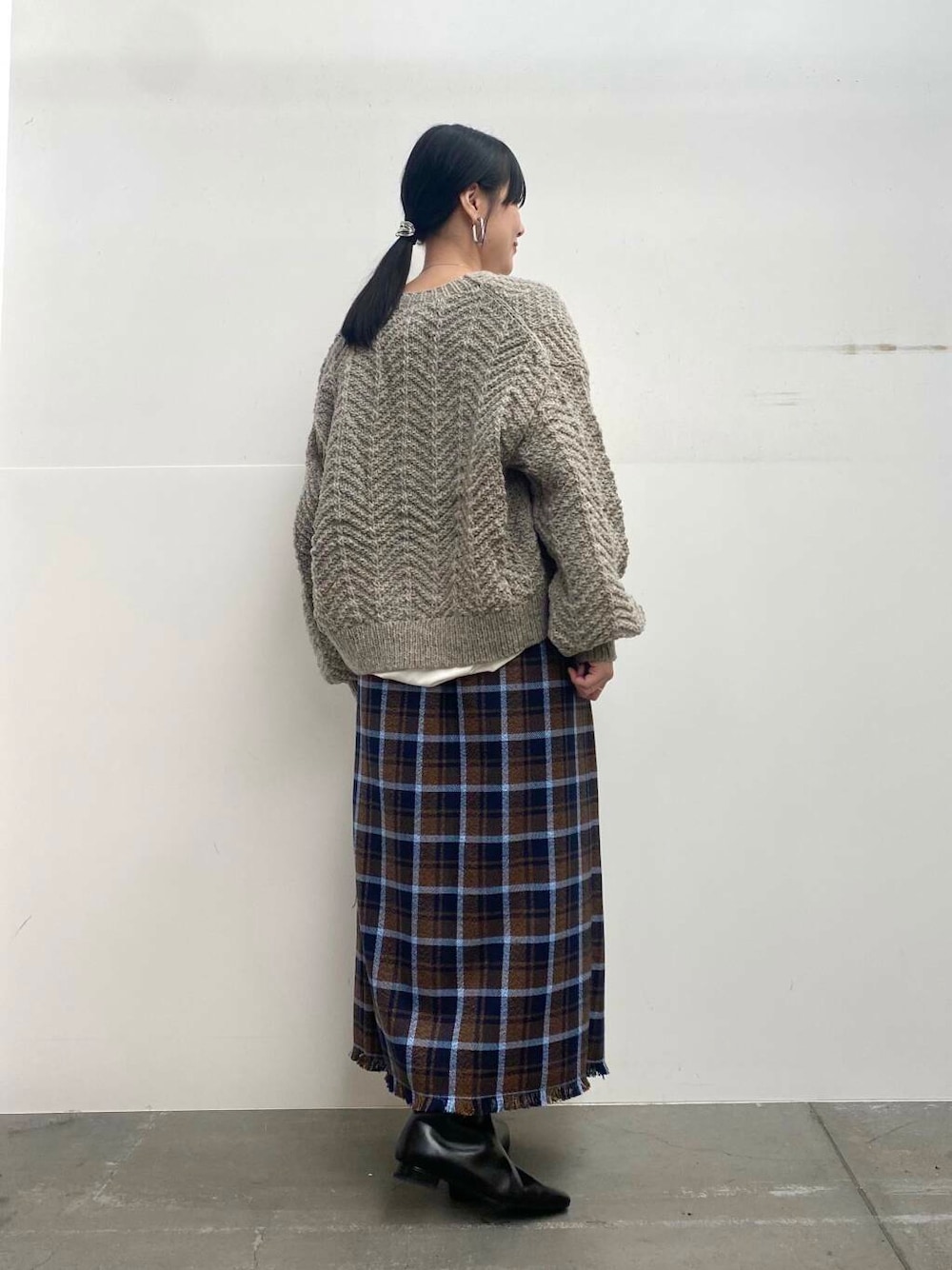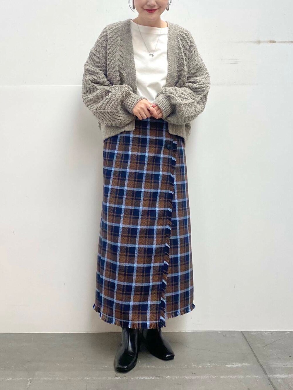 チェックのスカートは足のラインを拾わないくらいのシルエットできれいめカジュアルにお召しいただけます!