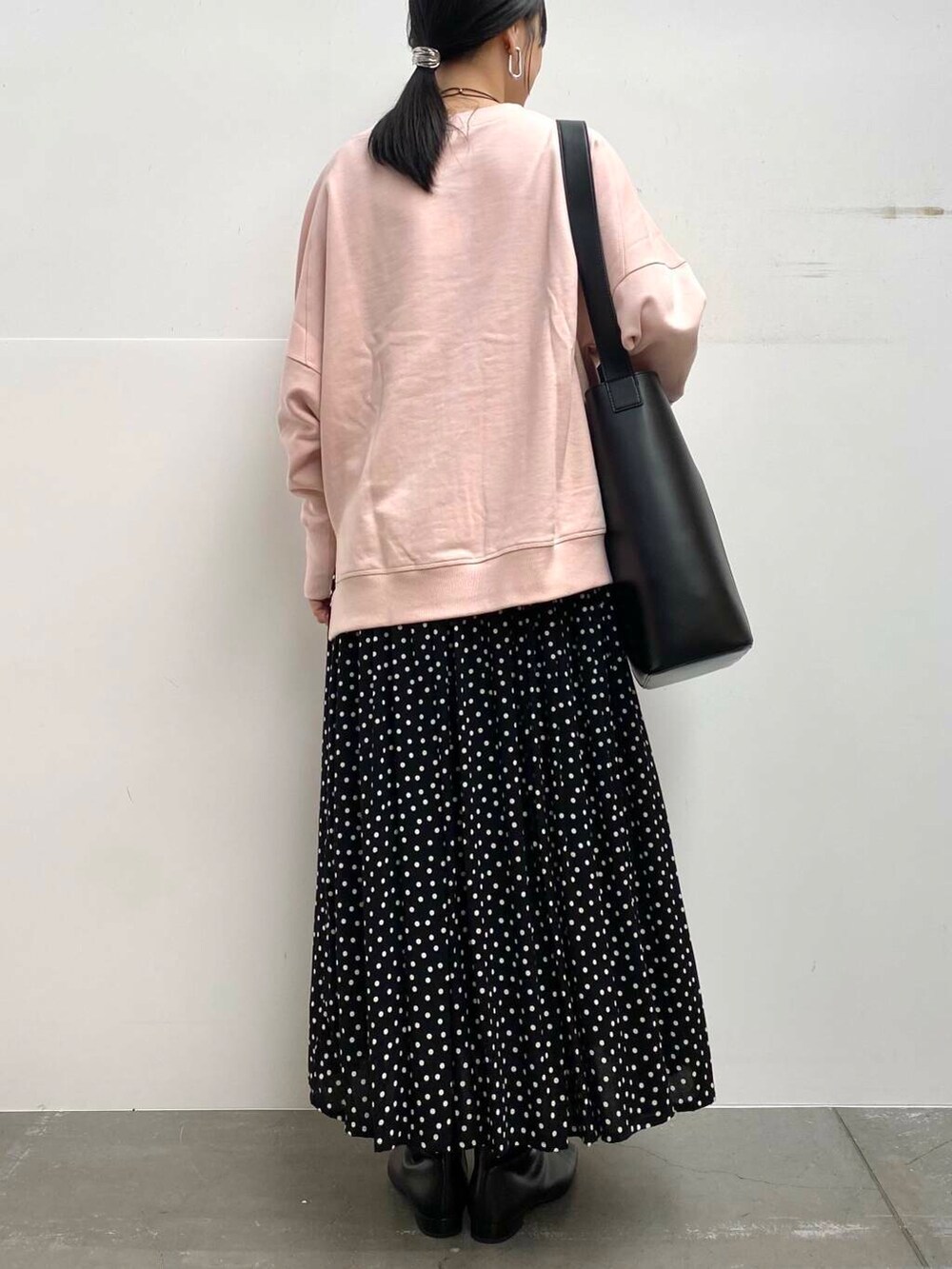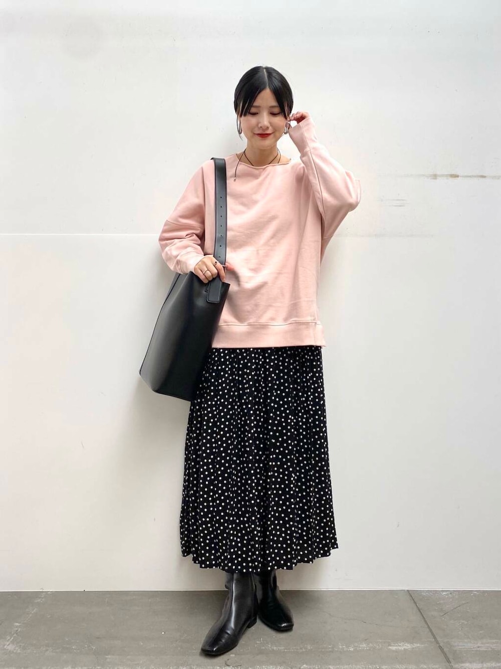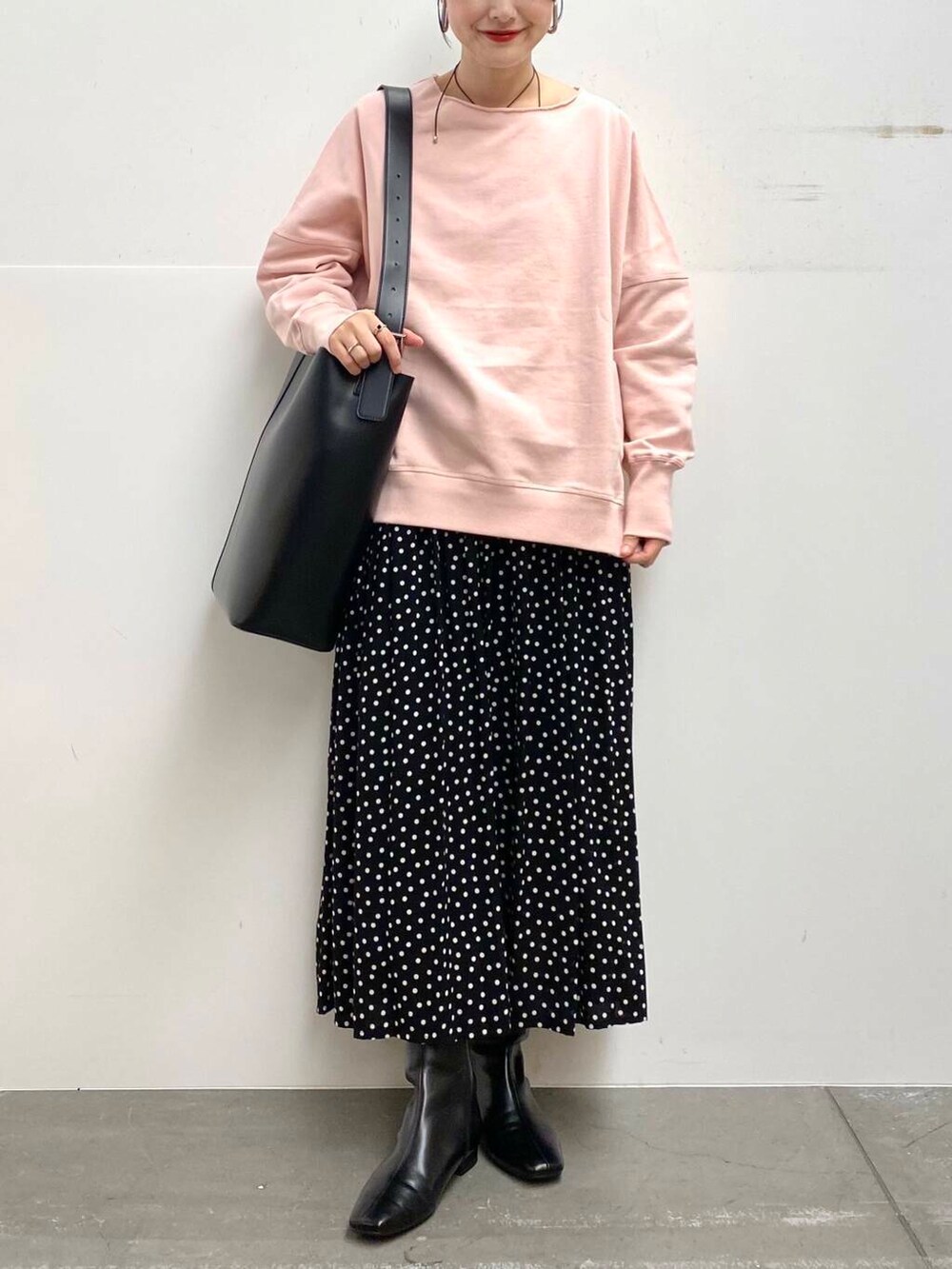 スウェットは抜け感のある首元のデザインが、カジュアルになりすぎずおしゃれな雰囲気に◎