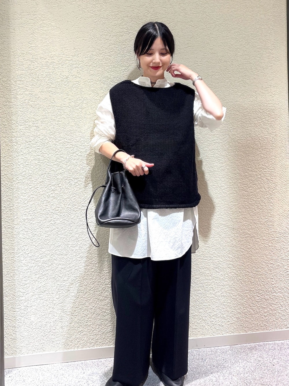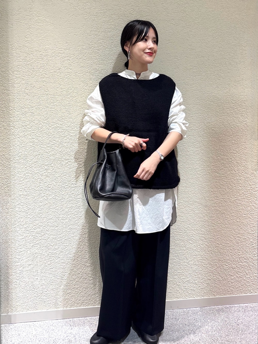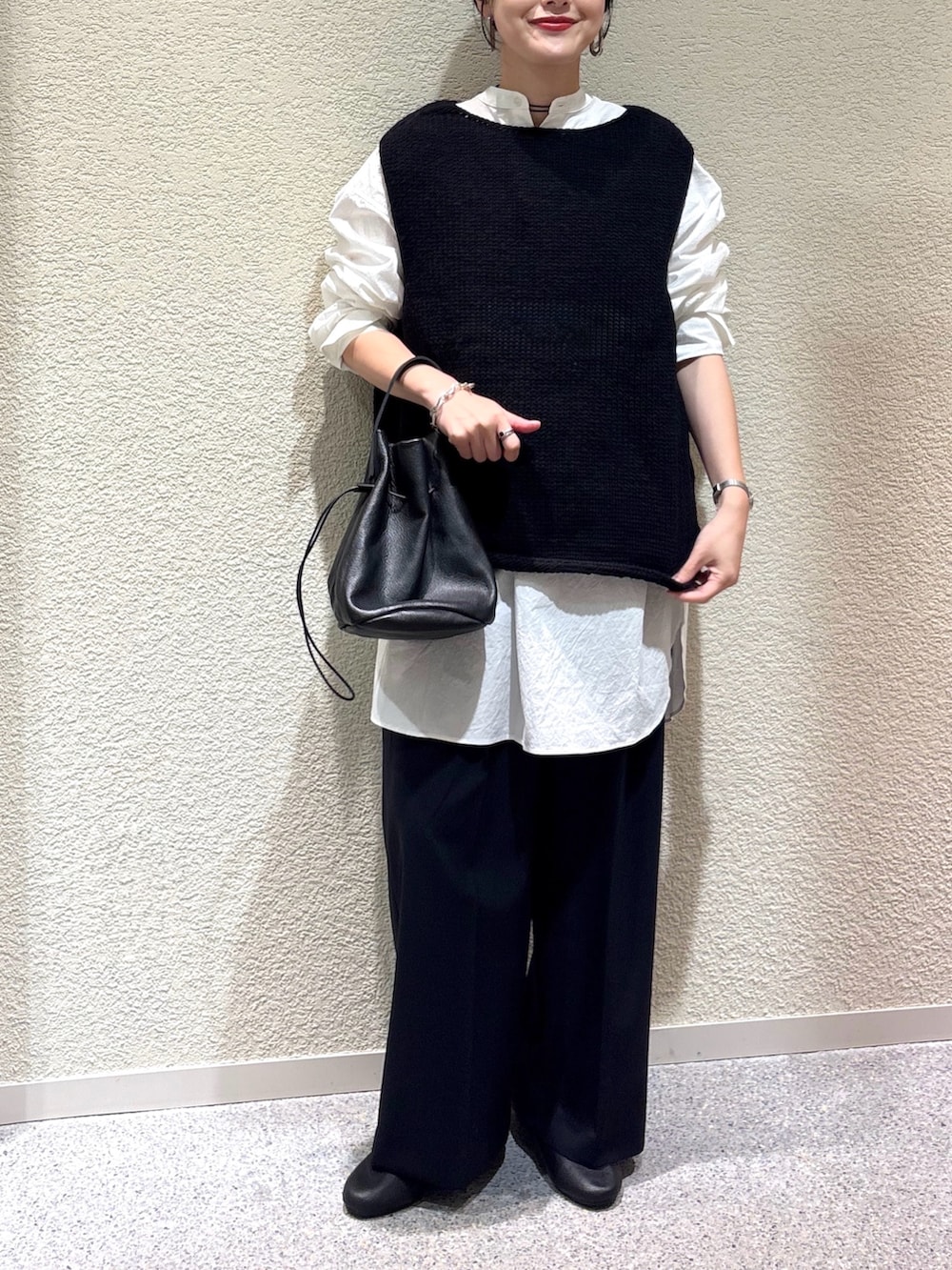 黒のニットベストを重ね、シャープなコントラストを効かせたレイヤードスタイルに。