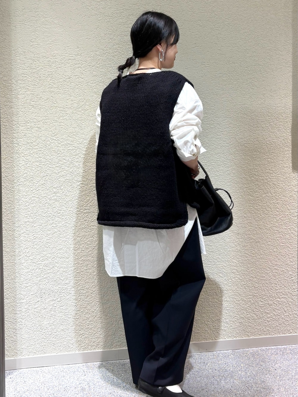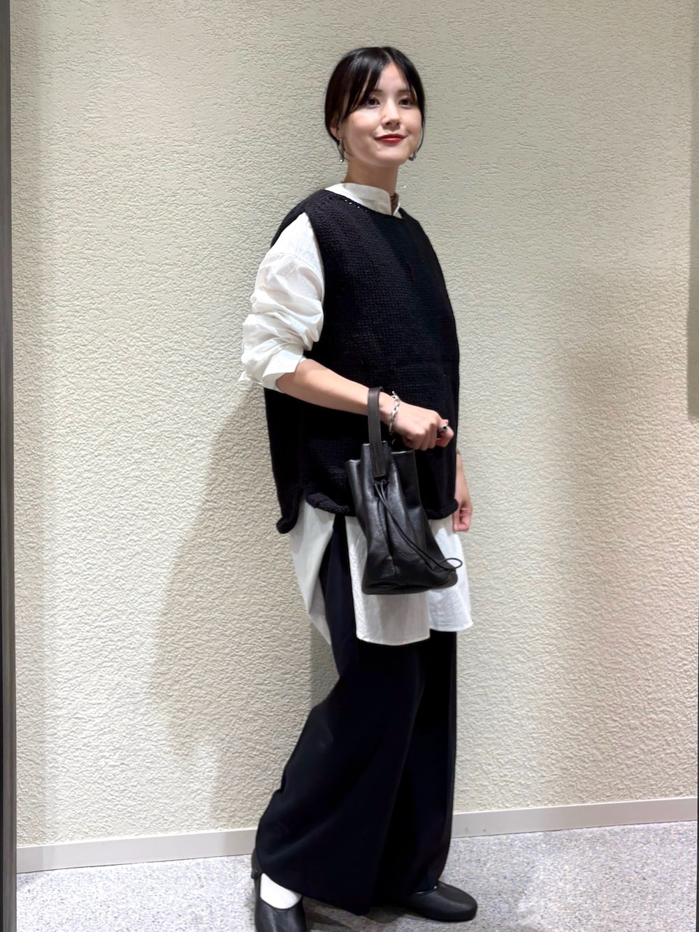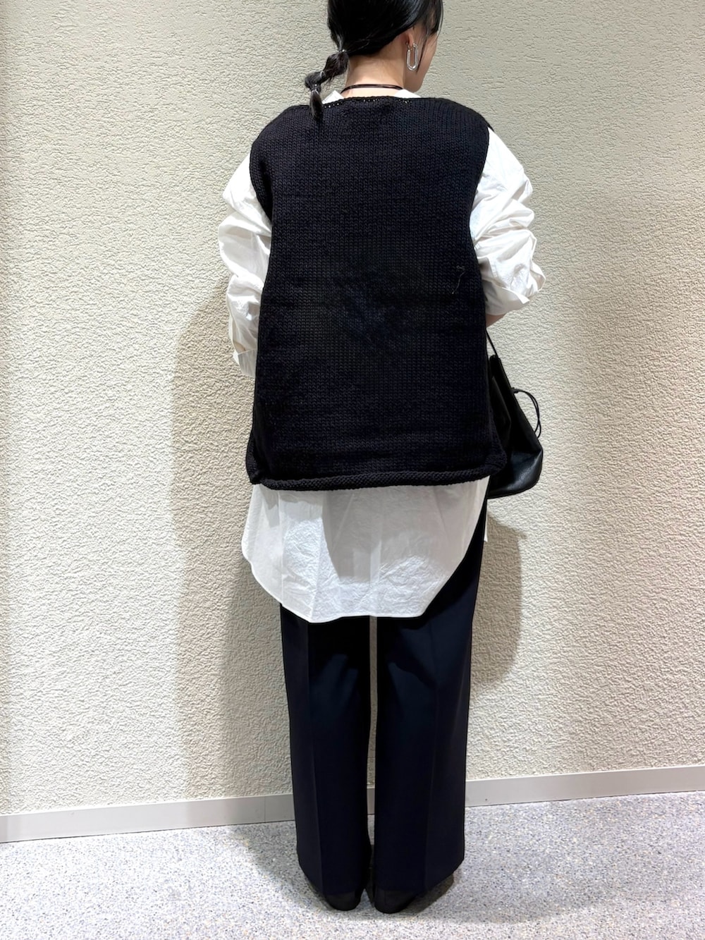 黒のニットベストを重ね、シャープなコントラストを効かせたレイヤードスタイルに。