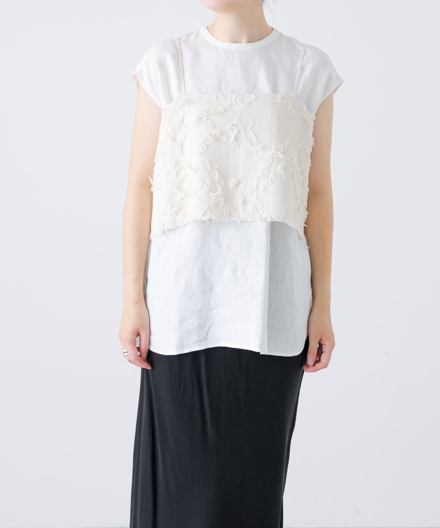 繊細なジャガード生地が存在感を放つキャミソール。カットソーの上に重ねることで柄の立体感が際立ち、スタイルのアクセントに。