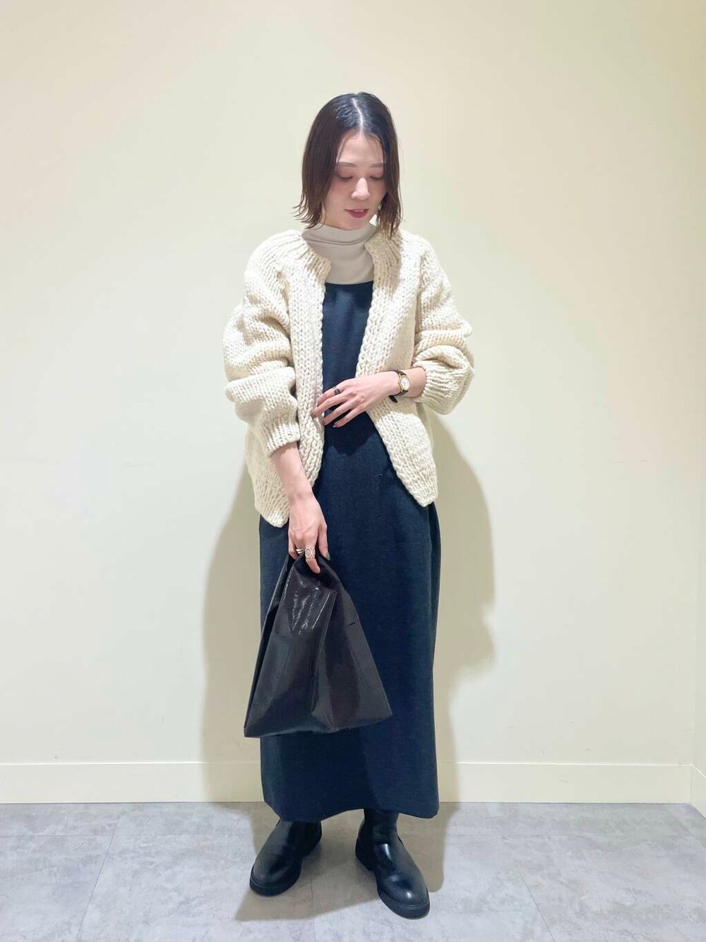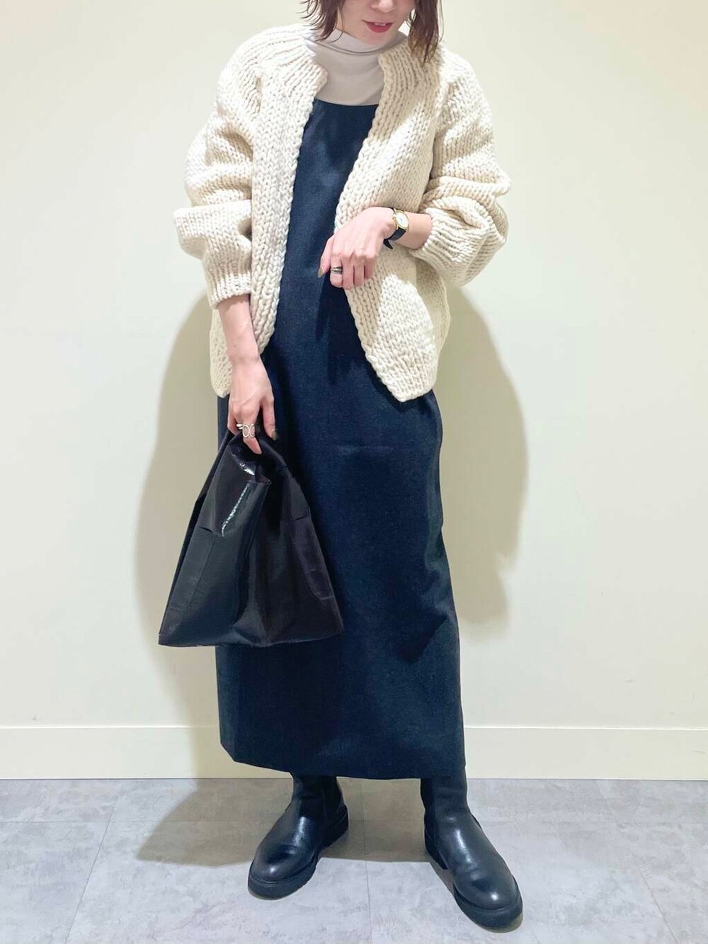前後2WAYで着れるワンピースで今回私はVネックを後ろにして着てみました!綺麗なストレートシルエットで、私の身長(165cm)だとくるぶしは見える着丈で、スッキリとした印象です。デザインがシンプルなのでインナーも幅広く合わせることができ、長いシーズンご着用頂けます。