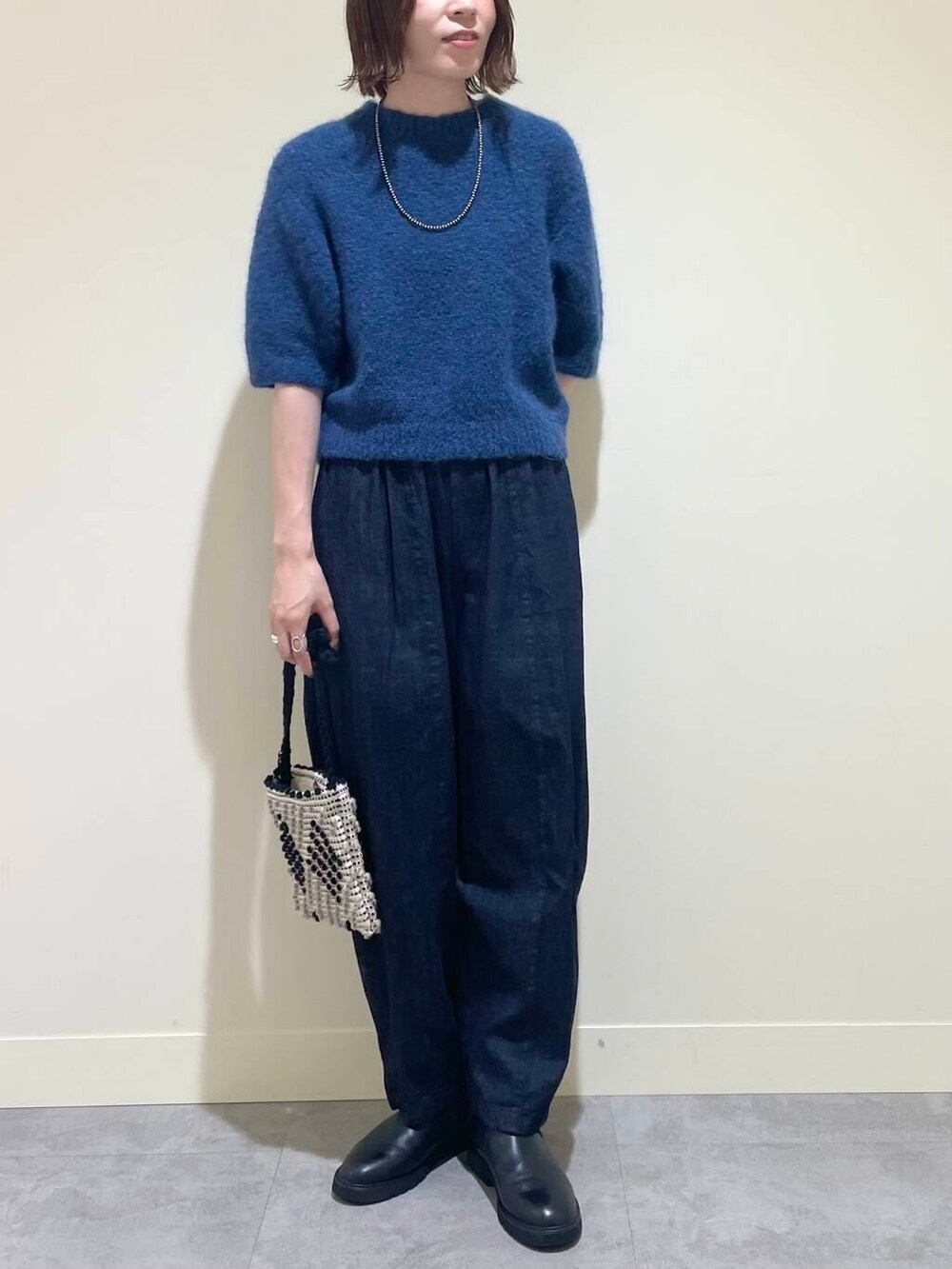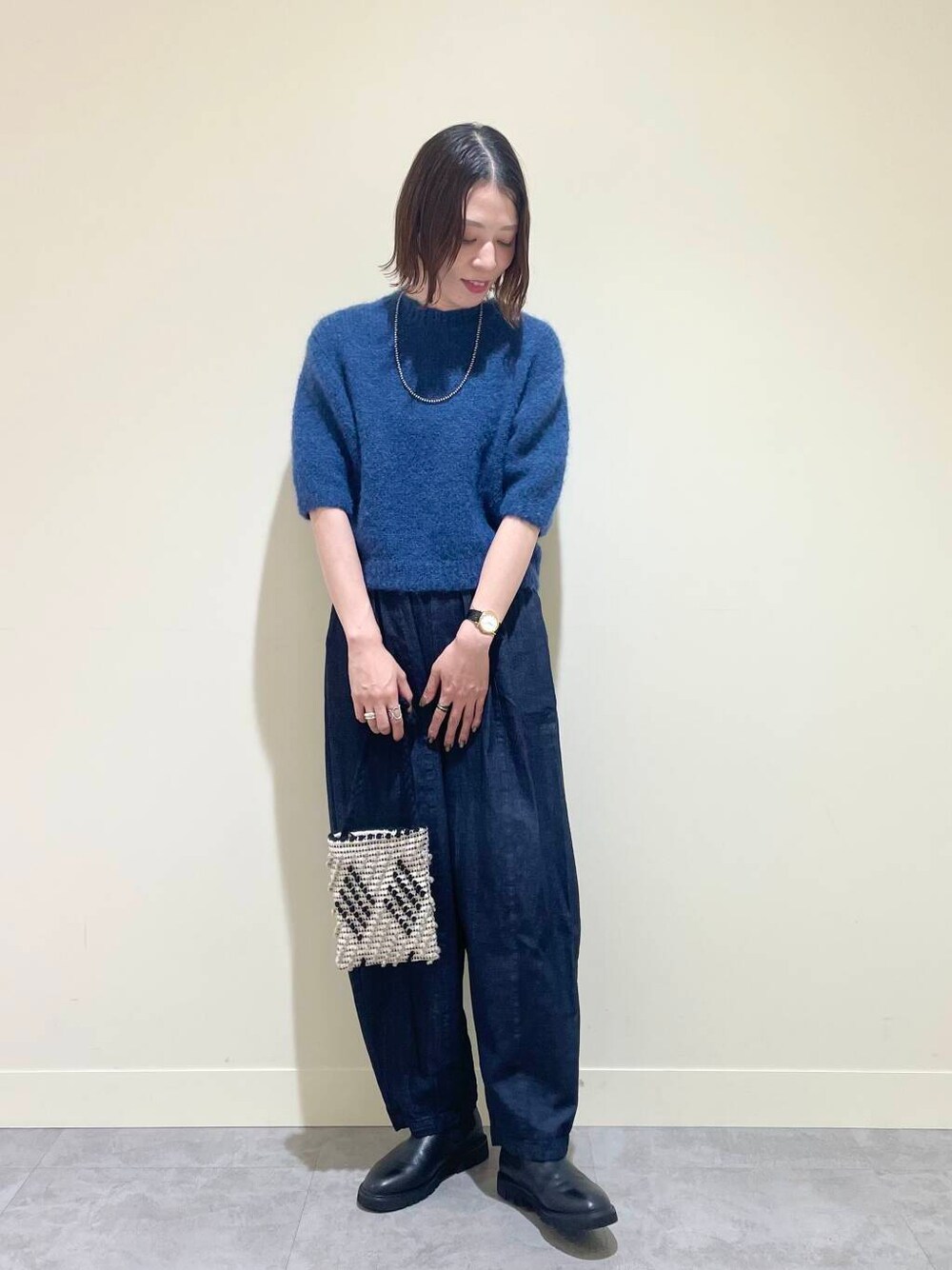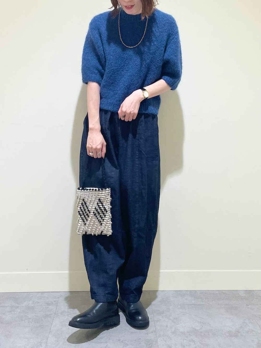 BLUEのカラーがとっても可愛いふんわりした素材感のハーフスリーブのニットです!肘は隠れる袖丈です。襟元の程よい詰まり具合とすっきりとした着丈が大人の印象を与えてくれます◎程よくゆとりもあるのでシャツやロンTとのレイヤードスタイルもおすすめで、そうすることで冬場も着用頂けますよ〜!