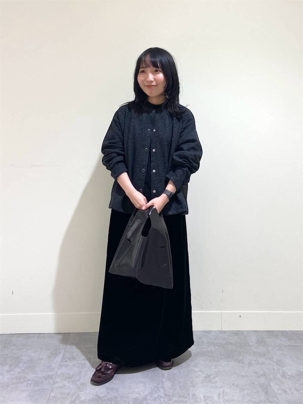 すごく軽いので室内での防寒対策としても重宝しそうです!ボタンがガラス調だったり、どこか上品さも漂う大人好みのデザインなので、カジュアルになりすぎずに着られますよ*