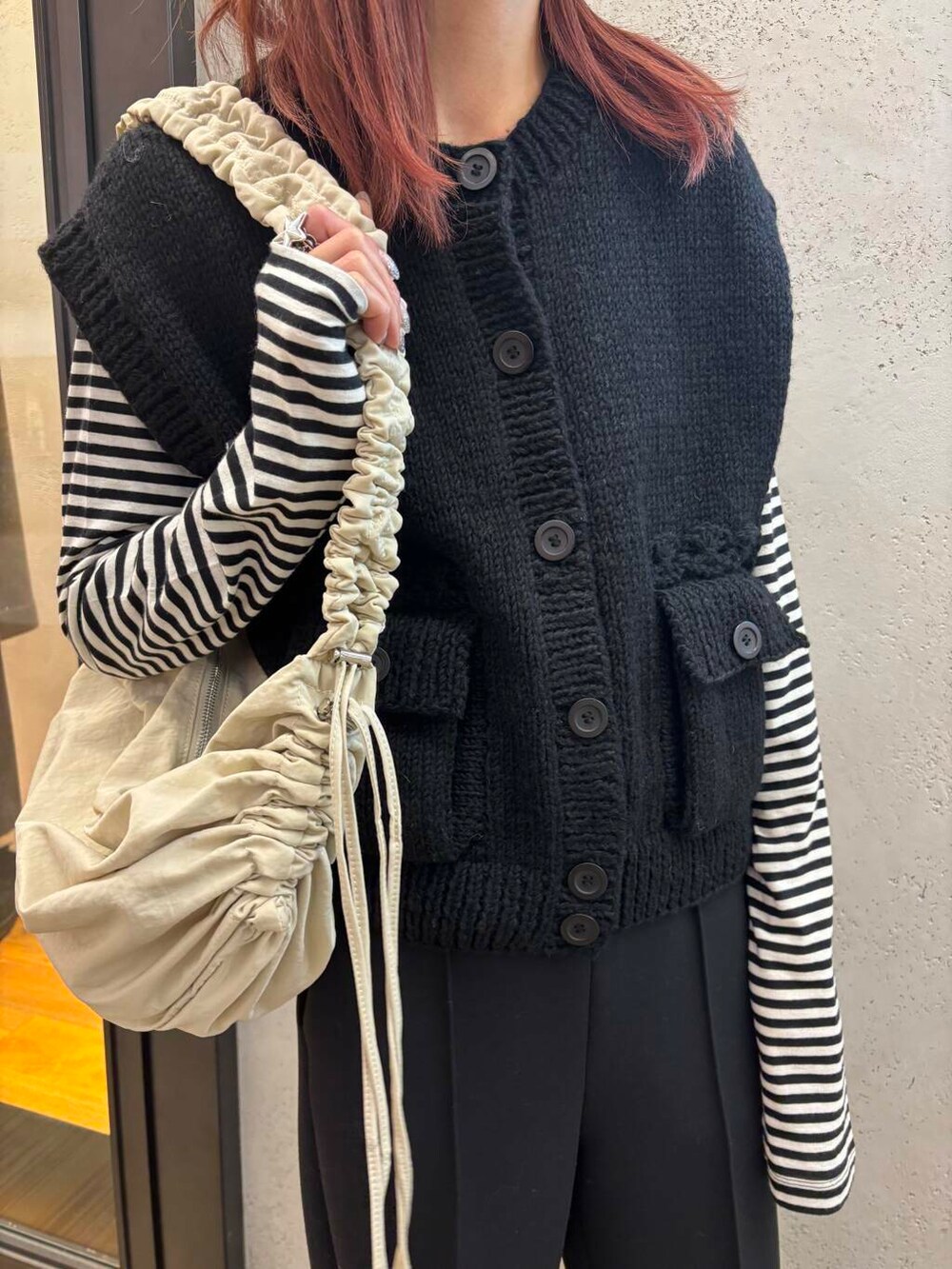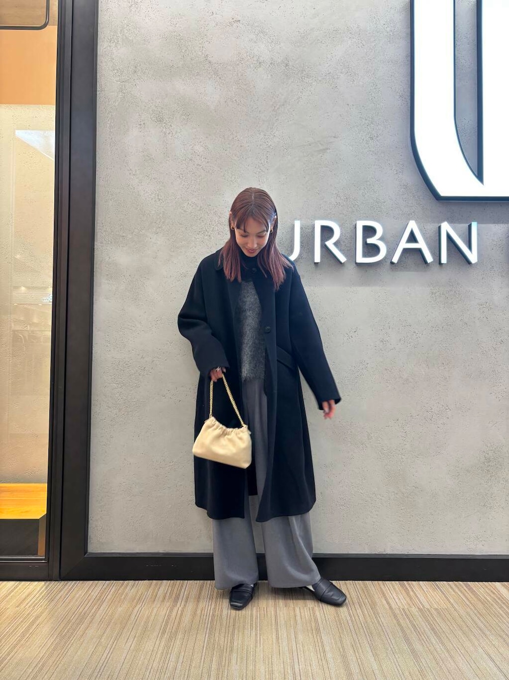 中に厚手のニットを着込むことができるゆとりのあるサイズ感ながらもすっきり見える形です!