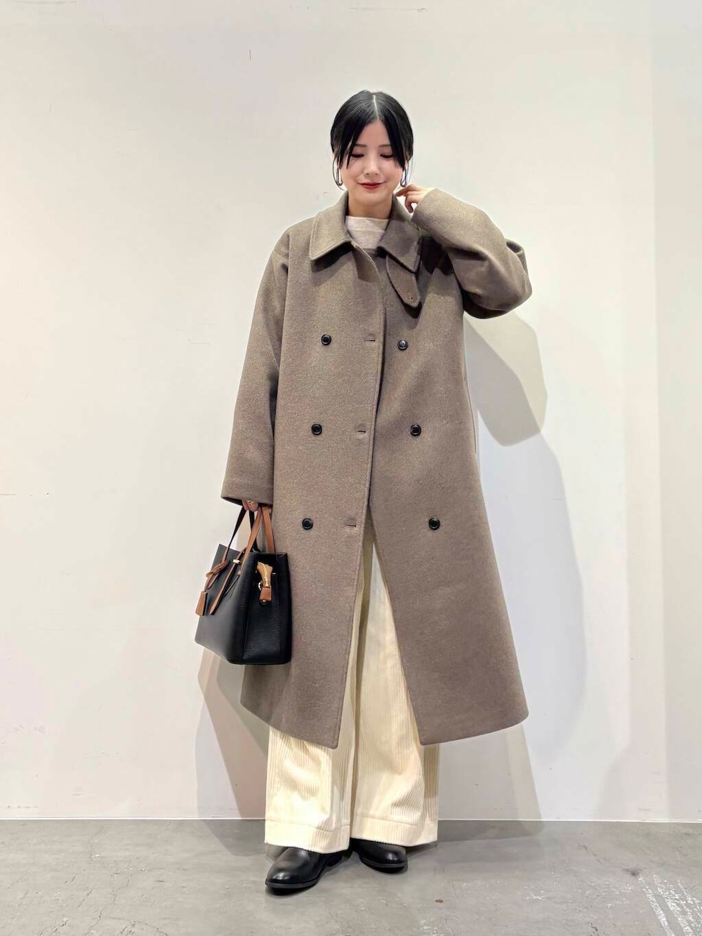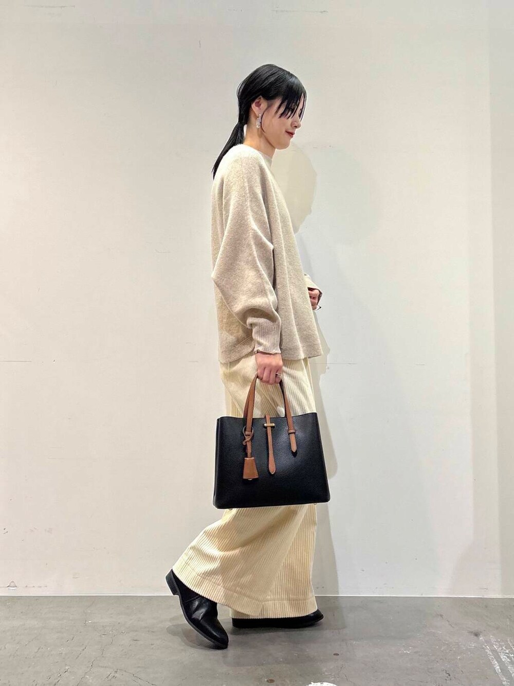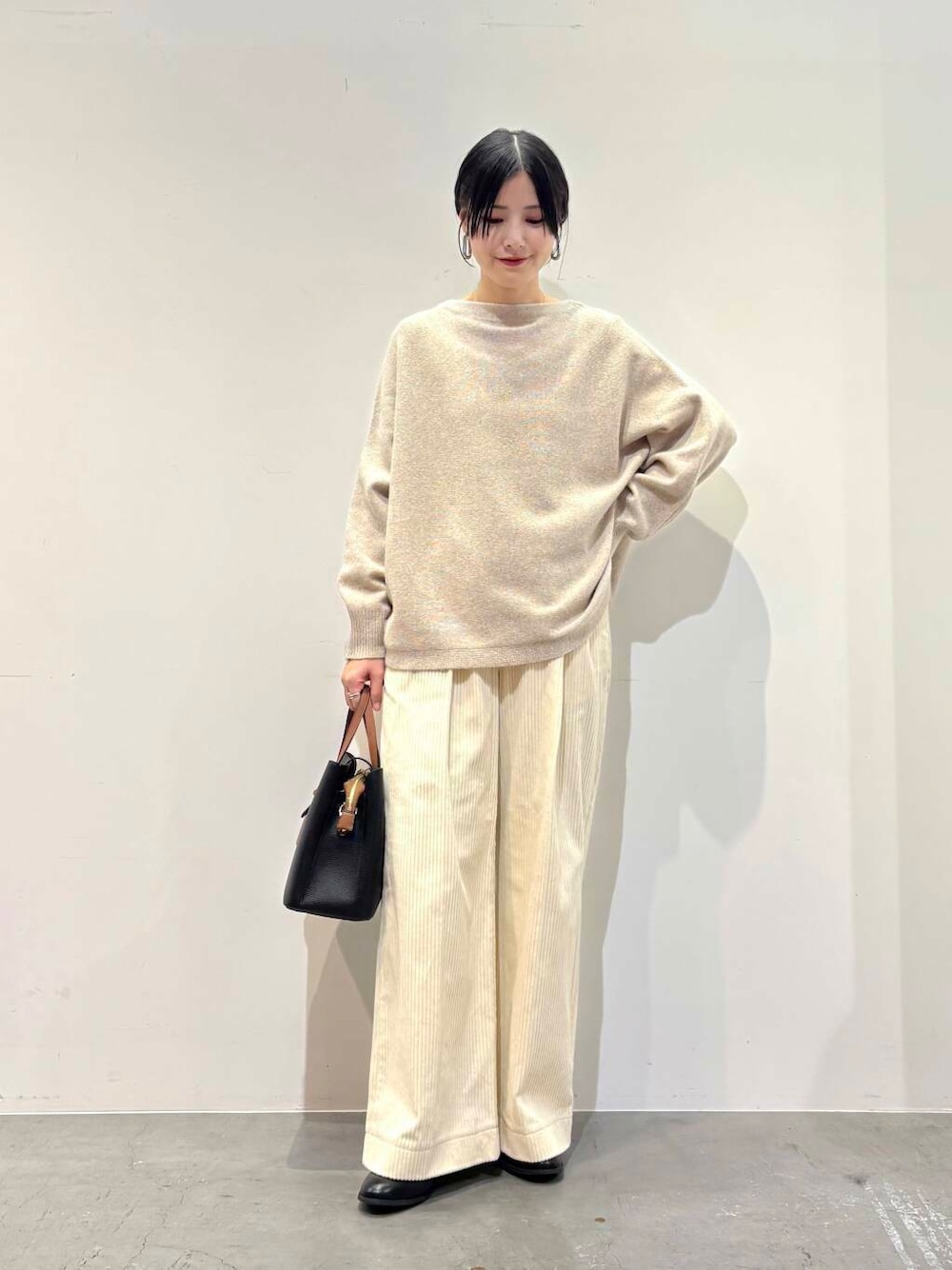 ニットとパンツはベージュ系でまとめたワントーンに。