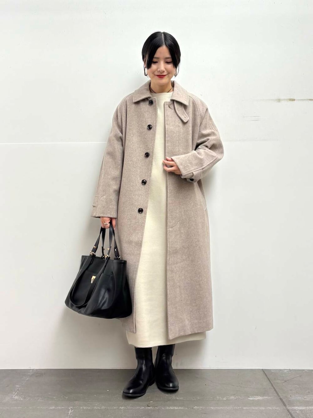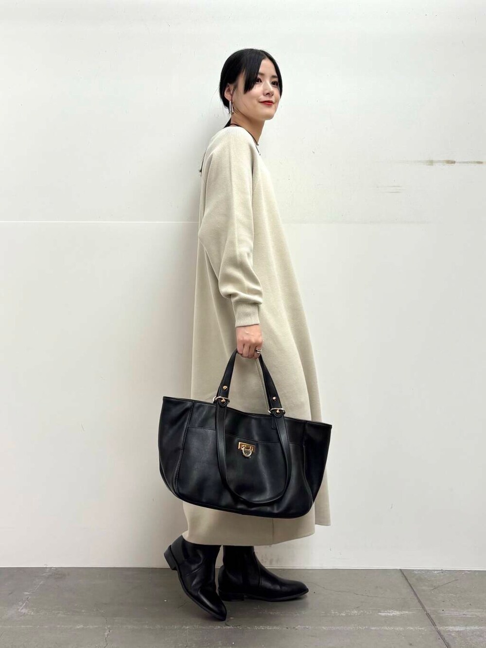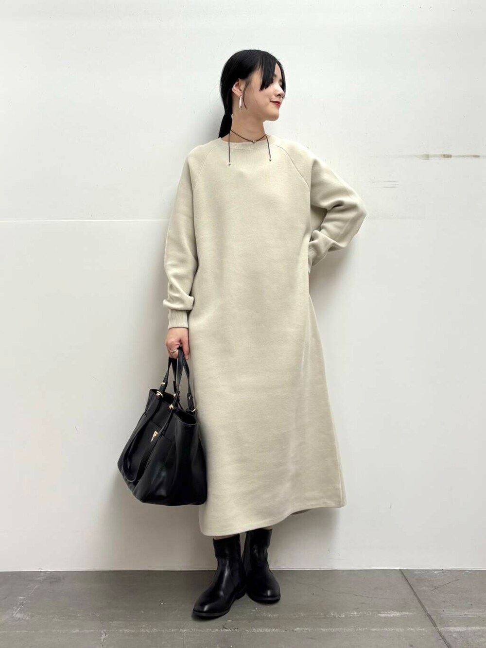 ワンピースはスウェットライクな素材感で、身体のラインを拾わず楽にお召しいただけます!