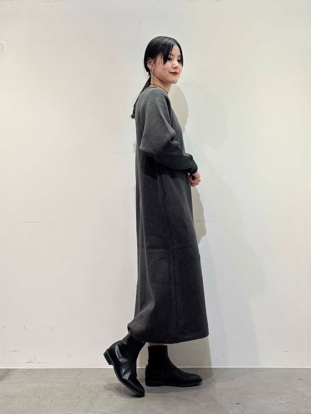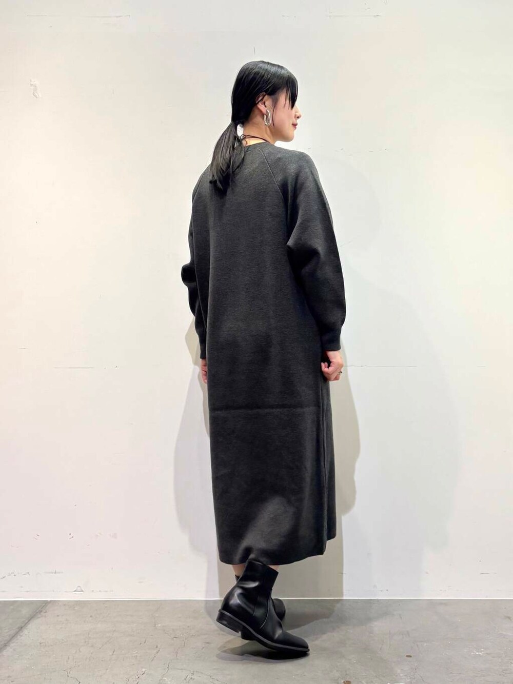 ワンピースはしっかりとした素材感でストレートなシルエットが大人カジュアルな印象に。