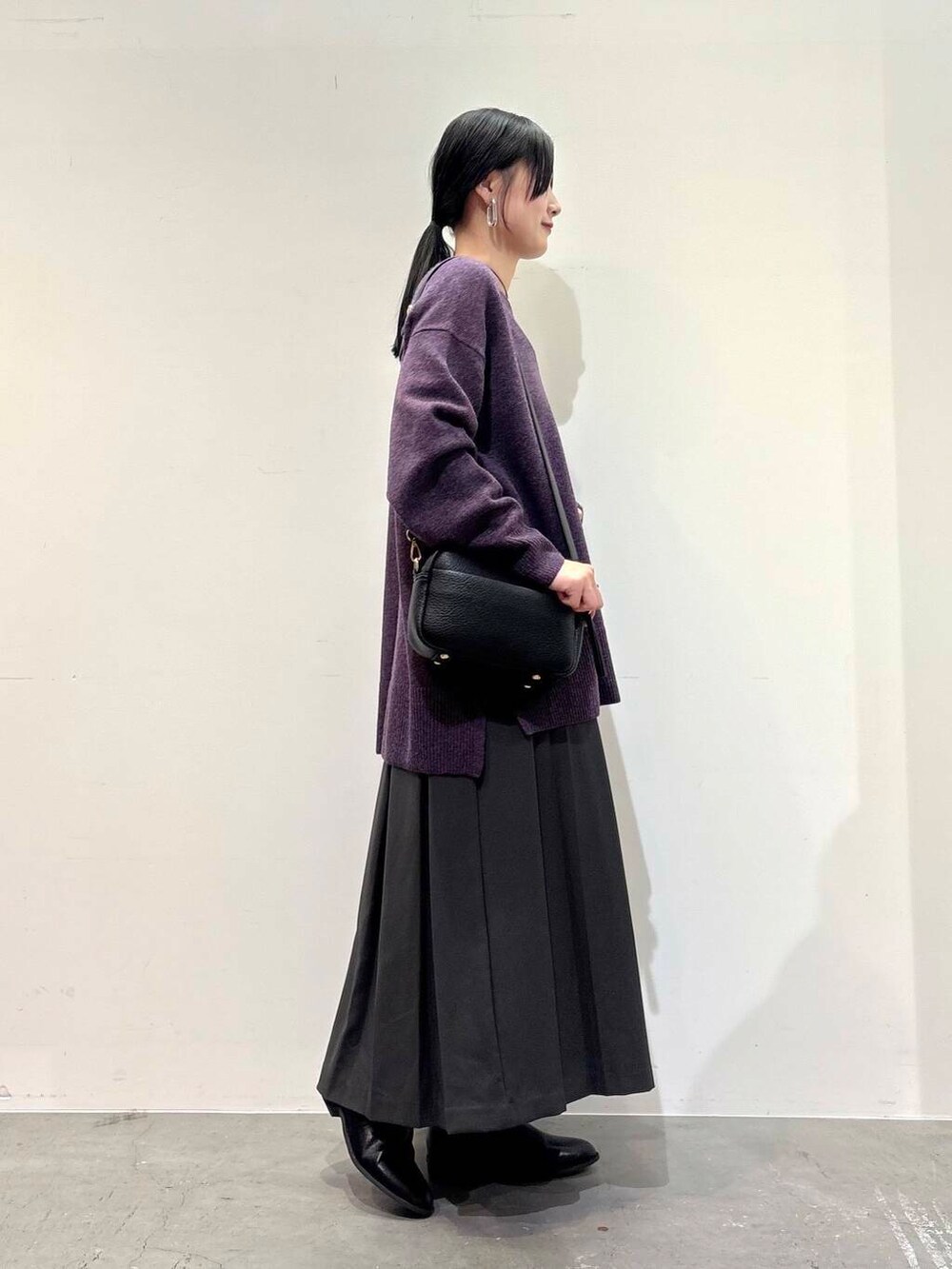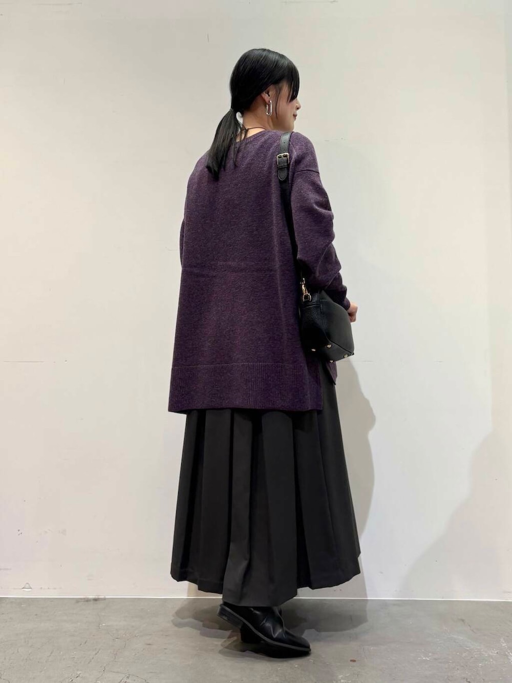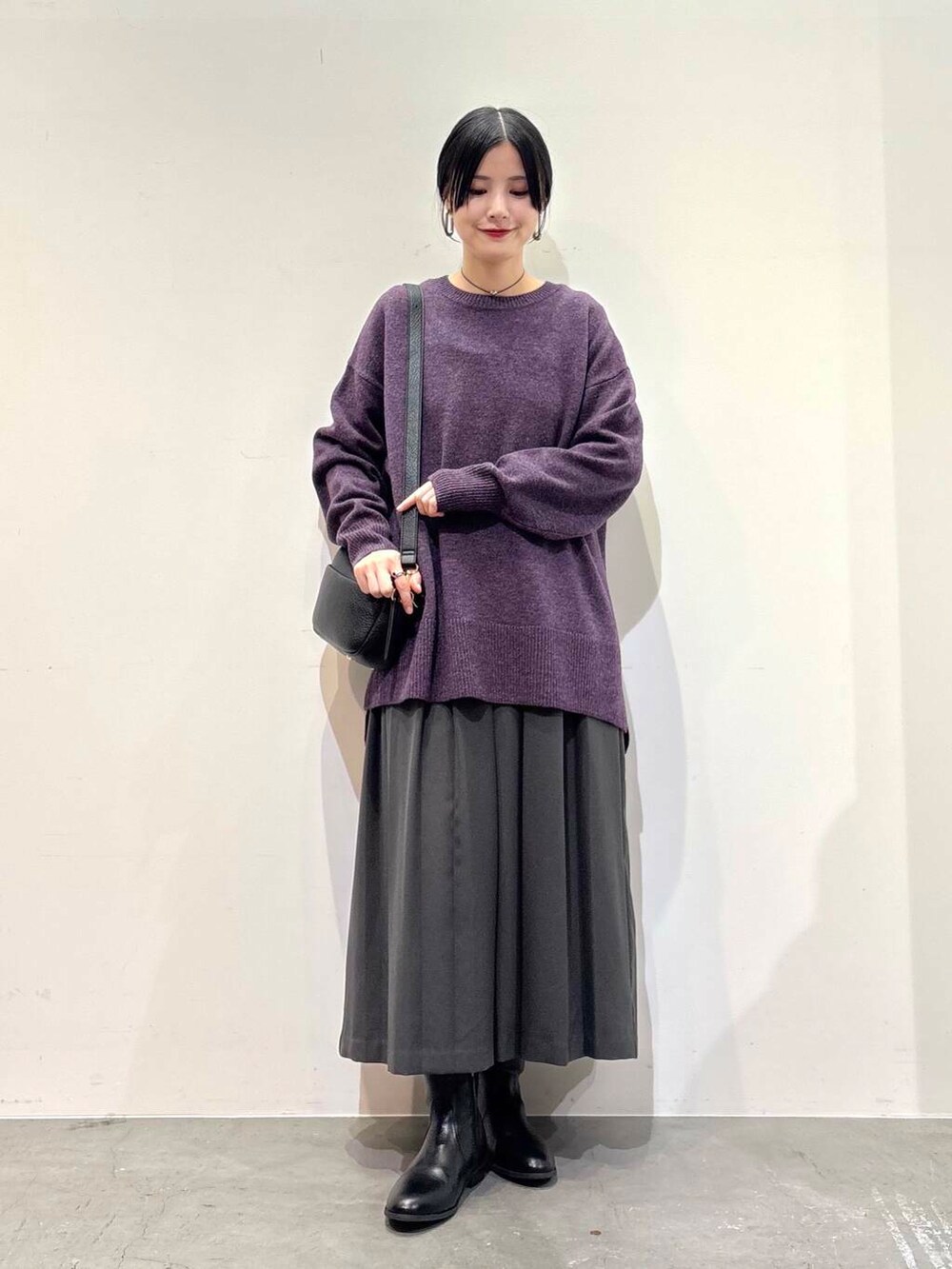 ニットは落ち着いたパープルのカラーが◎