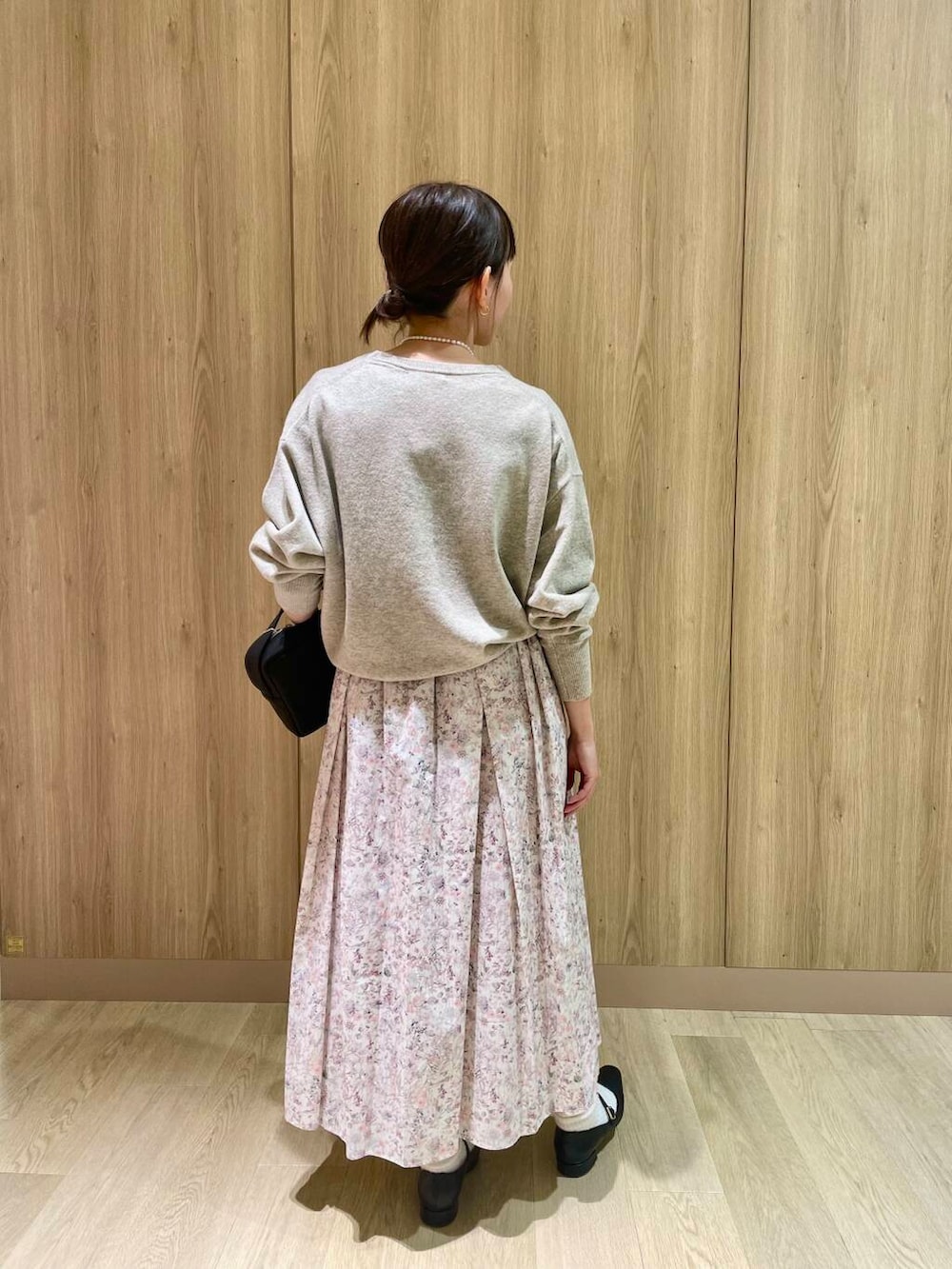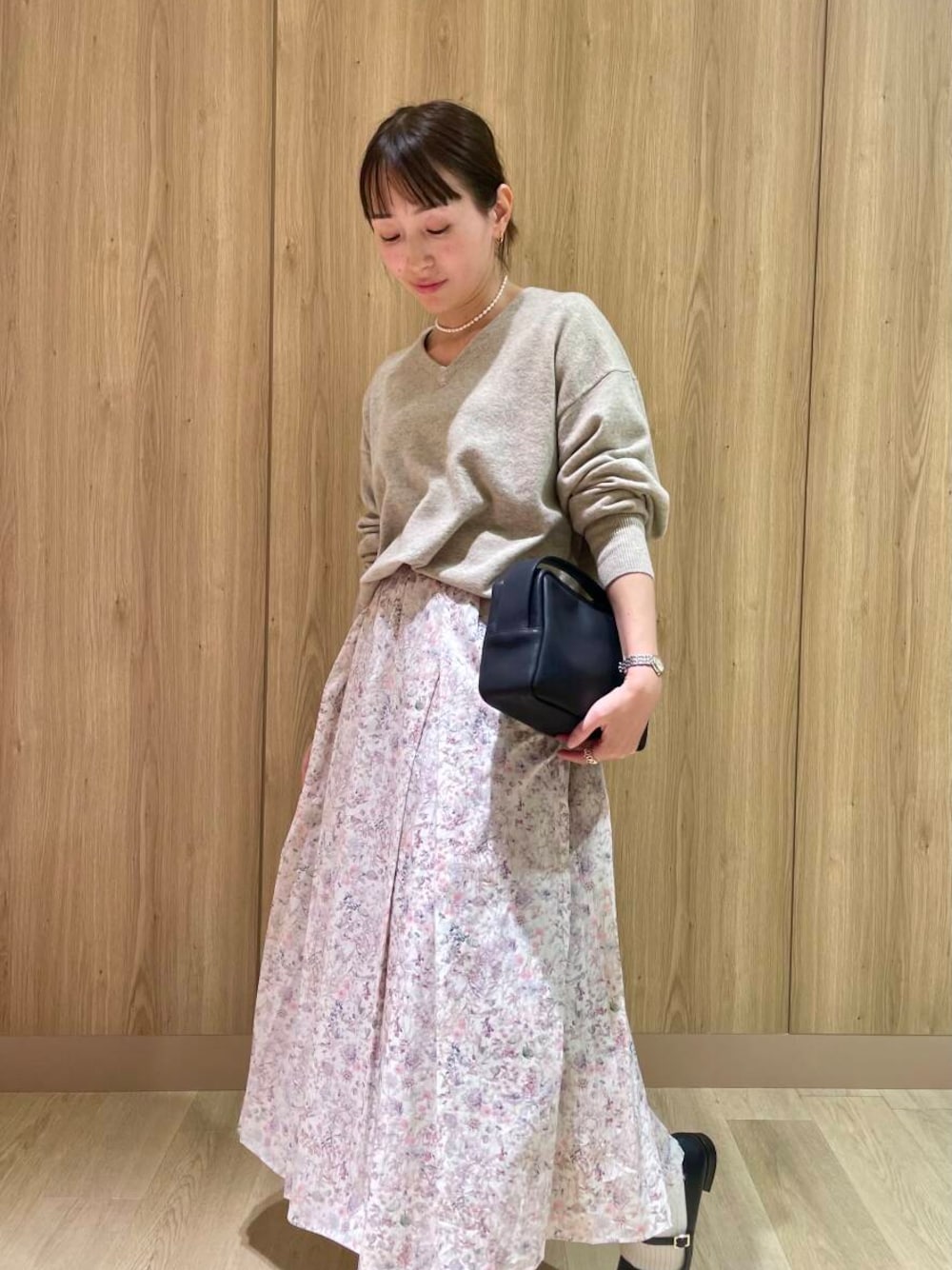 推しのセールアイテムと優しいカラーのリバティスカートを合わせた、肌寒い春にもオススメのコーディネートです。