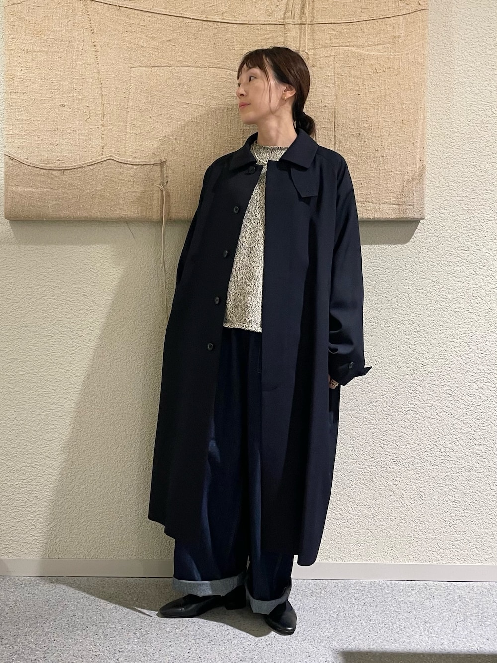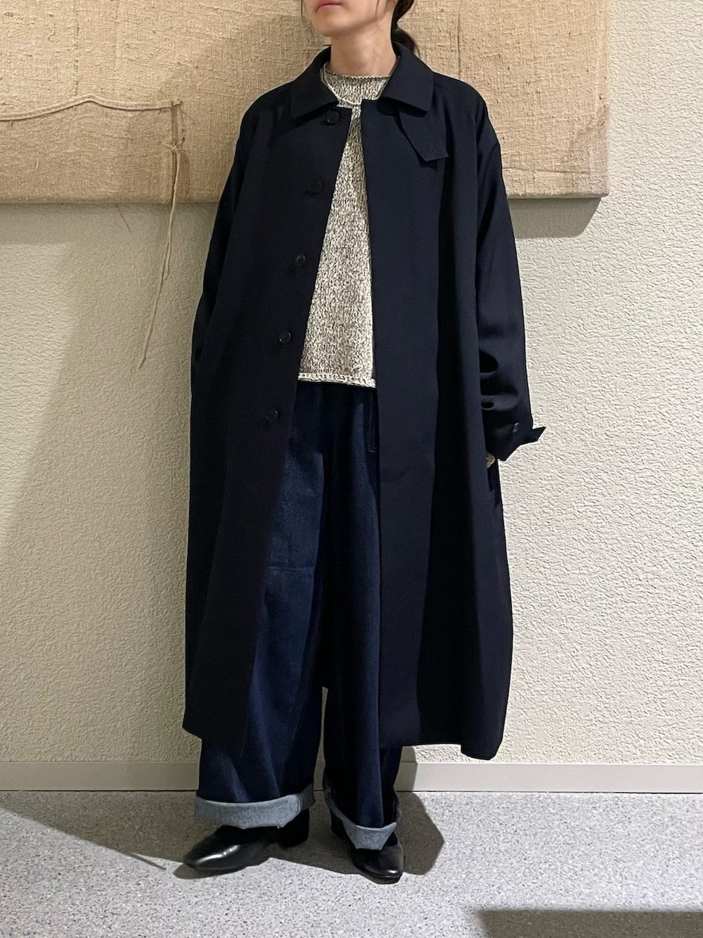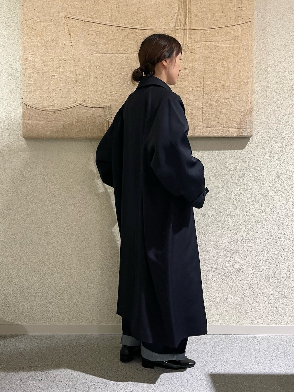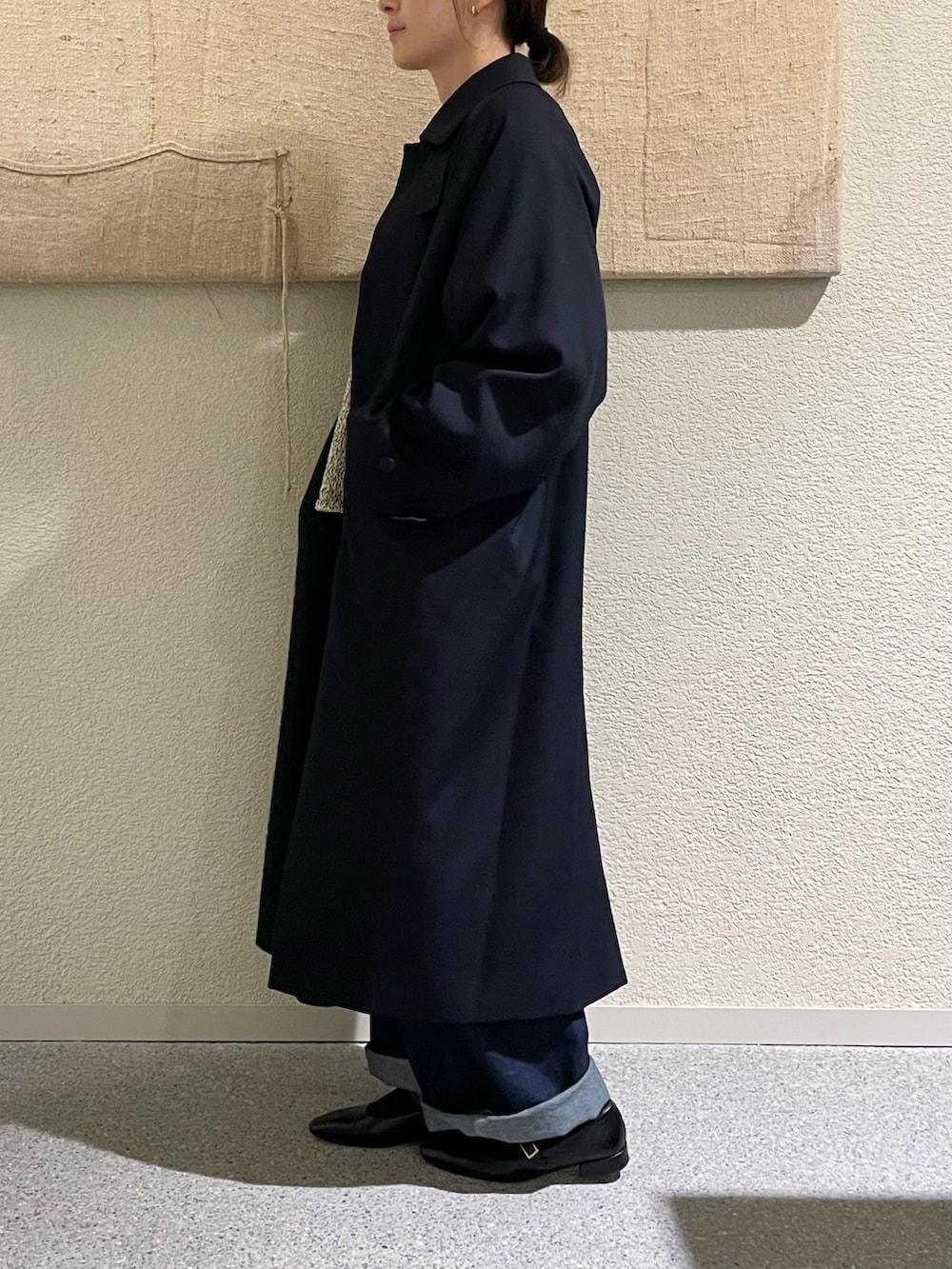 ウーステッドウールコート、NAVYがとーても深みのある上品なお色。ボトムをペインターパンツとロールアップでカジュアルに合わせましたが、こちらのコートを合わせると、とっても大人の雰囲気にしてくれます✨