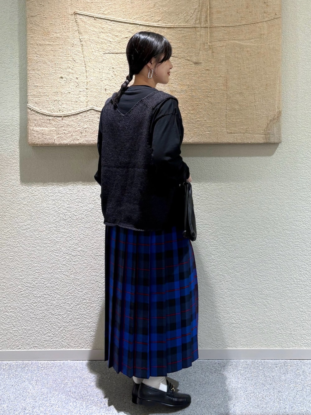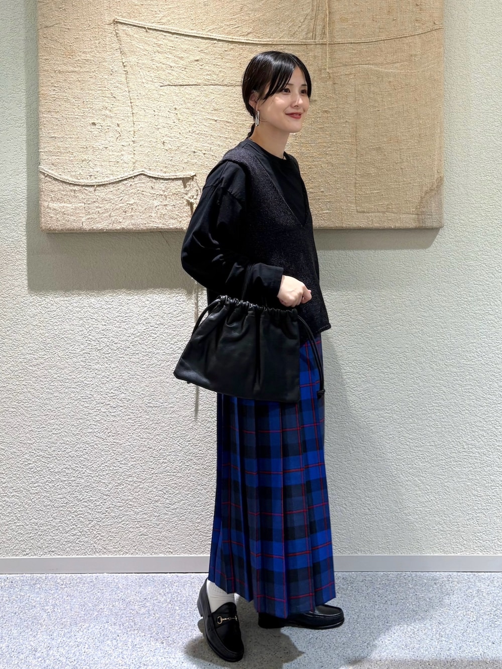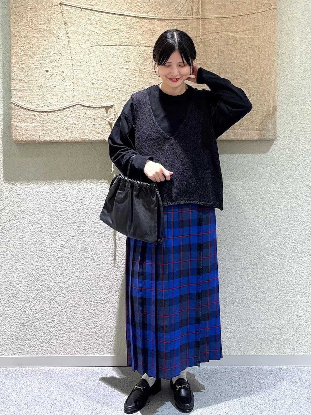 ・オールブラックのトップスにチェック柄スカートを合わせてコントラストを演出