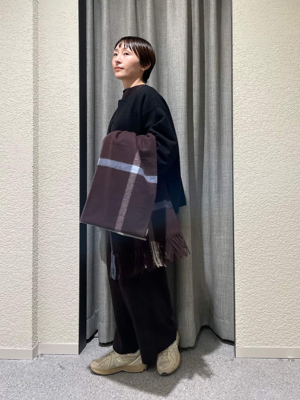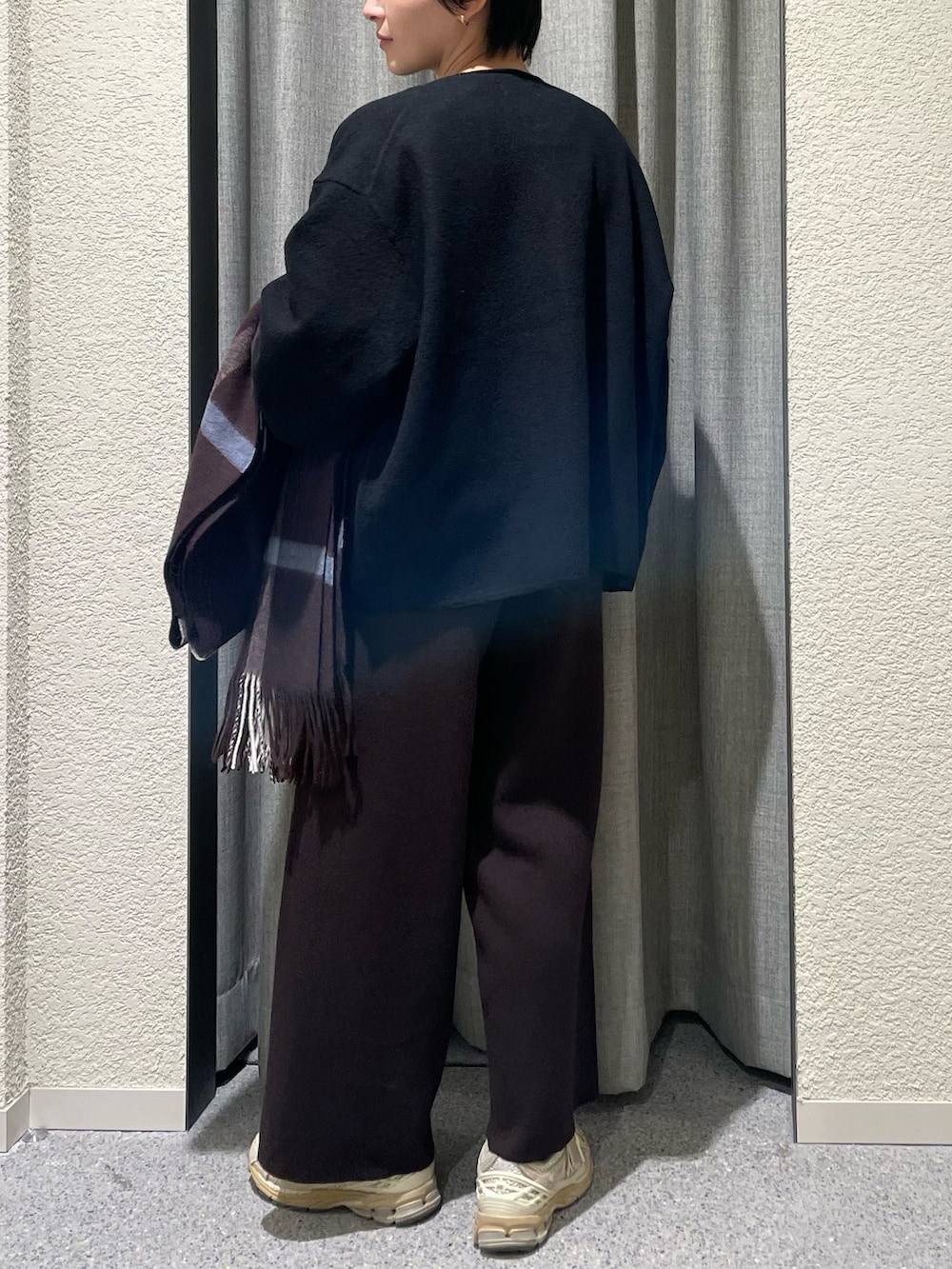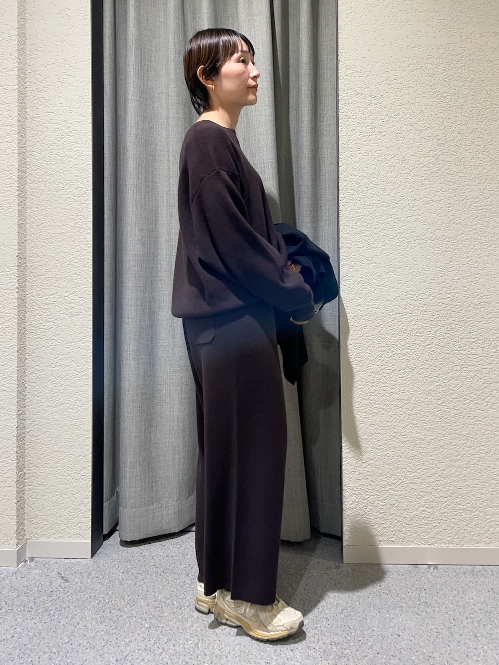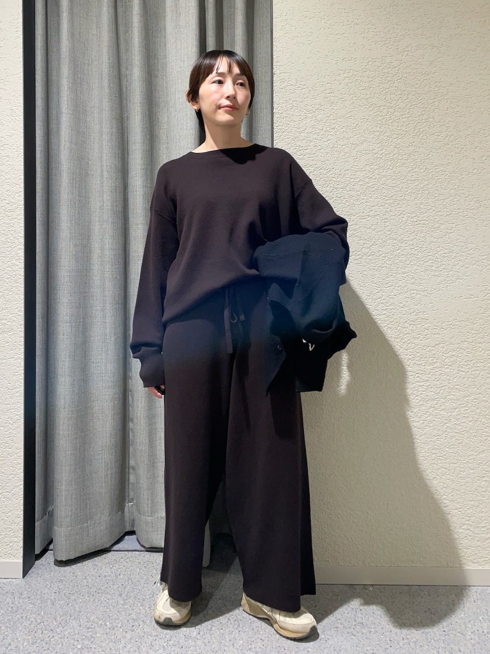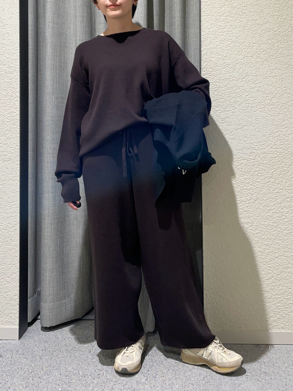 私も昨年セットアップで購入した、コットンカシミヤ生地、綿95% カシミヤ5%でなかなか気温が安定しない時期に重宝します。重ね着次第でかなり着用期間長く活躍します!スウェットのようなリラックスしたデザインながらクリアなニット生地がきちんと感も与えてくれて大人のリラックスセットアップです!私は旅行でも活躍しました。