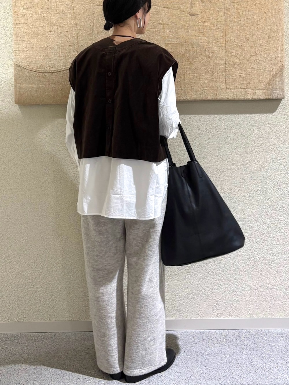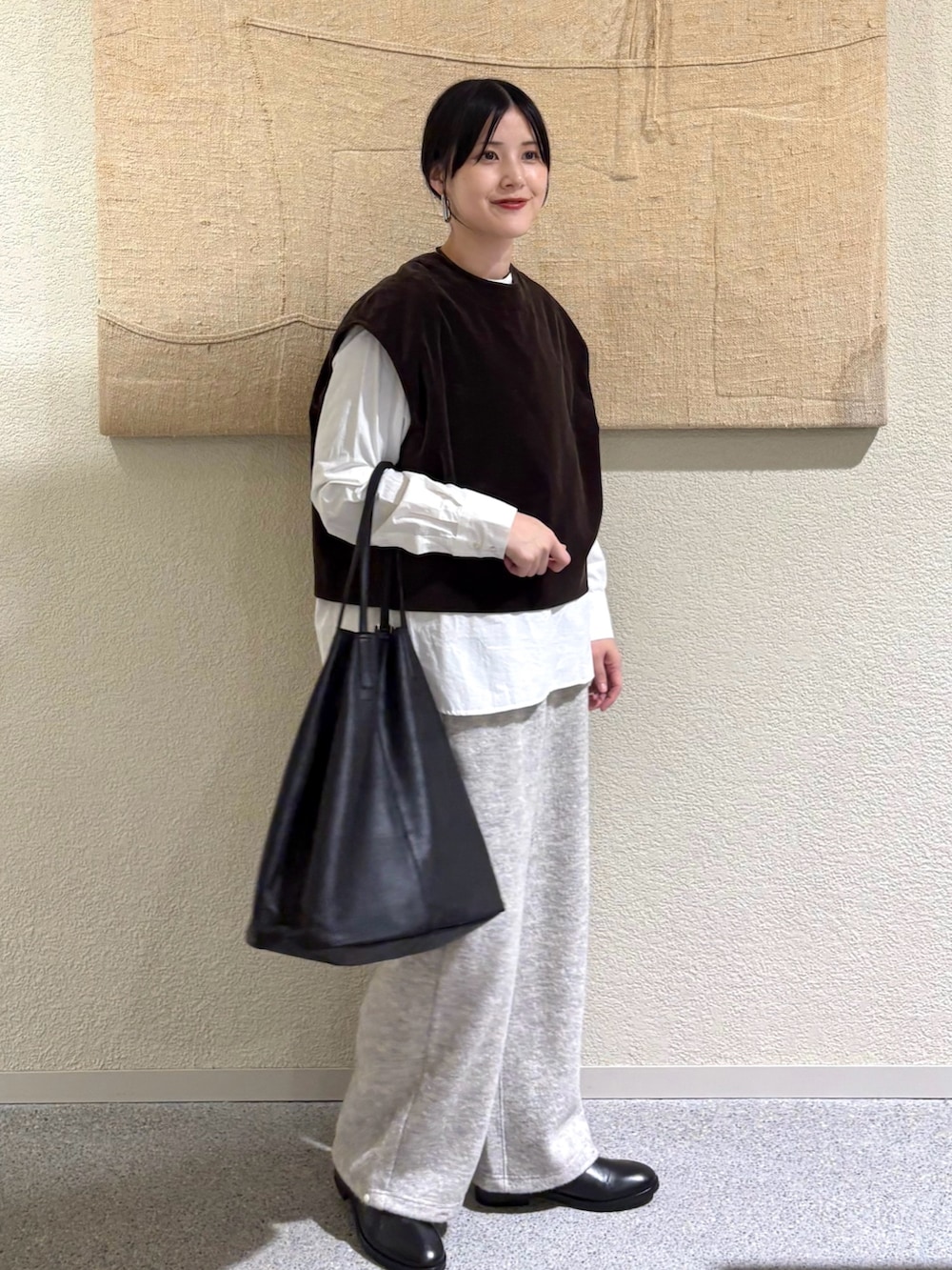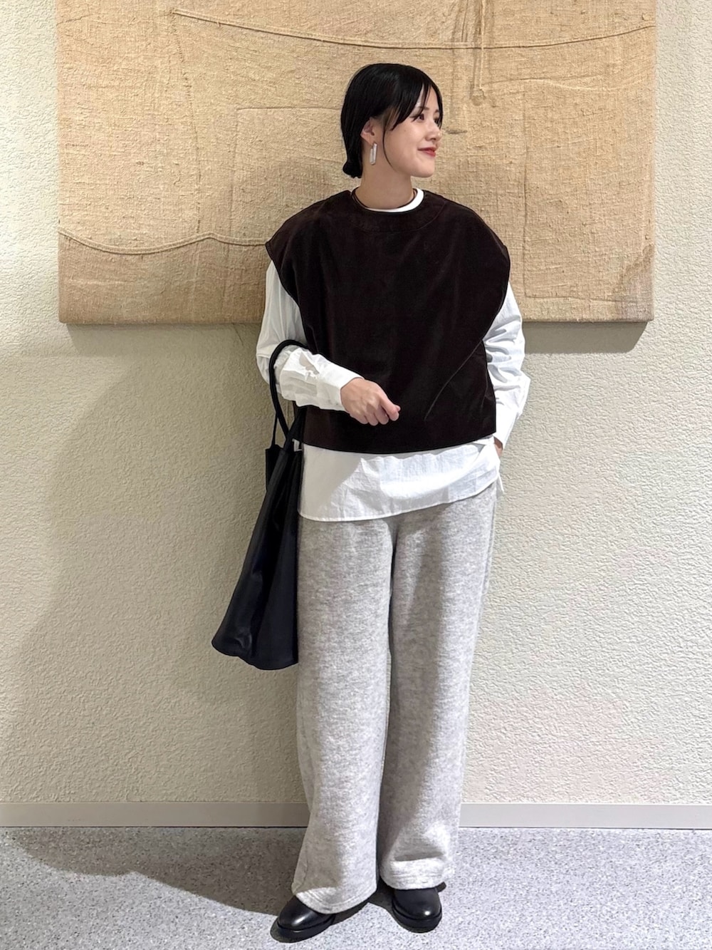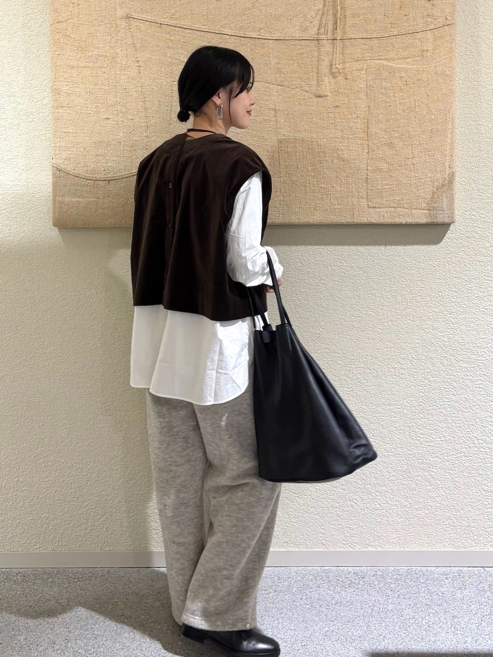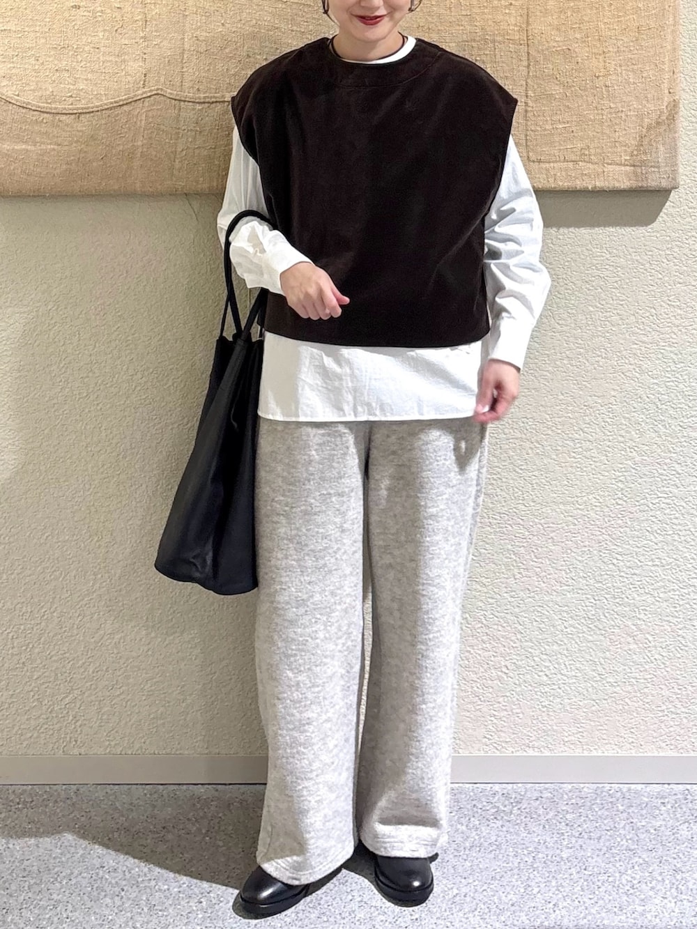 ループ感のあるウール素材を使用したリラックス感のあるイージーパンツ。軽やかな着心地ながらも保温性が高く、上品な風合いが特徴です。ライトグレーのカラーが柔らかく、全体の印象を明るくまとめてくれます。