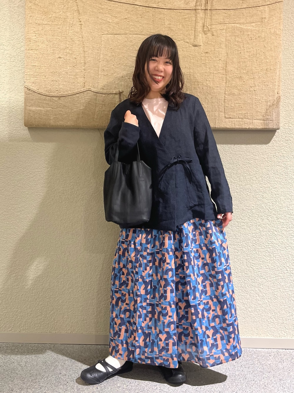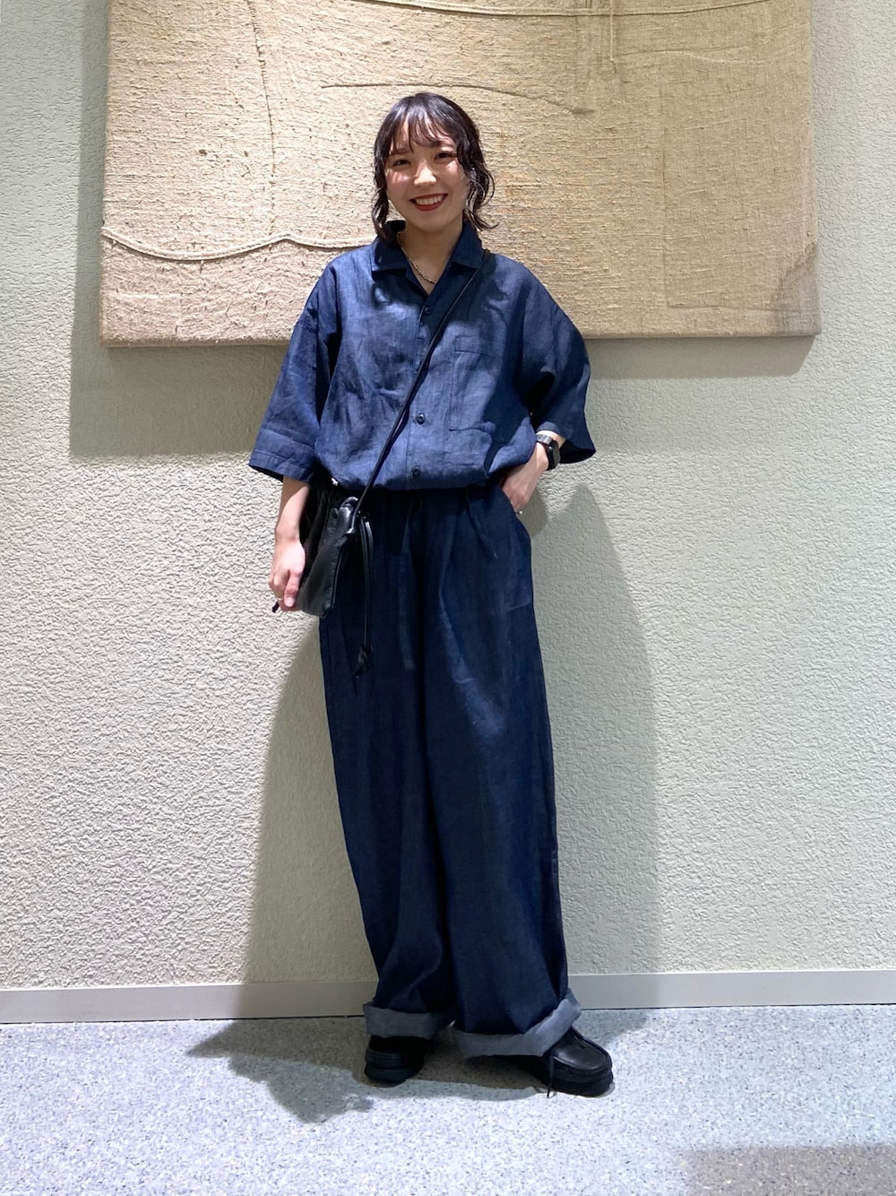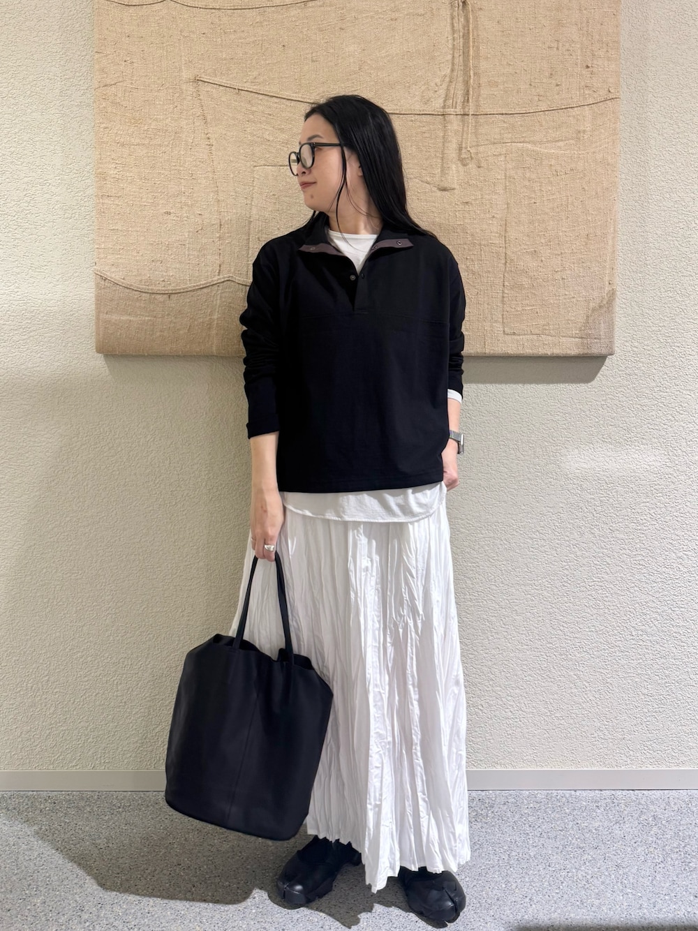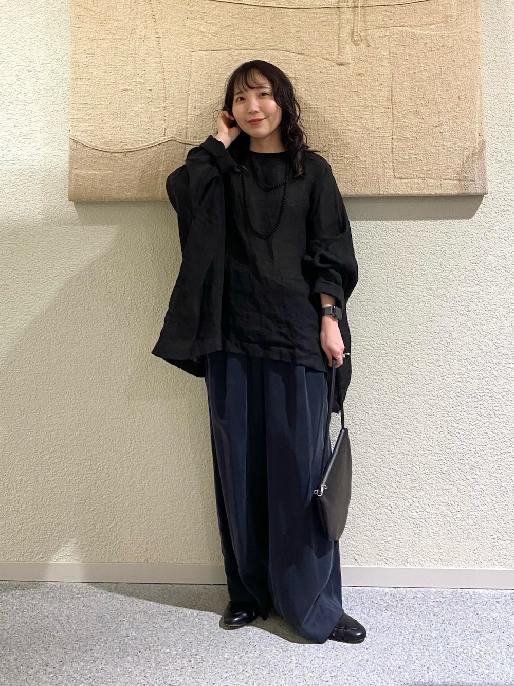 身幅は程よくゆとりがありますが、着丈は短めで、太めのシルエットのボトムスや、ハイウエストのボトムスとの相性がばっちりです◎