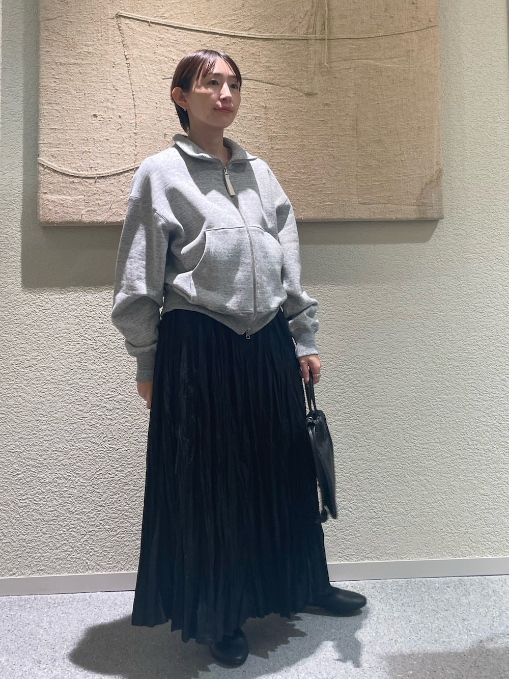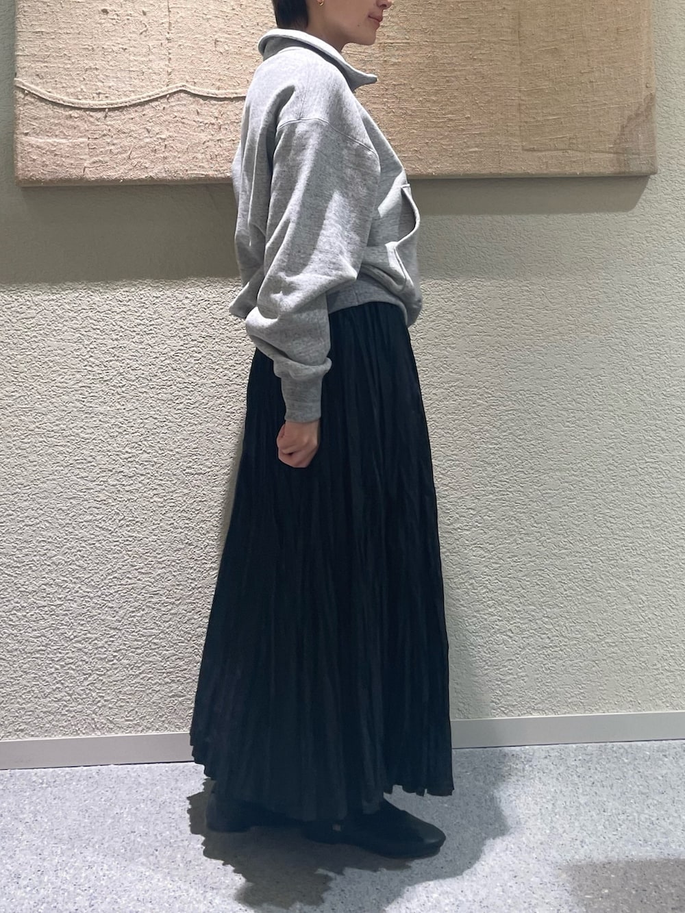 BLACKだと小柄な方は重たくなりがちなのですが、クシュっとした動きのあるしわ加工と綿素材が軽やかさを出してくれるのでオススメです♪