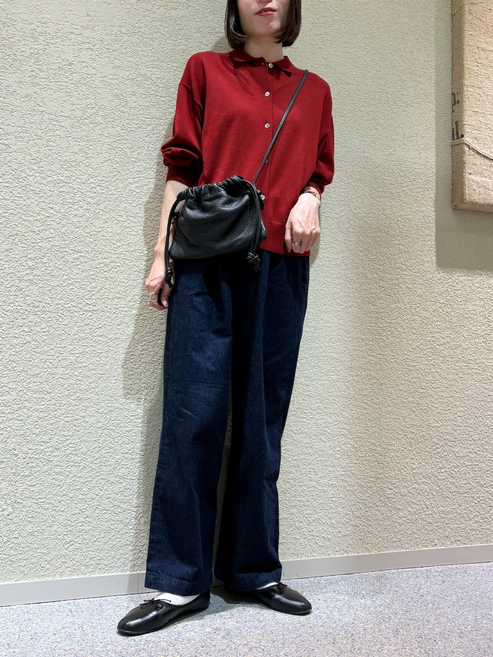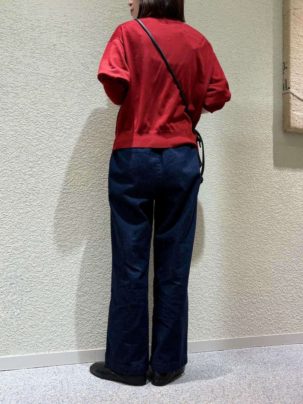 太めのストレートシルエットで下半身のラインを拾いにくく、足を綺麗に見せてくれる形になっています。