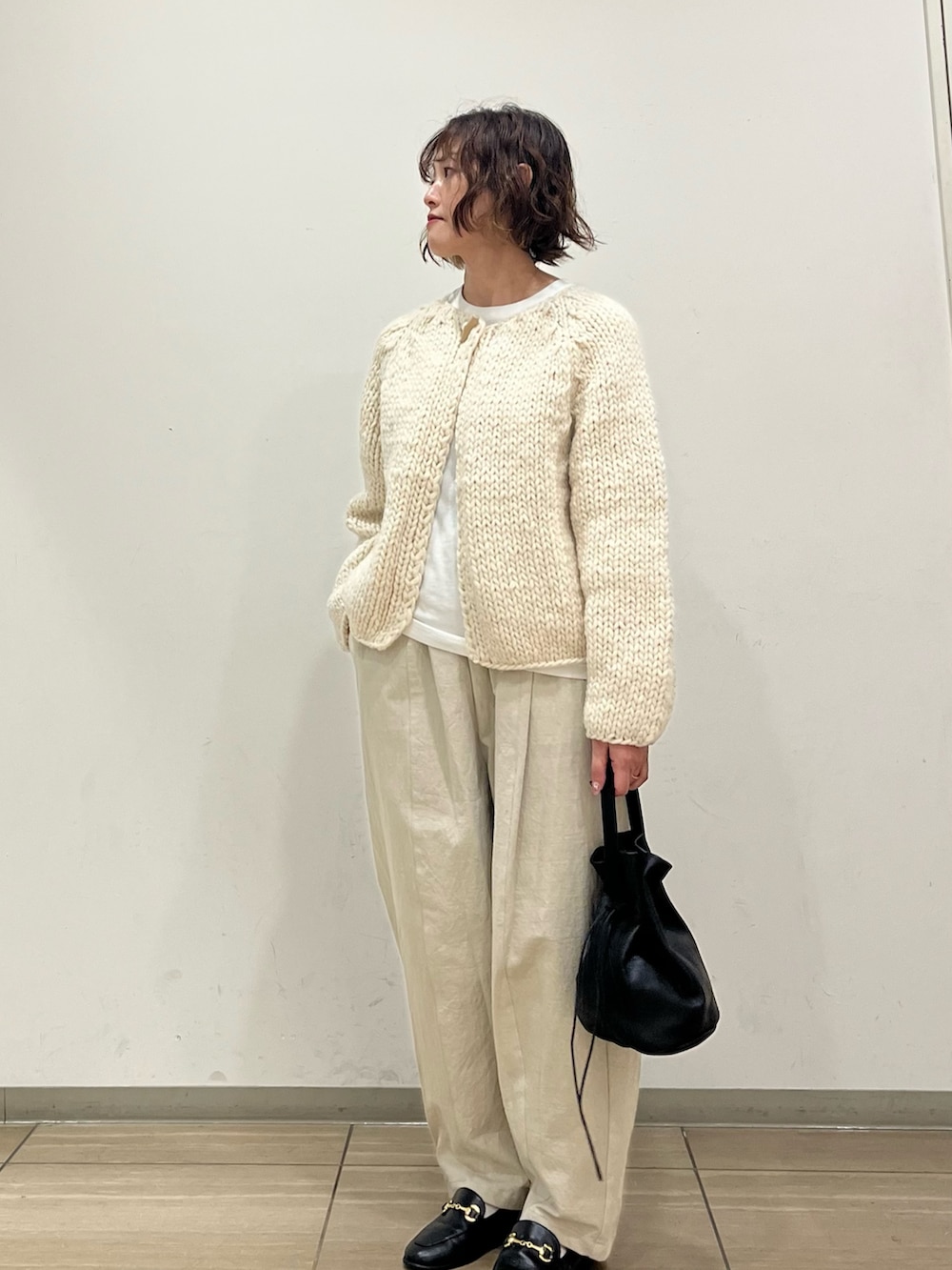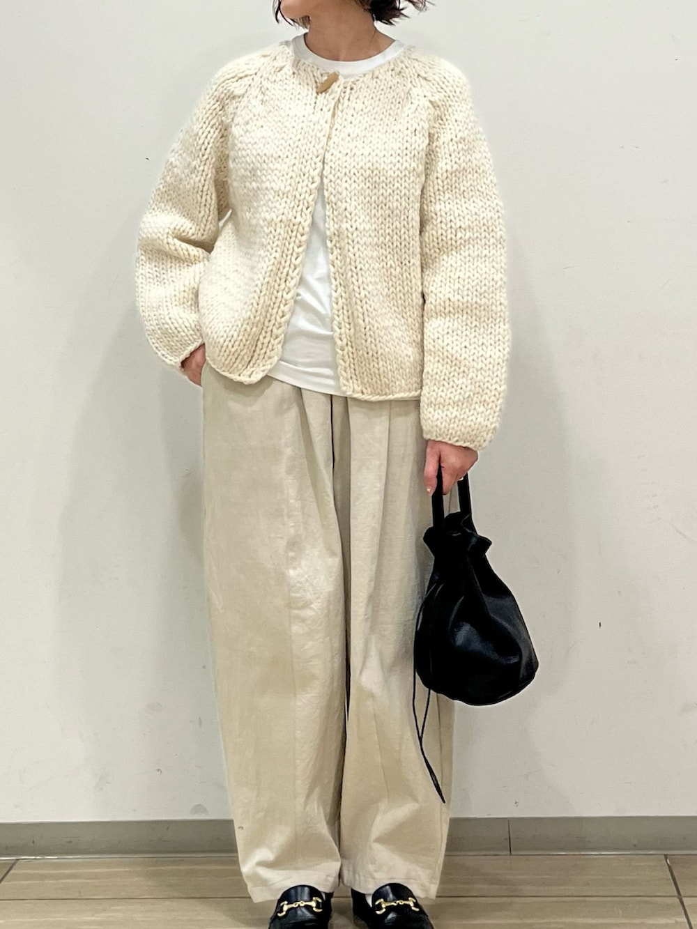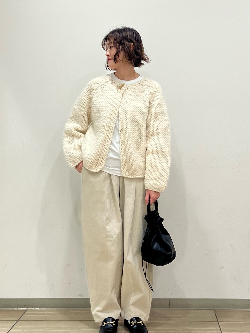 オフホワイトのワントーンコーデ。