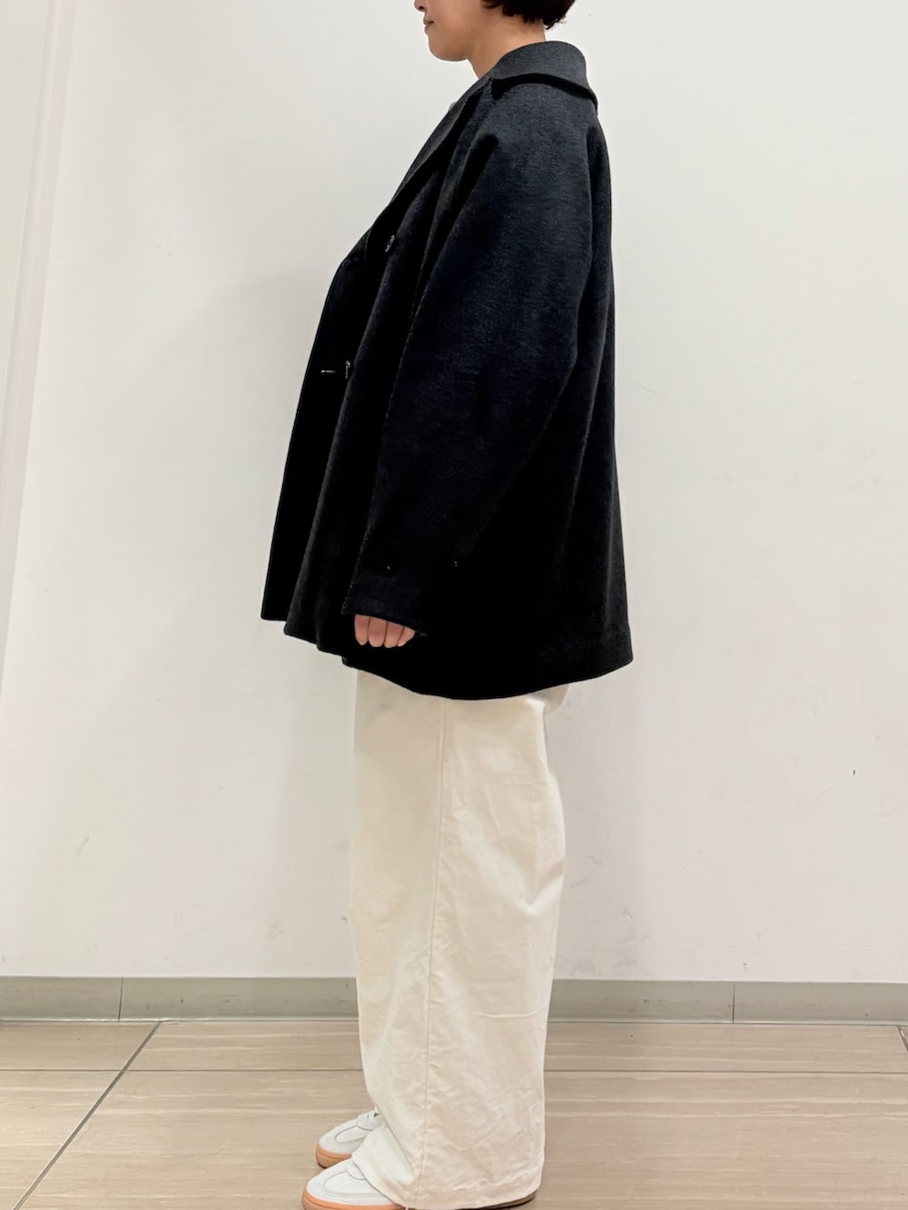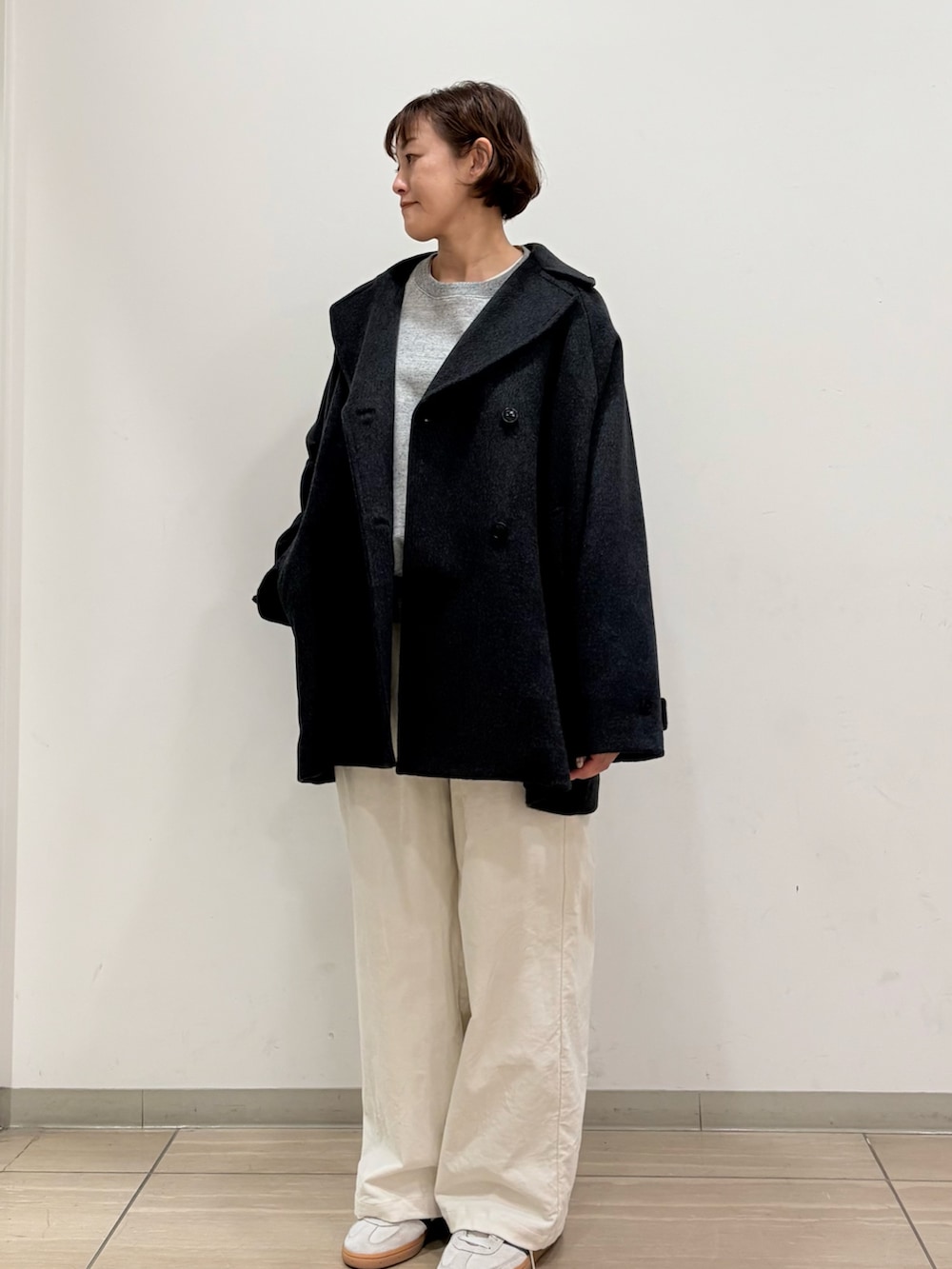 大きめの襟でお顔周りがスッキリとし、程よい抜け感が可愛いコートです。