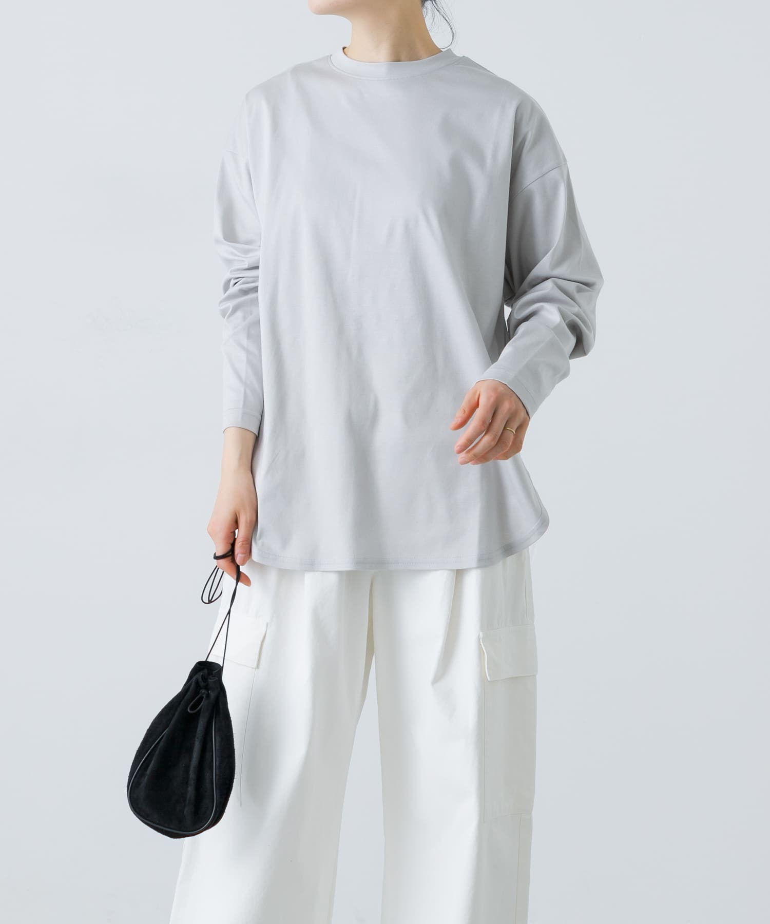 カットソーは少しゆとりのあるデザインなので、体のラインを拾わず、1枚でさまになります。