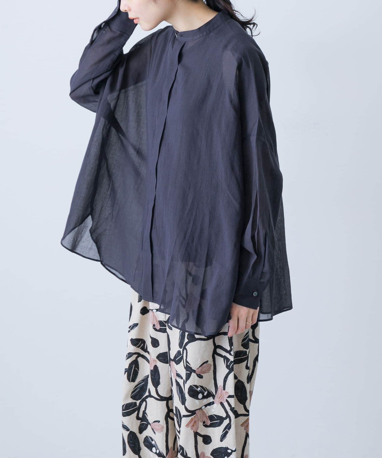 ネイビーのシャツを合わせて、都会的な雰囲気に。