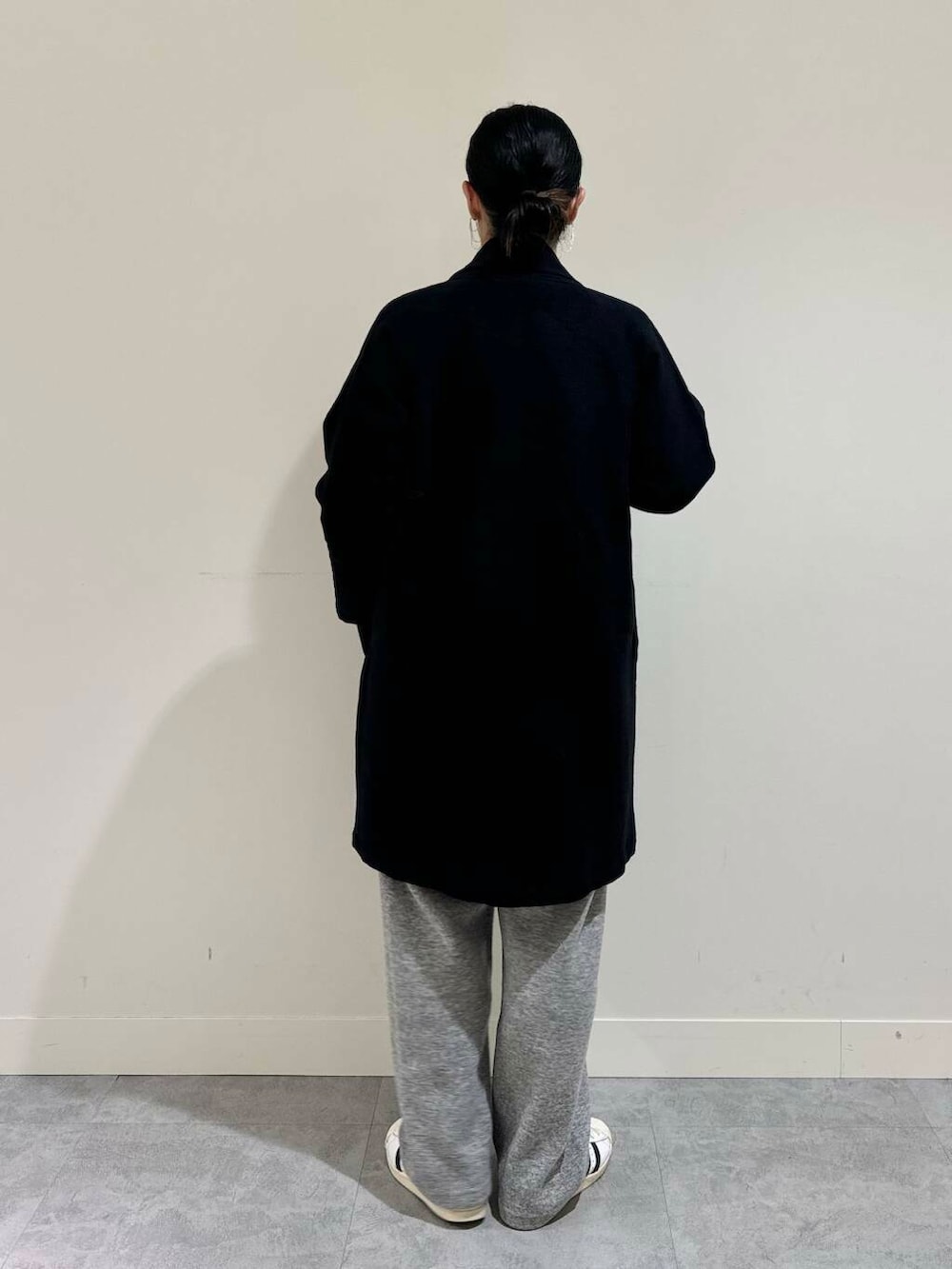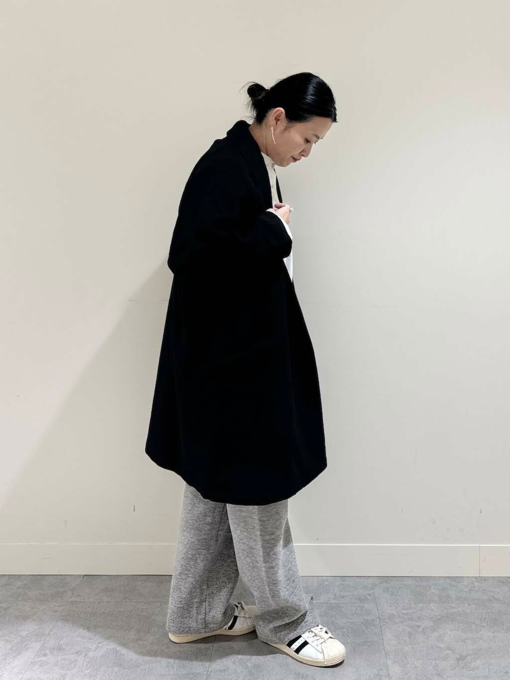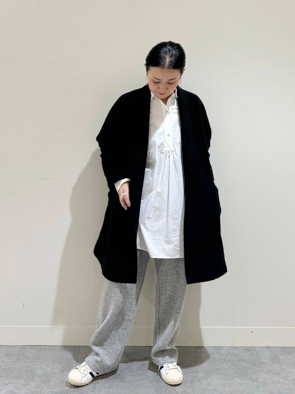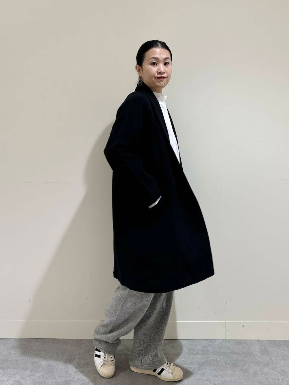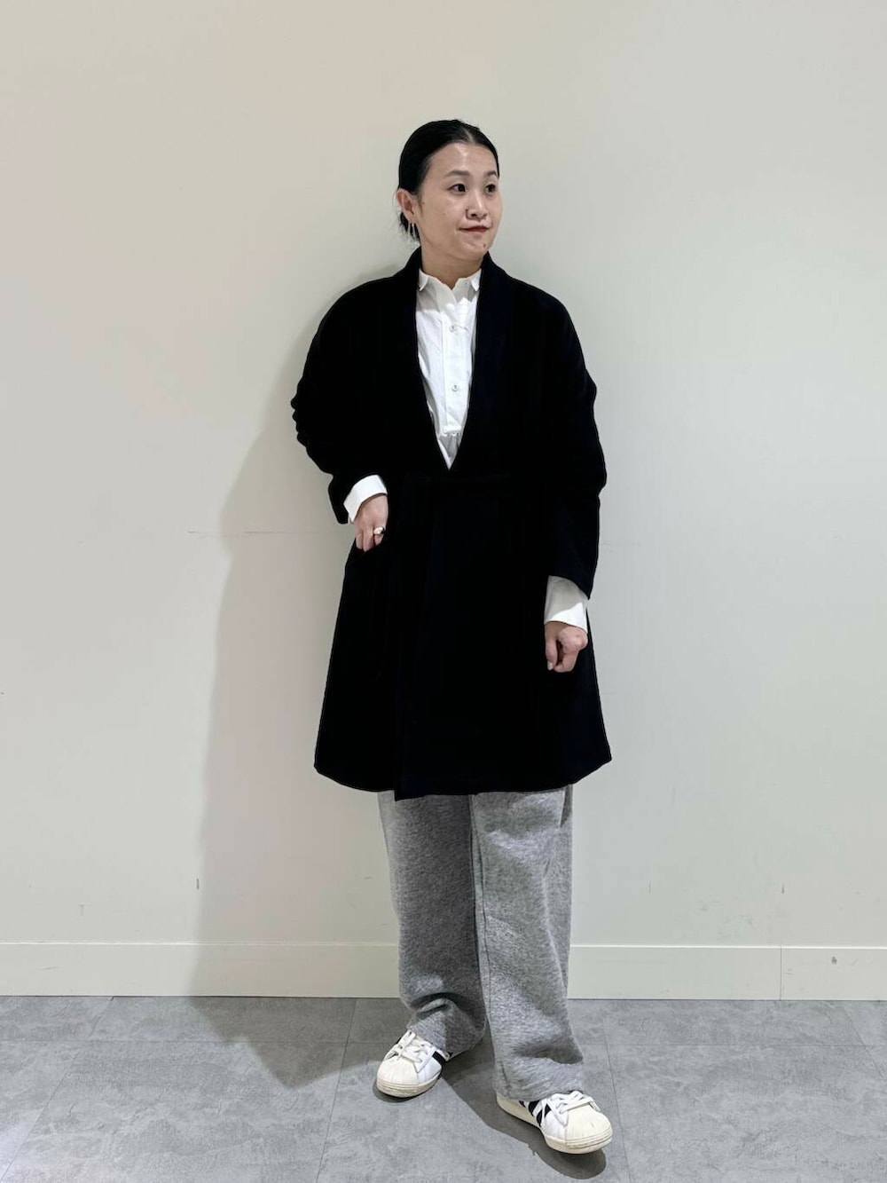 合わせたショールカラーのガウンコートは