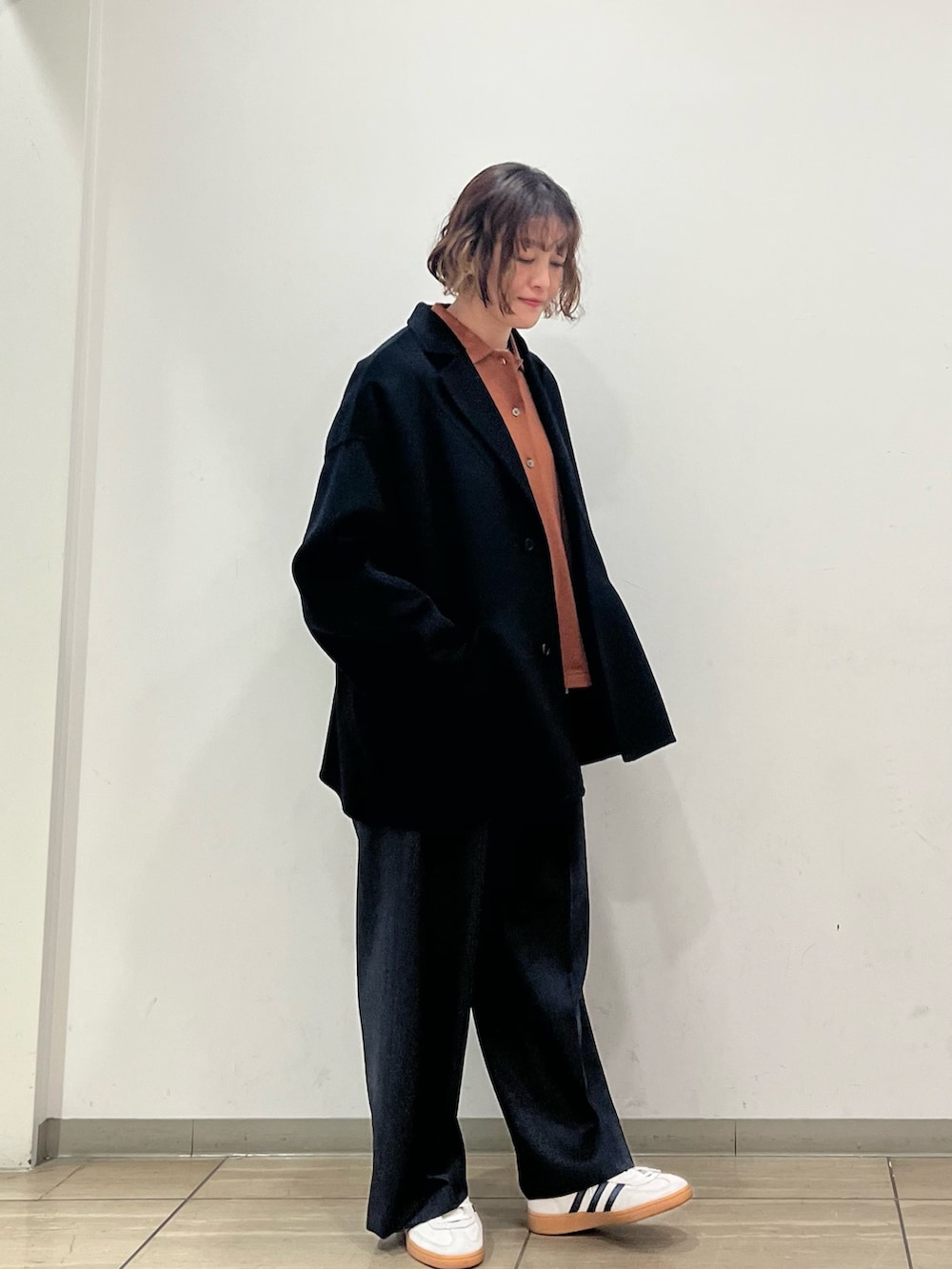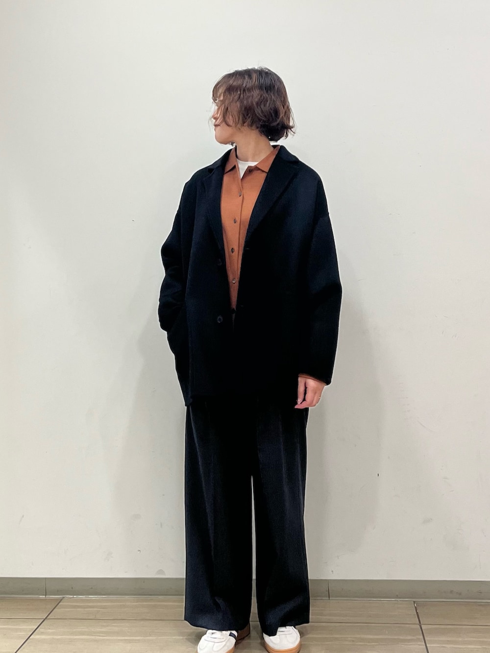 シルエットがキレイなセンタープレスパンツを合わせて、足元はスニーカーで外しました。