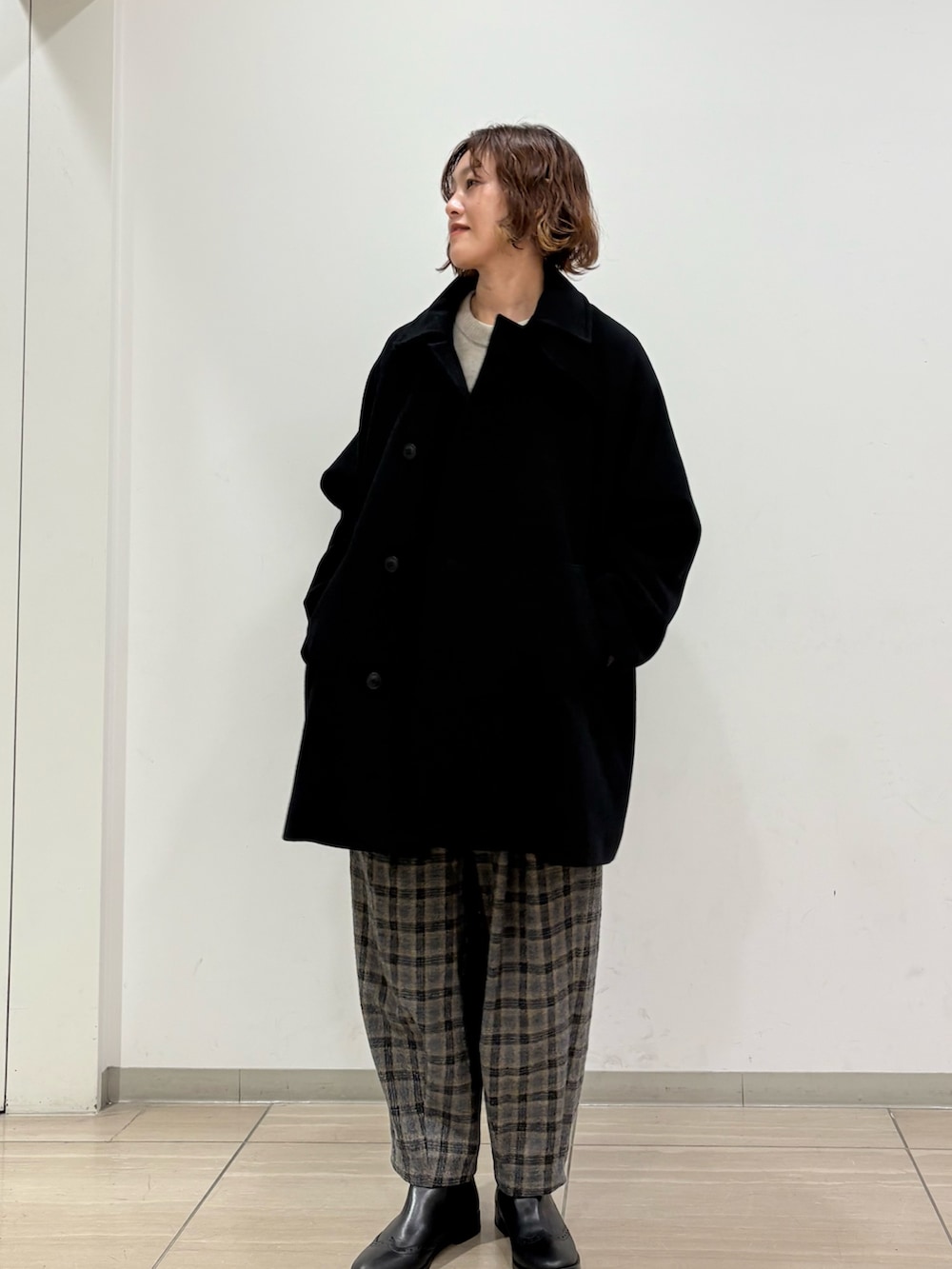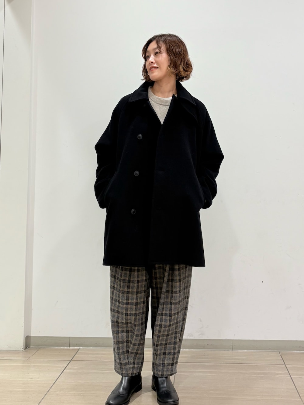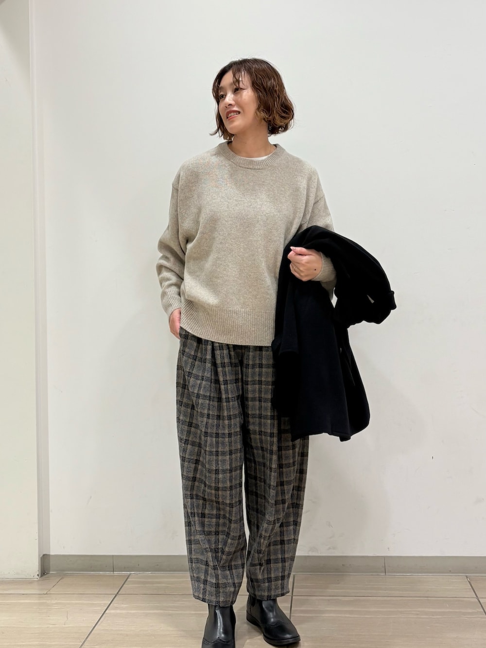 パンツは新入荷のウールコットンチェックパンツです。軽くて薄手ですが、ウール混で裏地もついているので暖かいです。