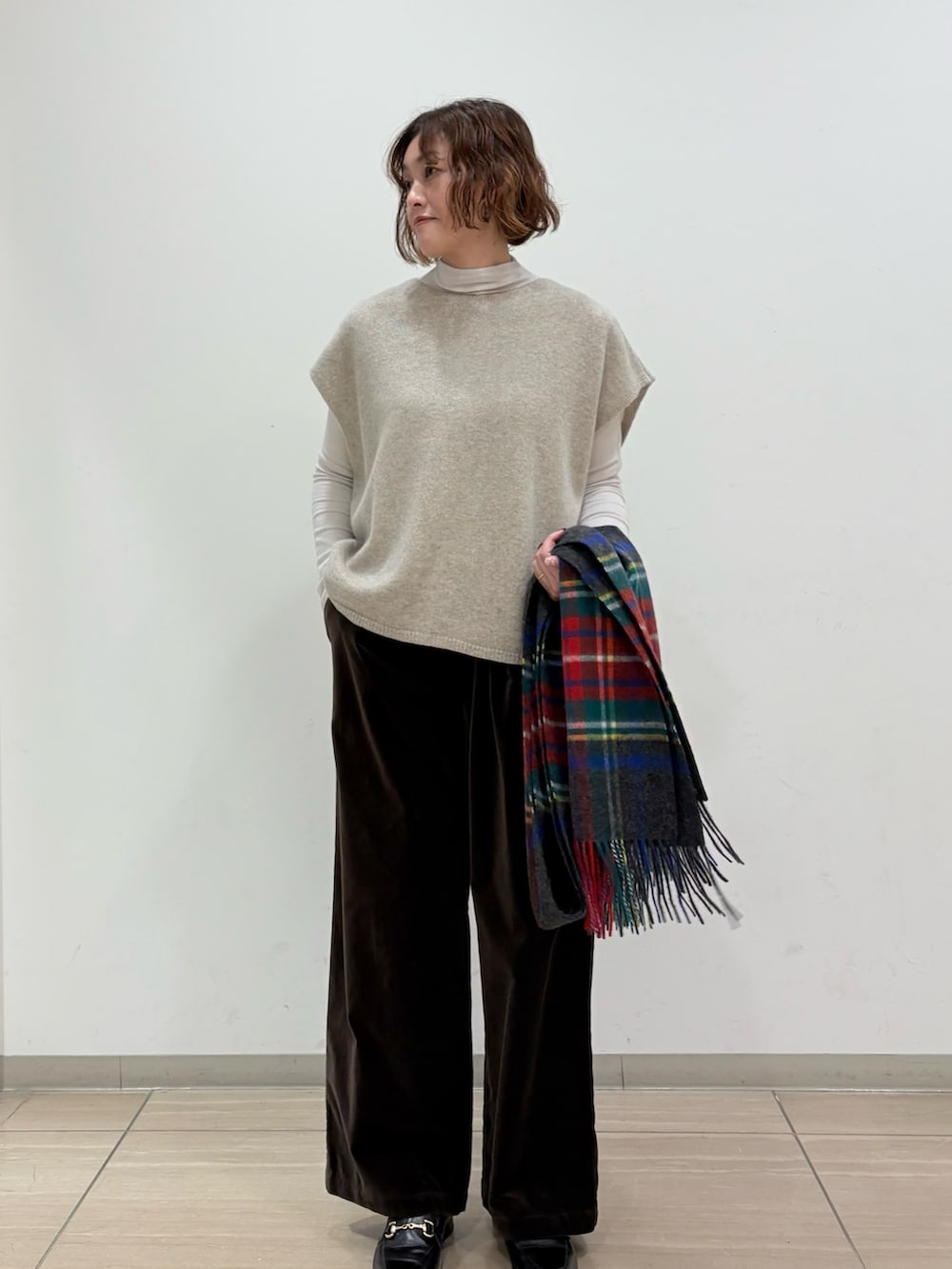 シャツやカットソー、タートルネックニットなど色々合わせて着て頂けるので、着回しがきくアイテムです。