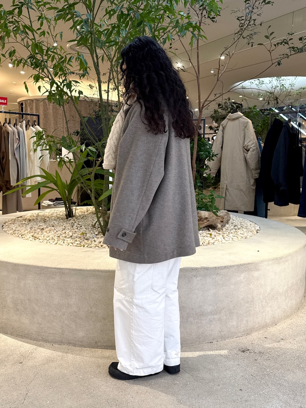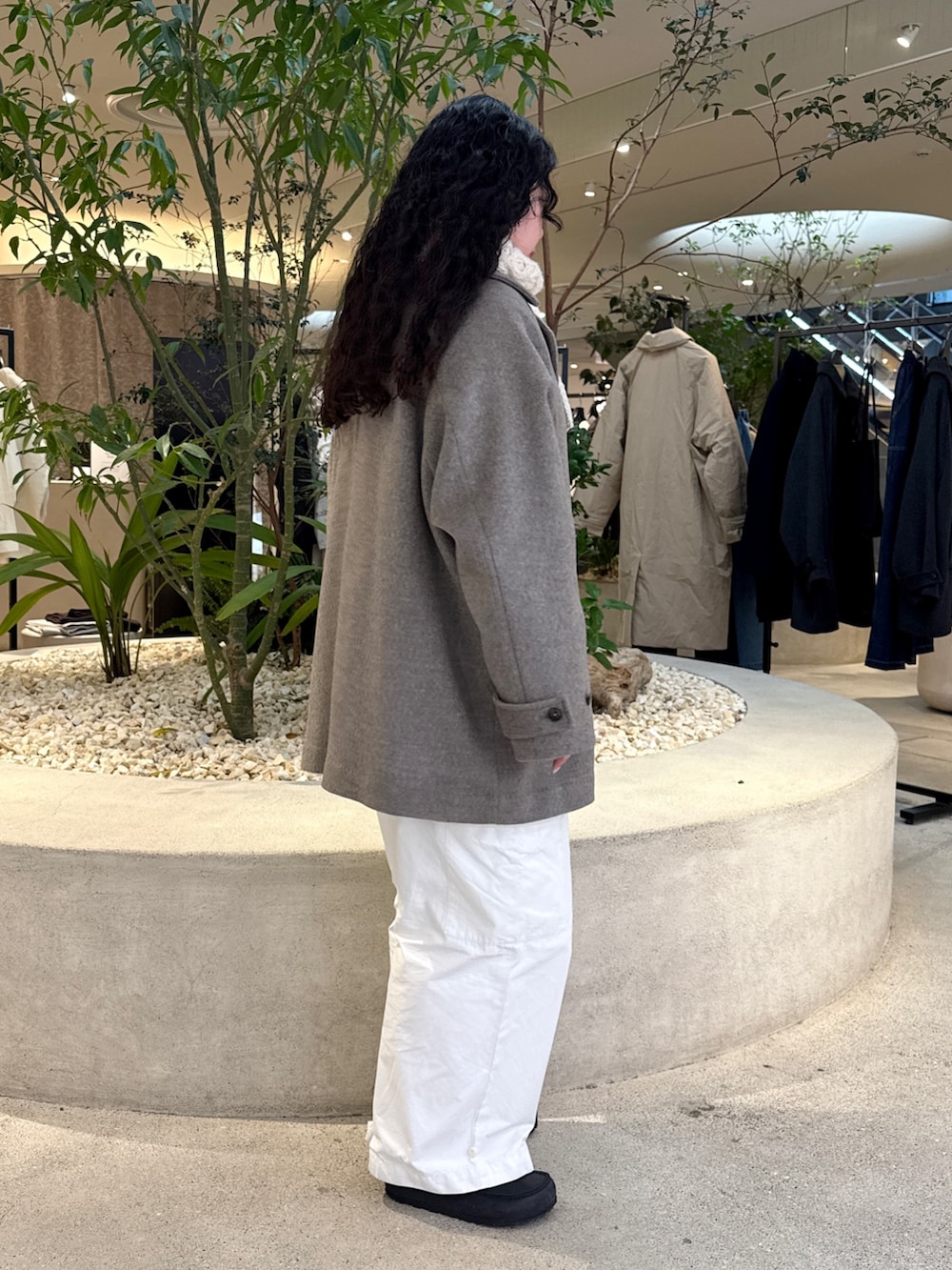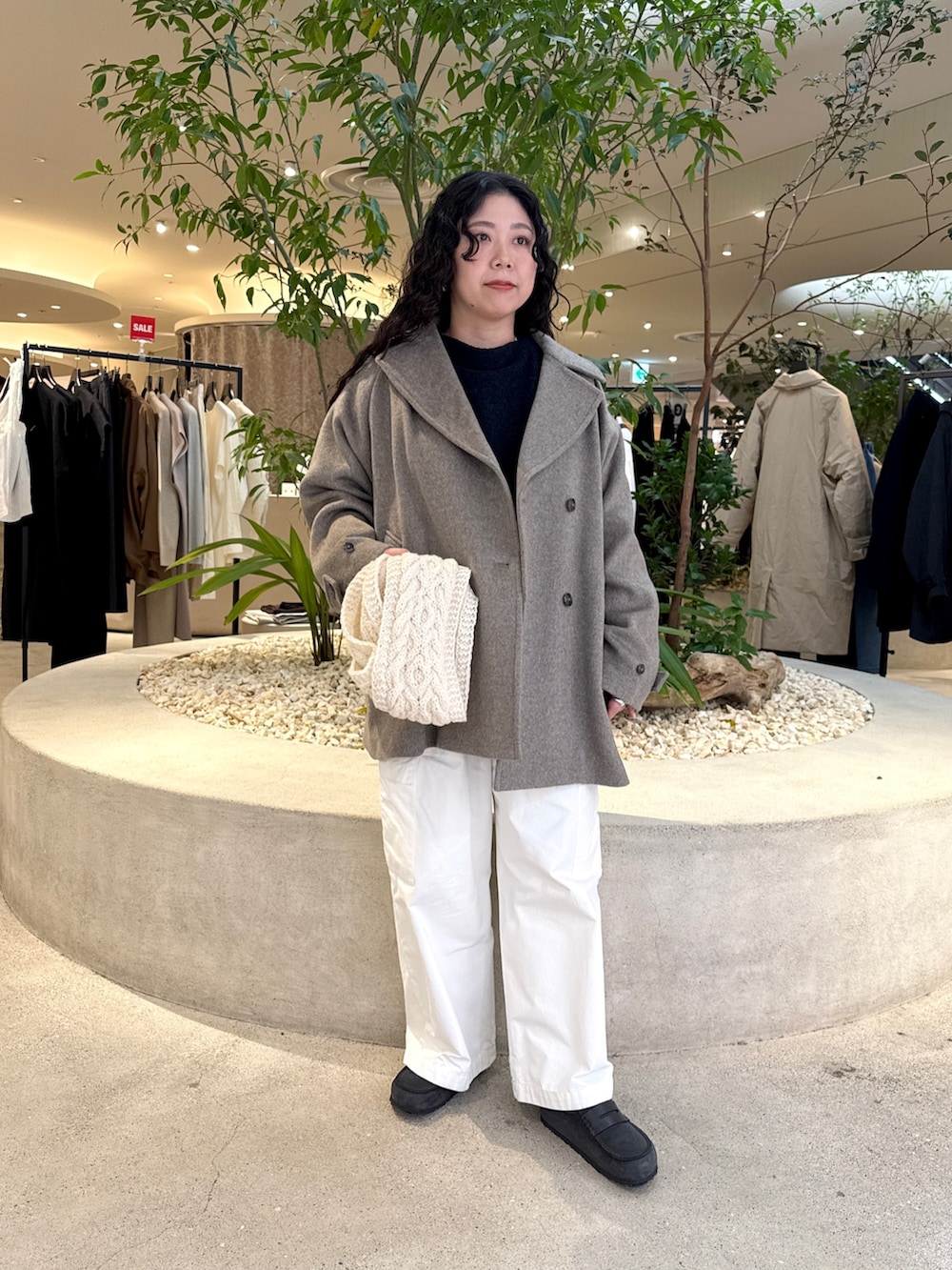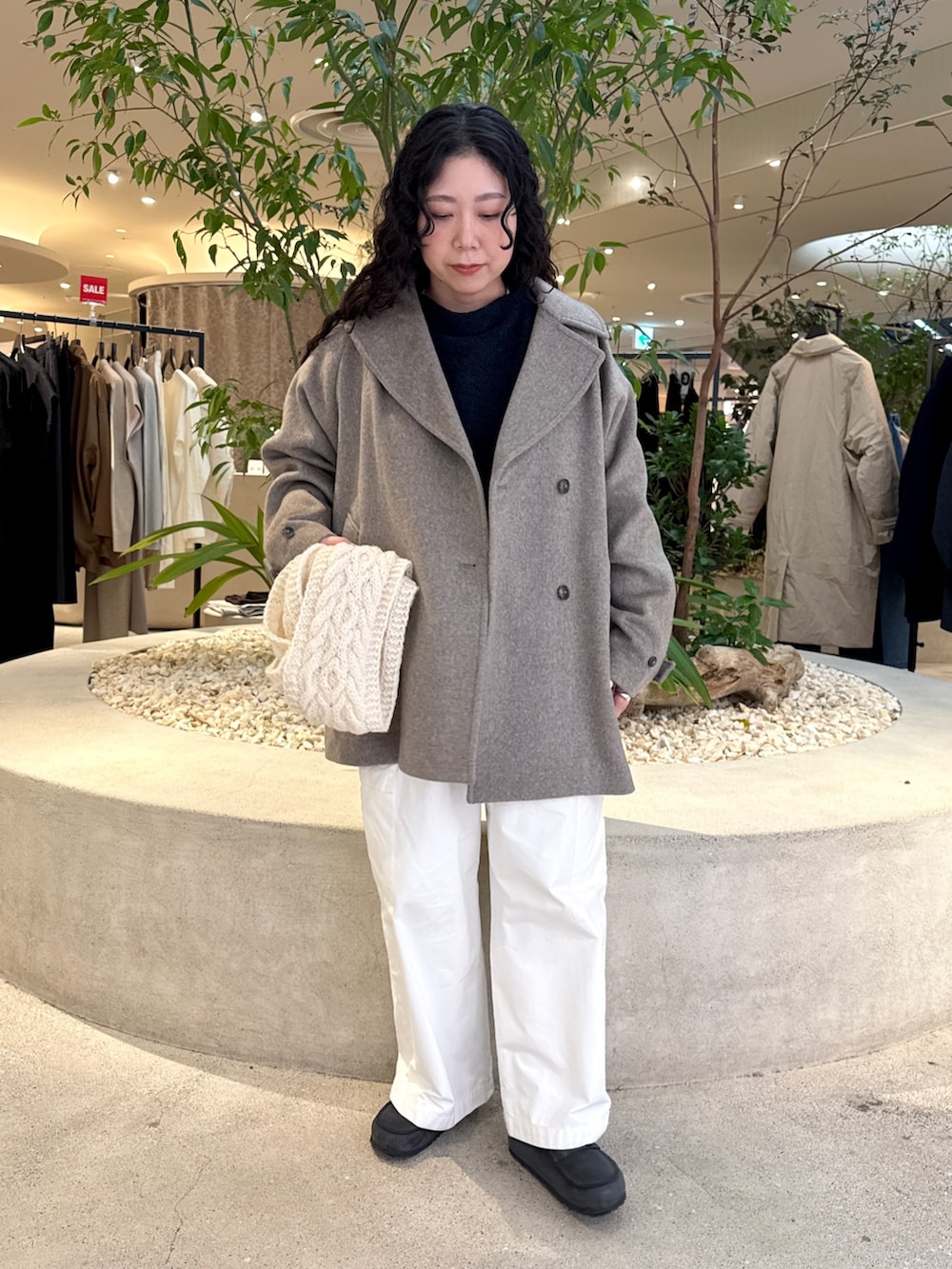 アウターは大人気なウールバックタックショートコートと同素材で、滑らかな手触りがカジュアル見えせずに着ていただけます。