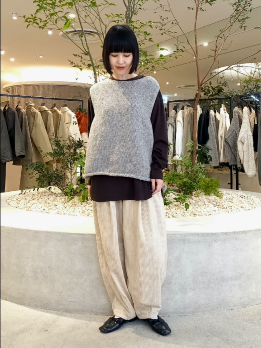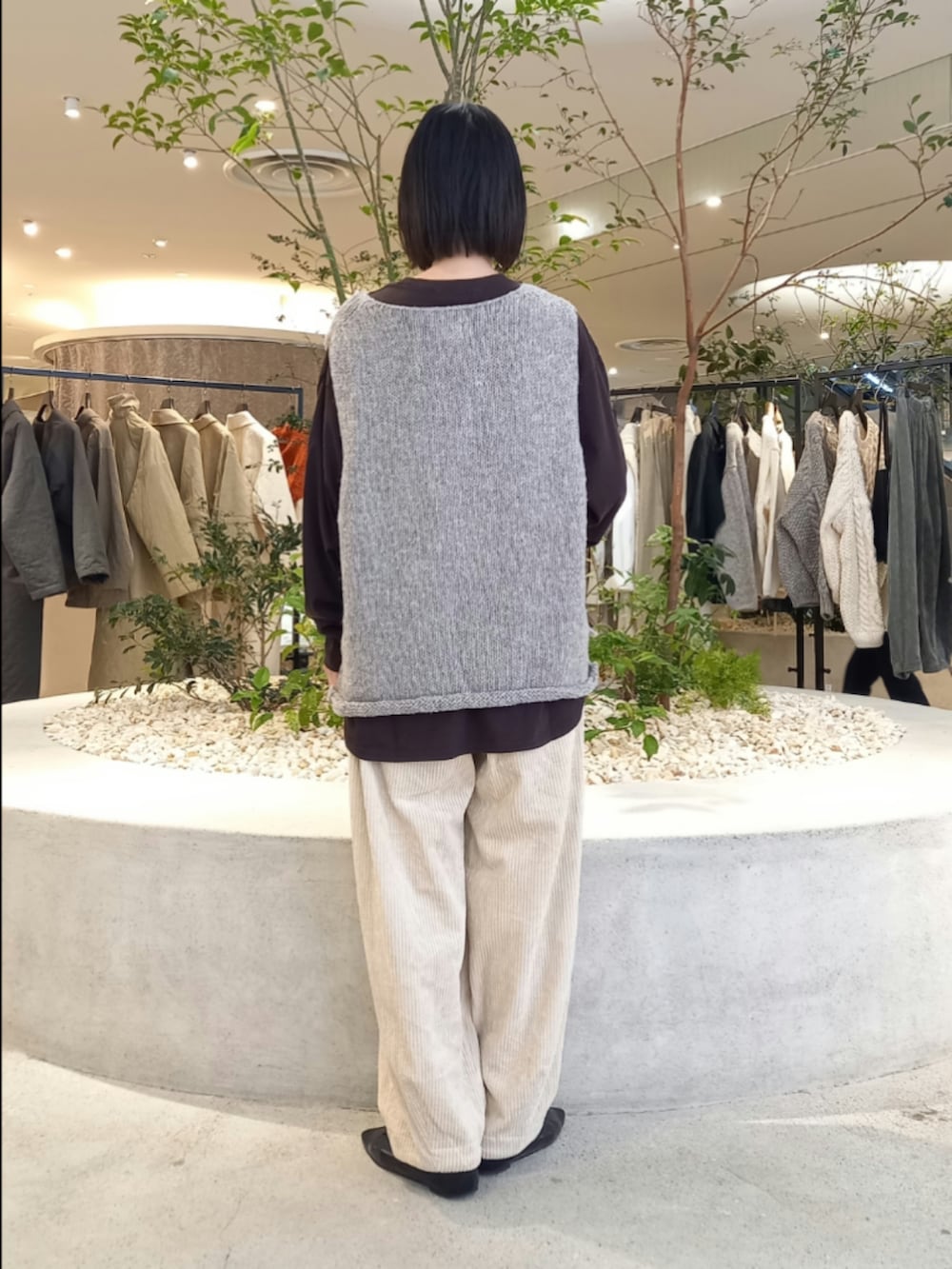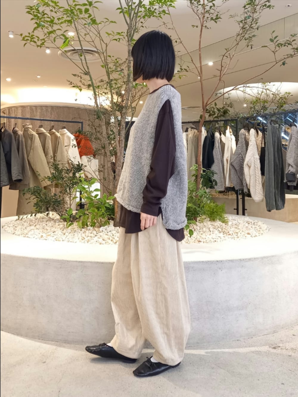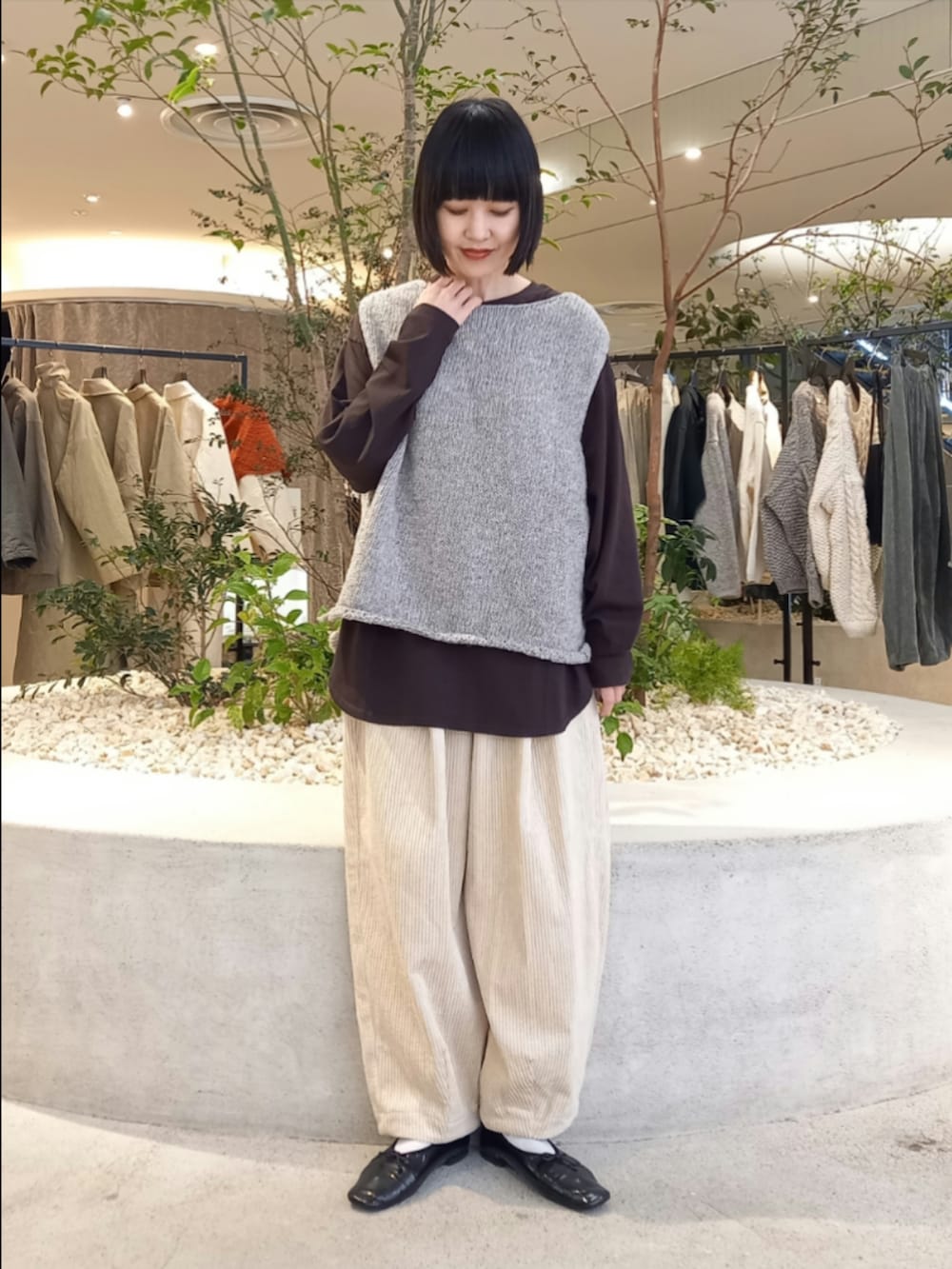 かぐれで定番のペルーニットベストと、新しく入荷したコーデュロイパンツを合わせてみました。