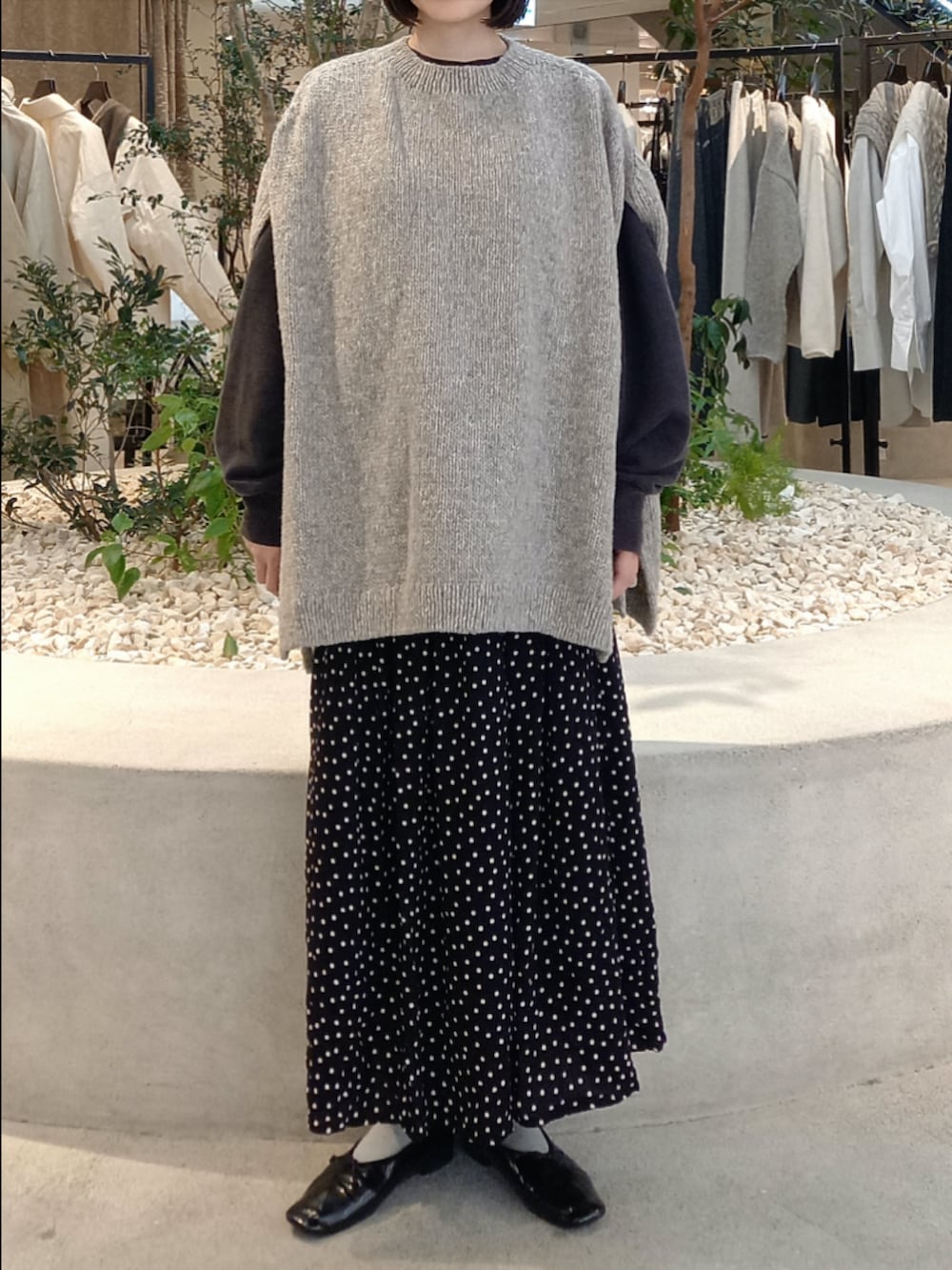 かぐれで定番のコットンリヨセルスウェットに、ニットベストをレイヤード。